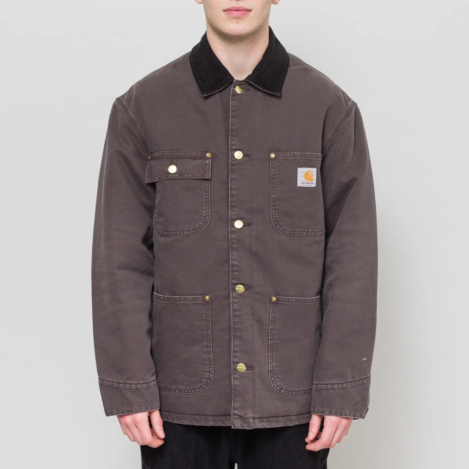 The Chore coat is a staple in the history of workwear and this winterized version from Carhartt WIP is made from a durable outer canvas of 100% organic cotton. This shell provides wind resistance and the lining is diamond-quilted for extra warmth. The jacket has a button-up front leading to a collar with a corduroy trim and it also has buttoned cuffs and four patch pockets, along with an internal pocket. Branding is simple and traditional for Carhartt, with a woven logo patch to the chest.