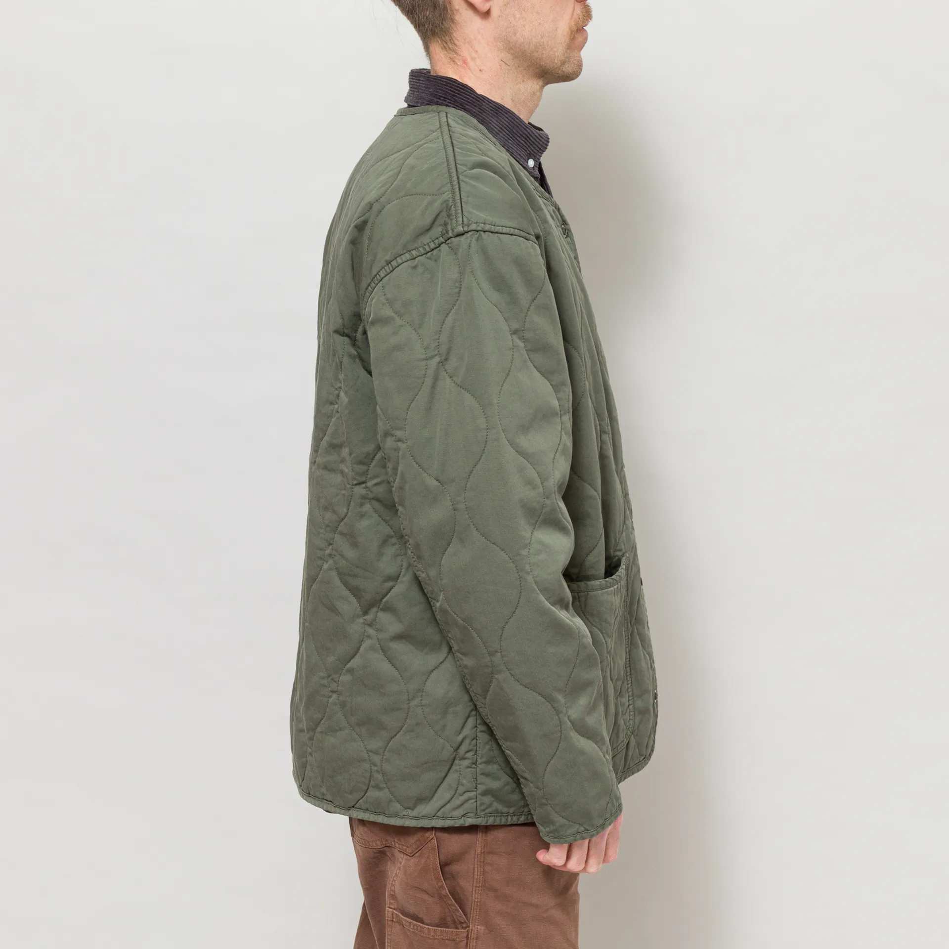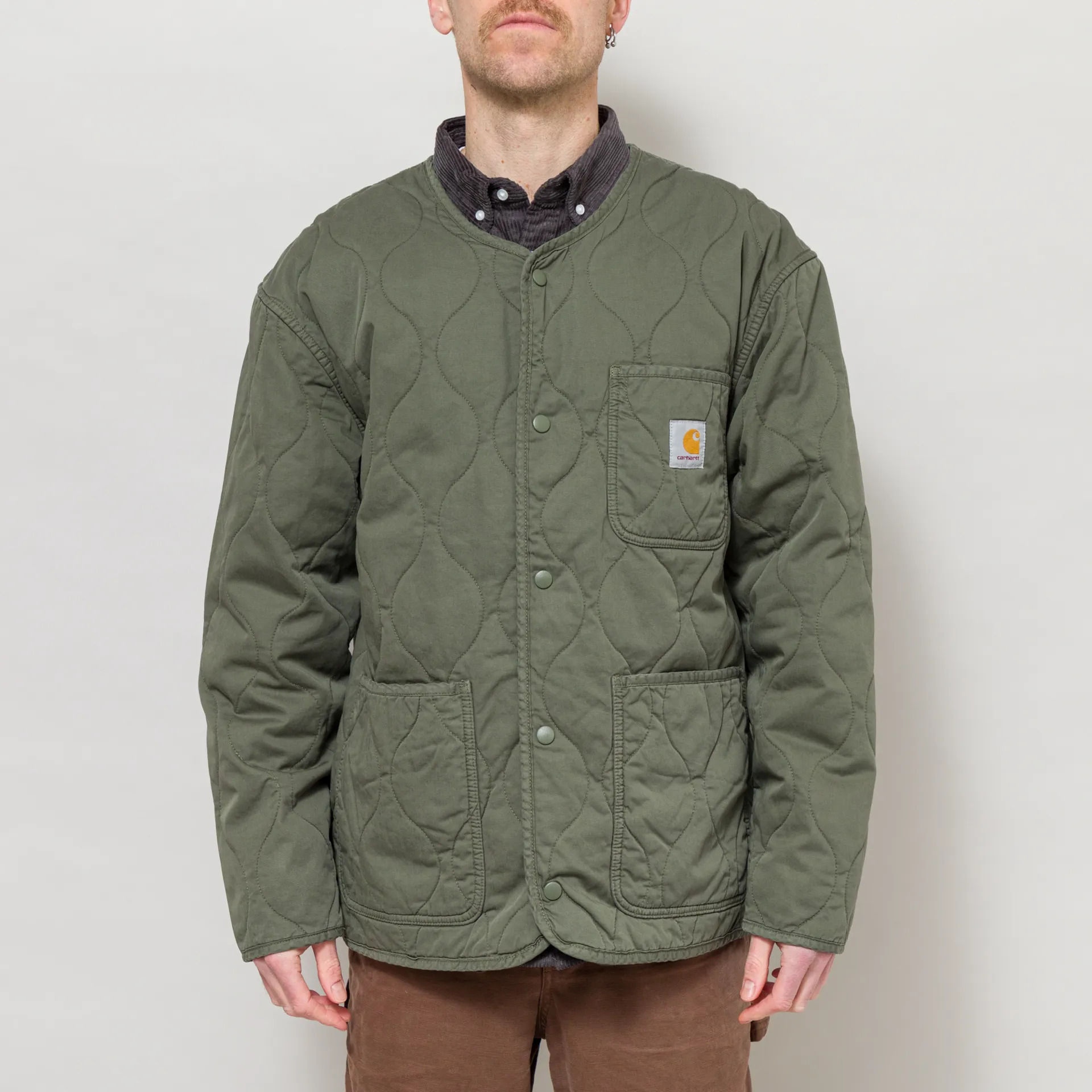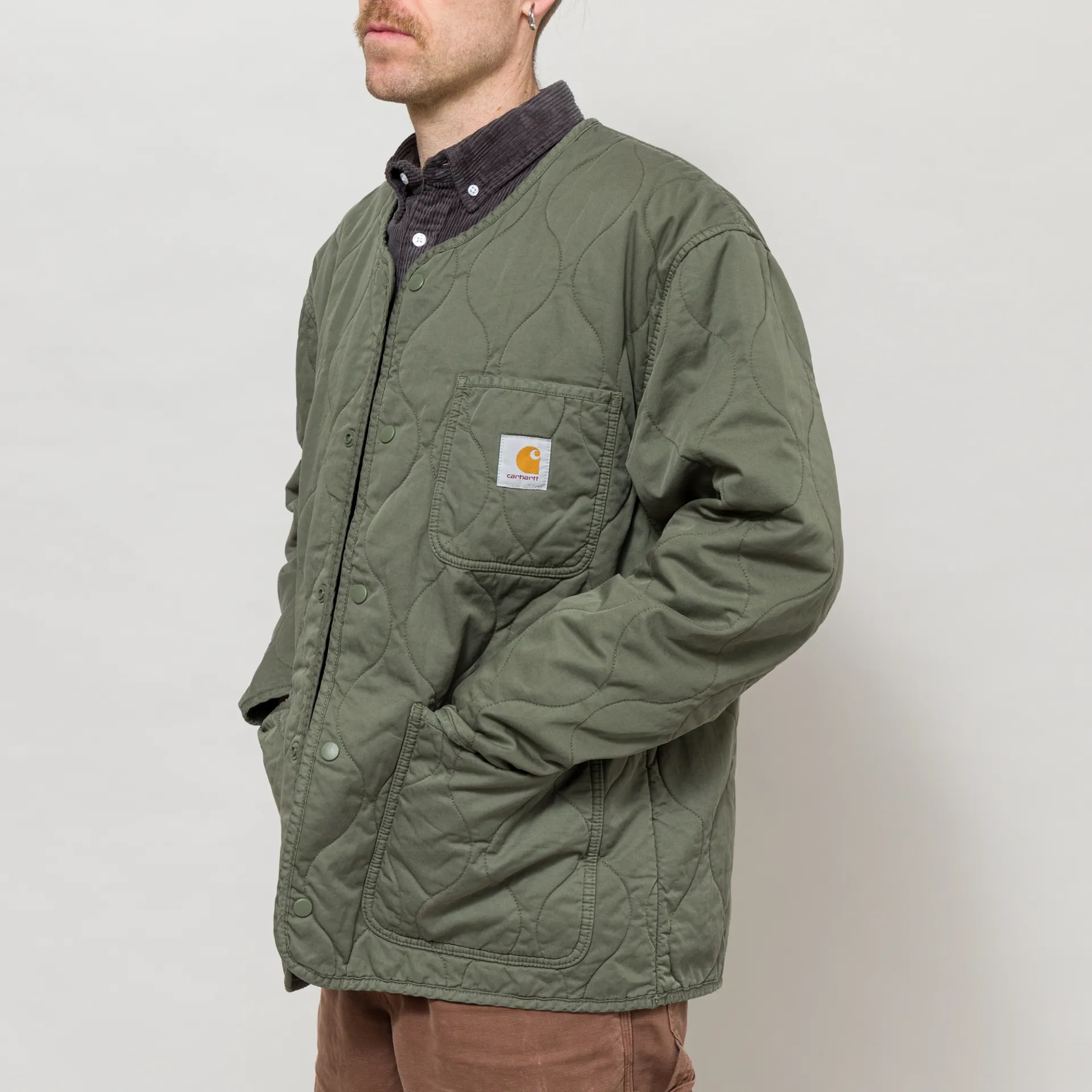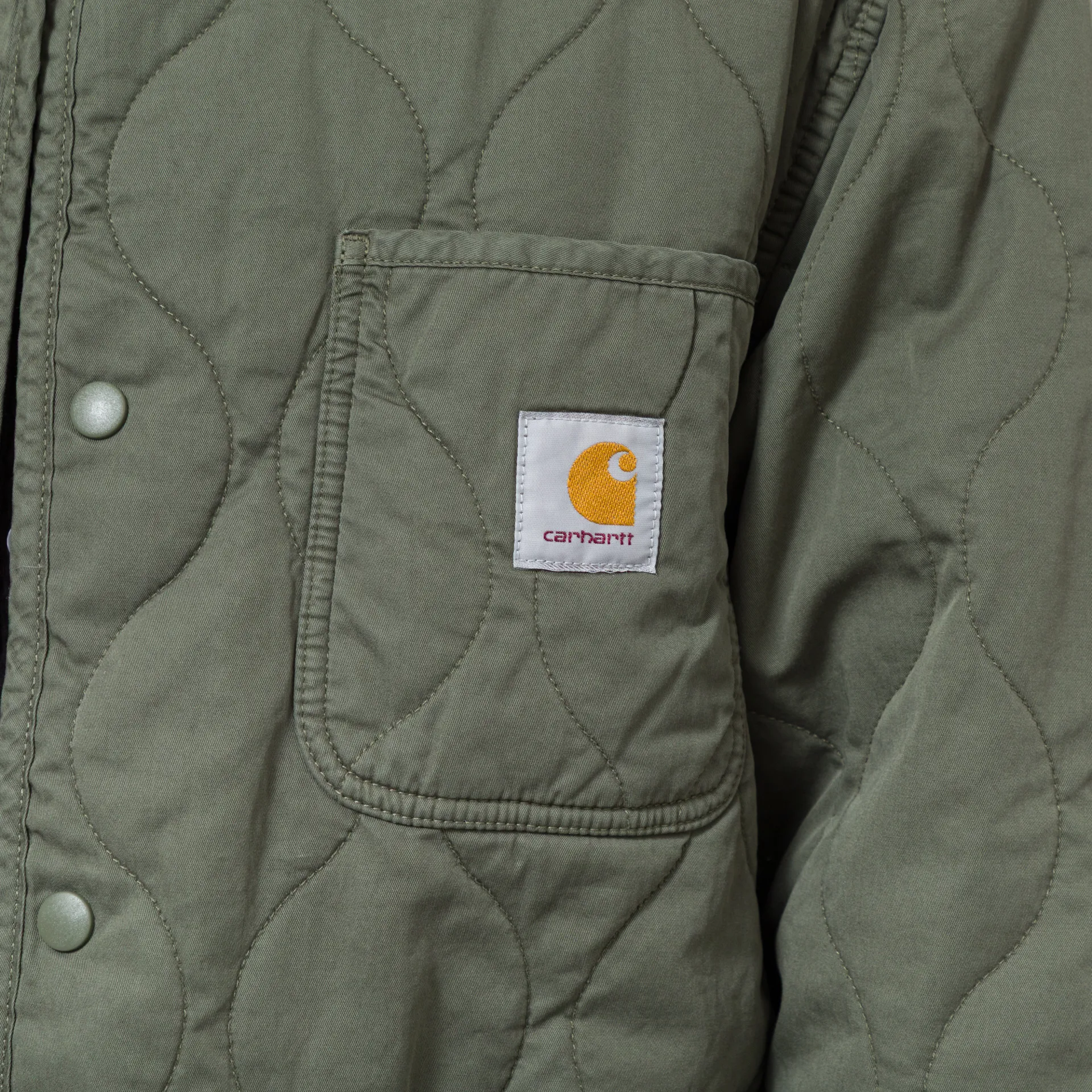 The Skyton Liner from Carhartt WIP is cut in a relaxed fit for a casual silhouette and constructed from soft cotton twill with an onion-quilted lining. Featuring a snap-button placket which leads to a collarless neckline, with tonal binding throughout. It's finished off with two large lower patch pockets and a single patch pocket at the chest displaying the woven Square Label.