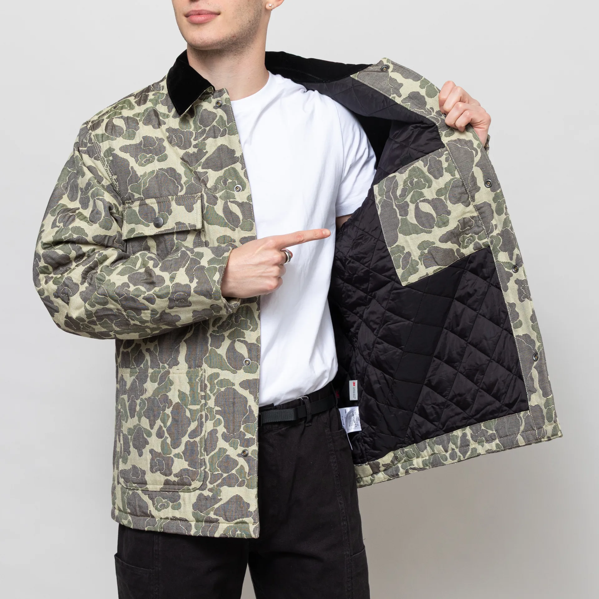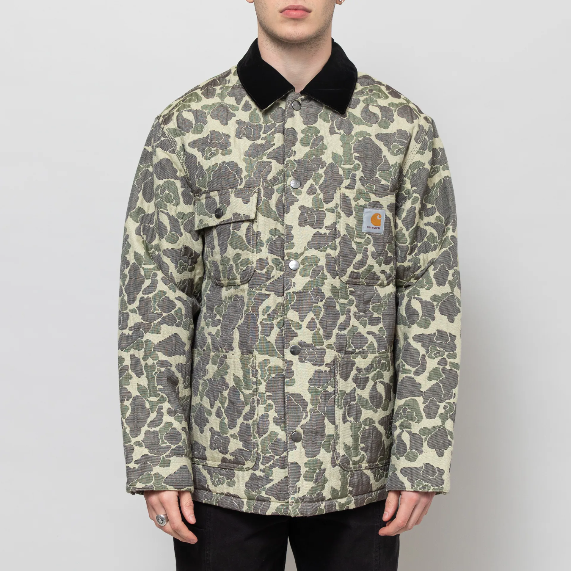 The Tapestry Chore Coat from Carhartt WIP is constructed from a midweight cotton-blend fabric with an all-over camo jacquard design. It's cut in a relaxed fit for easy layering and features a full button-through front, leading up to a contrast velvet collar, with buttoned cuffs and a straight hem. With a diamond-quilted lining for comfort, a single internal chest pocket and four front pockets, one with flap and button closure. The design is complete with the classic Carhartt Square Label at the chest.