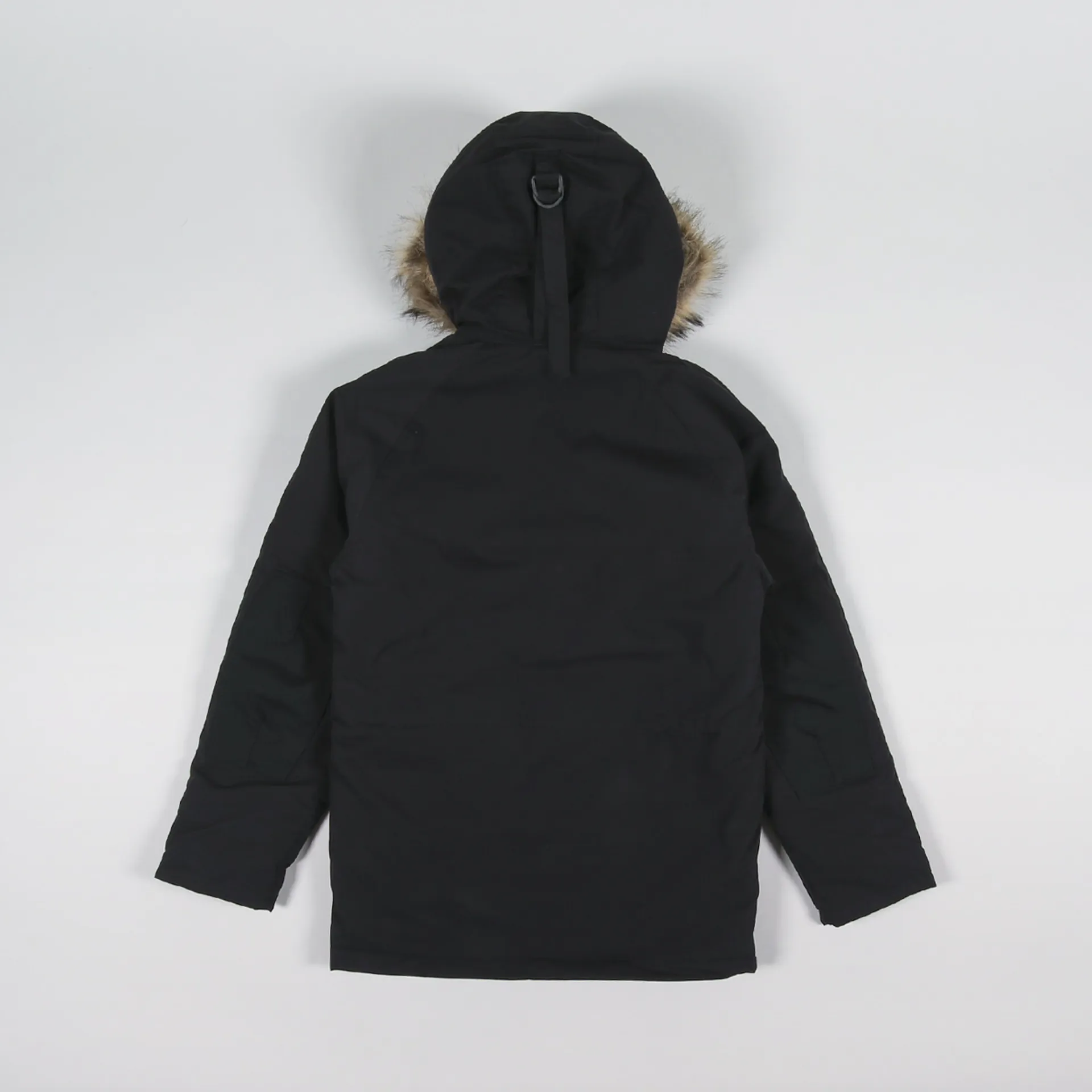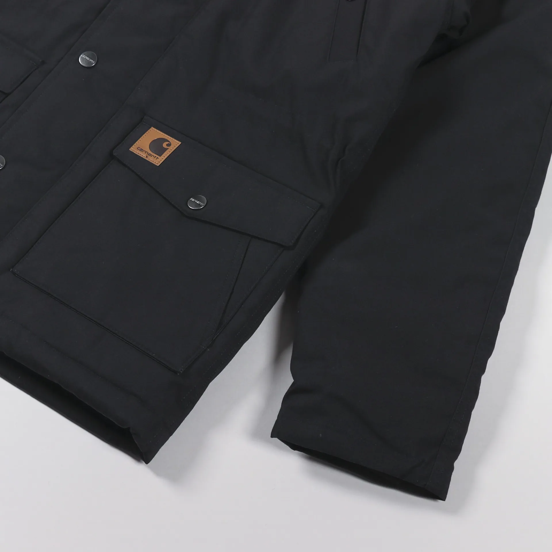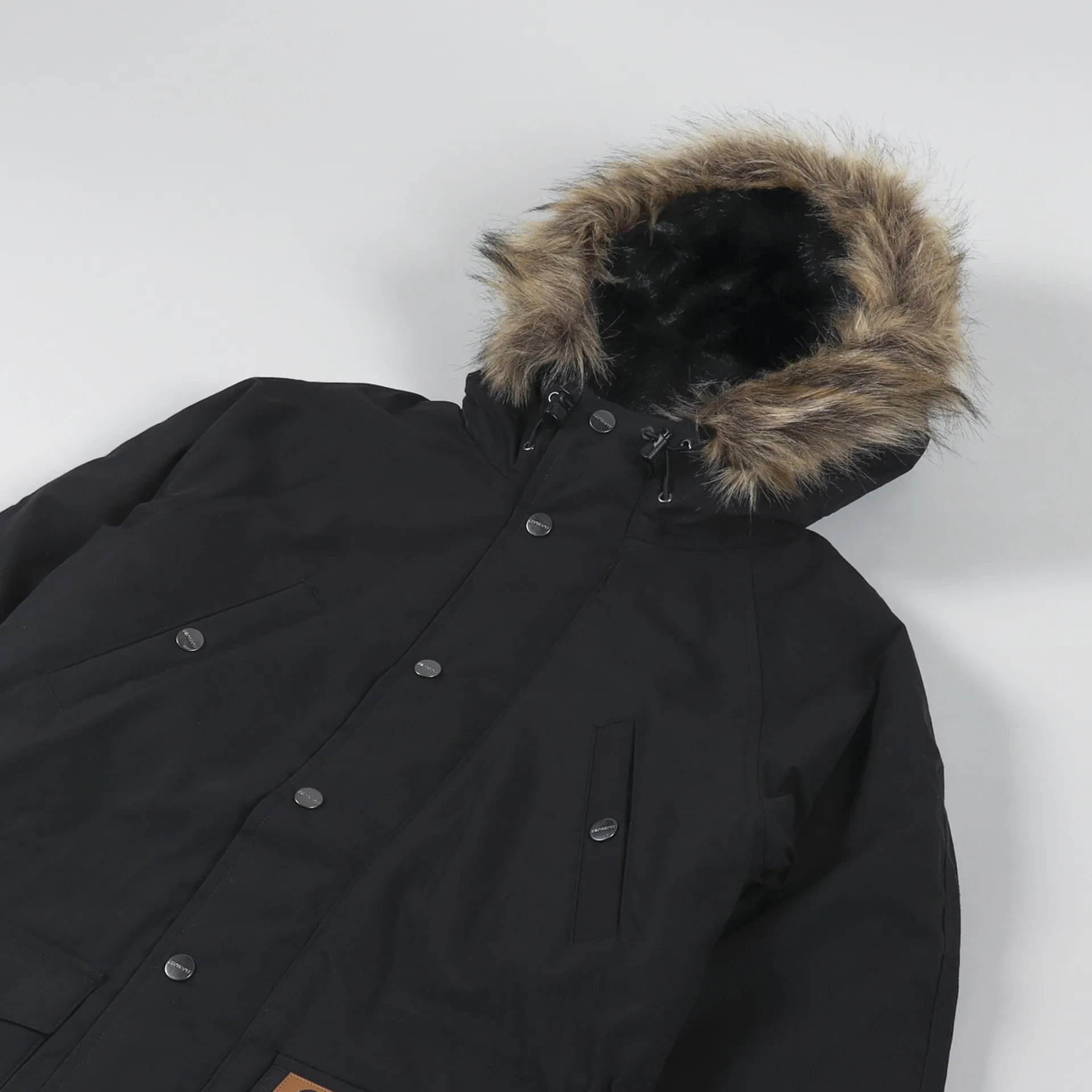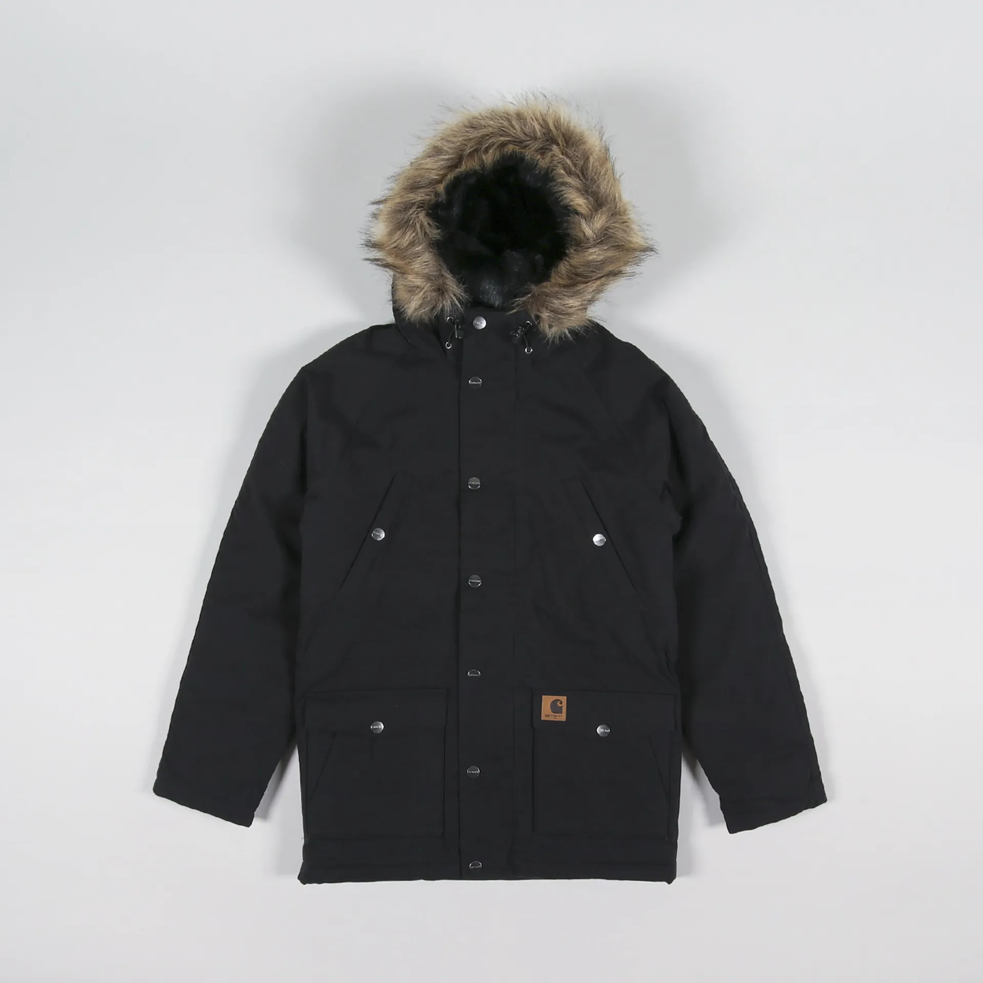 A winter parka from Carhartt WIP made from a weather-resistant poplin blend of 65% polyester and 35% cotton with a nylon taffeta lining and a low-profile synthetic insulation, along faux fur to the hood lining and removable trim.