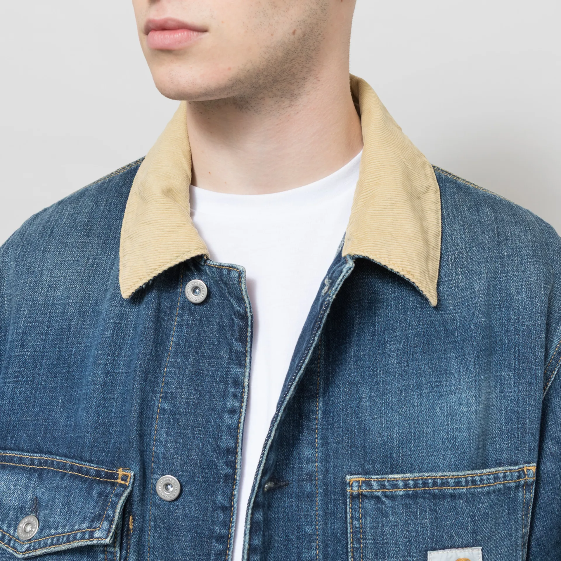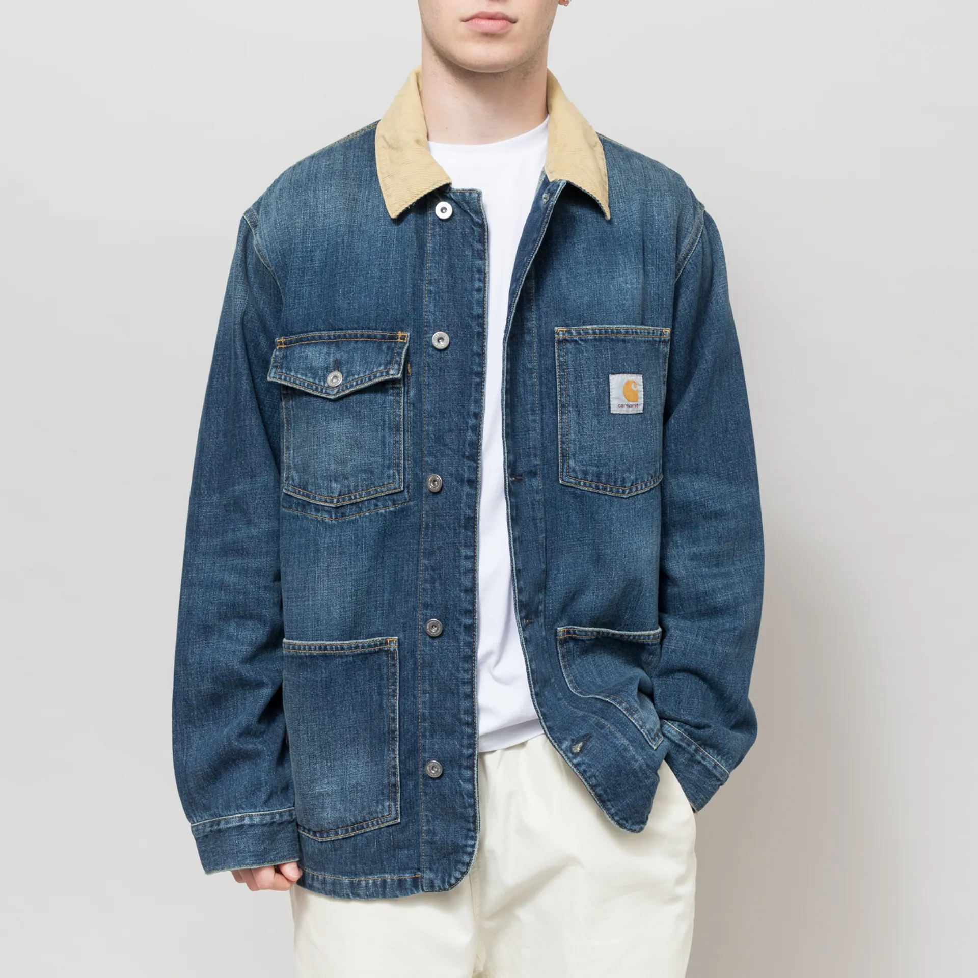 The Warren Chore Coat from Carhartt WIP is based on a utilitarian silhouette and is constructed from unlined, heavyweight cotton denim and cut in a relaxed fit for a casual look. Featuring a full button-through front, leading to a contrast corduroy collar, with buttons at the cuffs to adjust and triple-stitched details for extra durability. It has four front pockets, one with a flap and button closure and one displaying the signature woven Square Label.