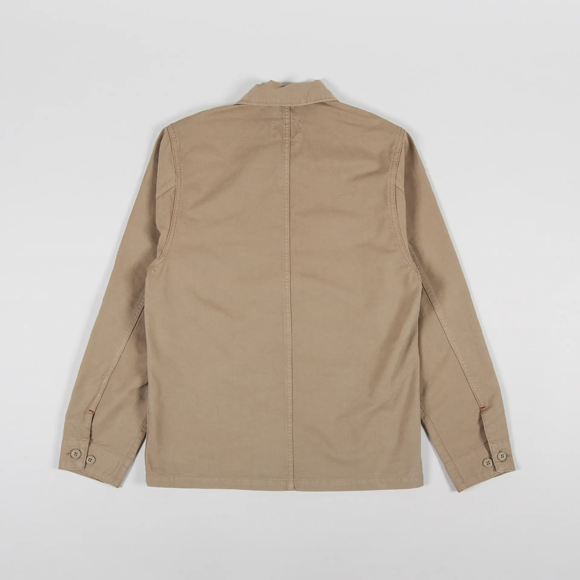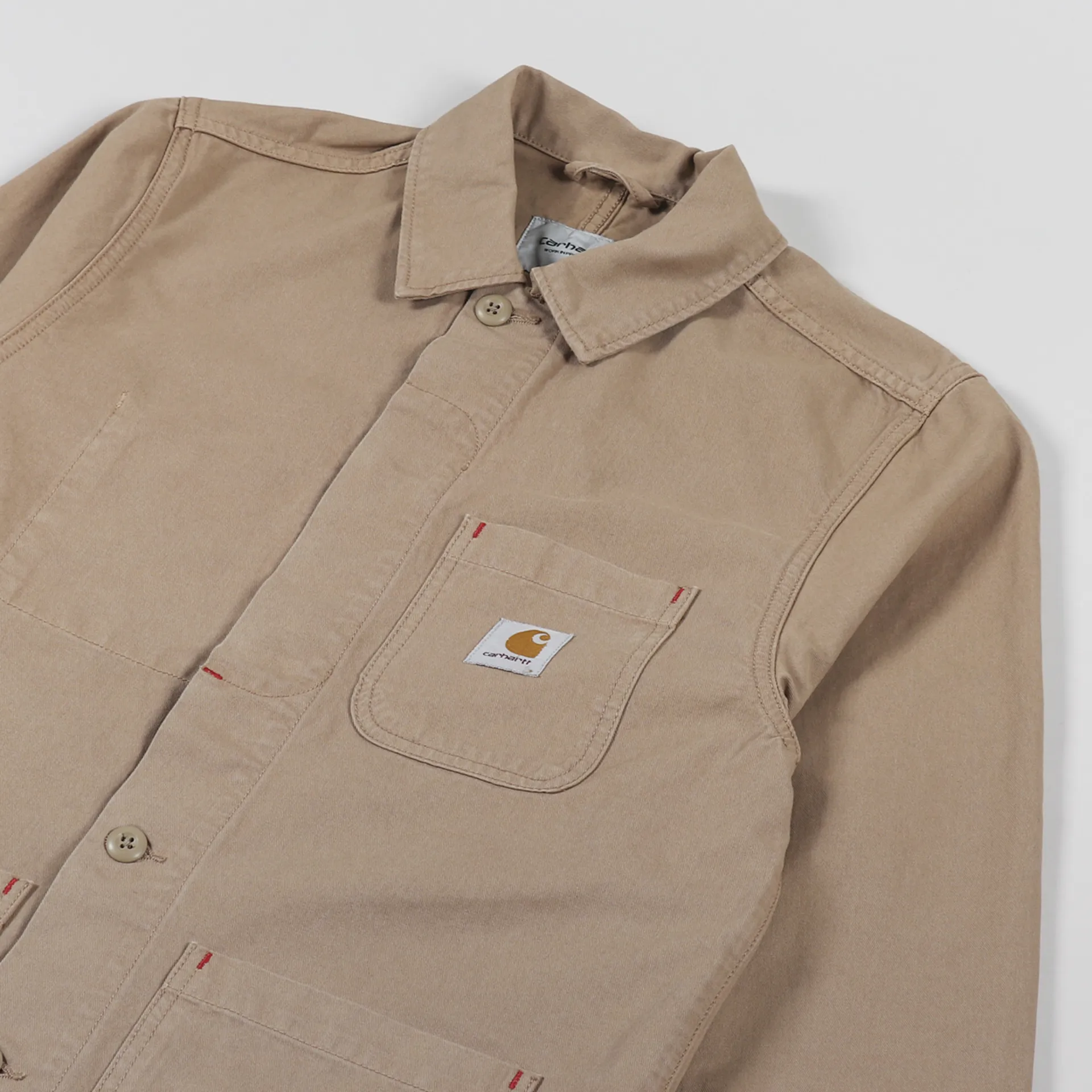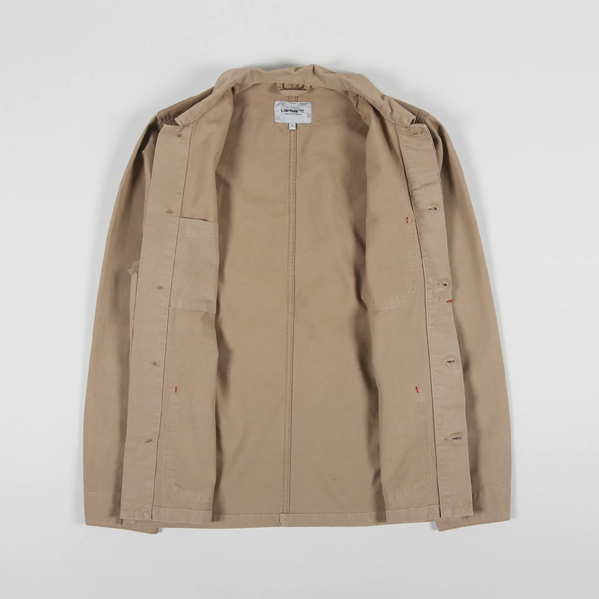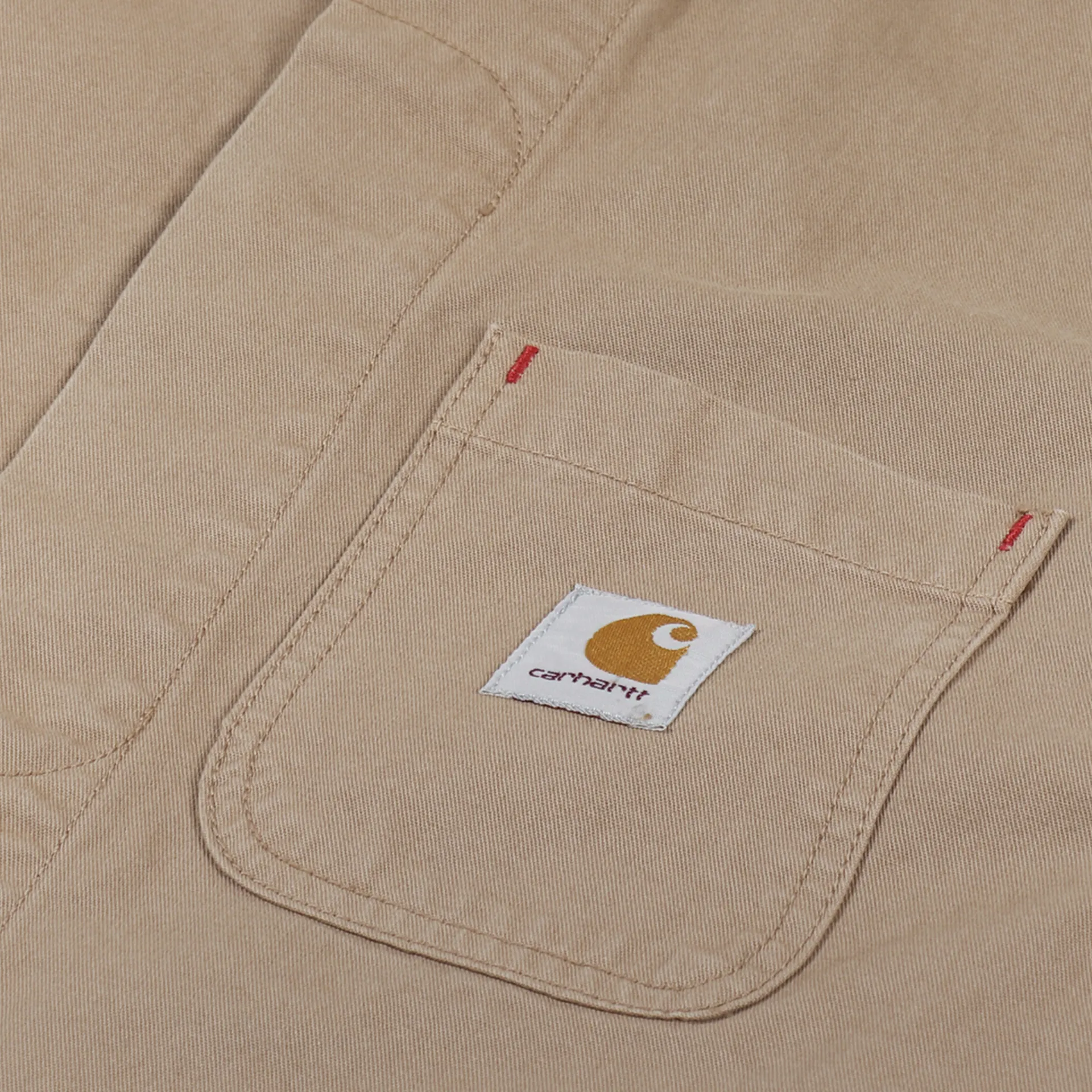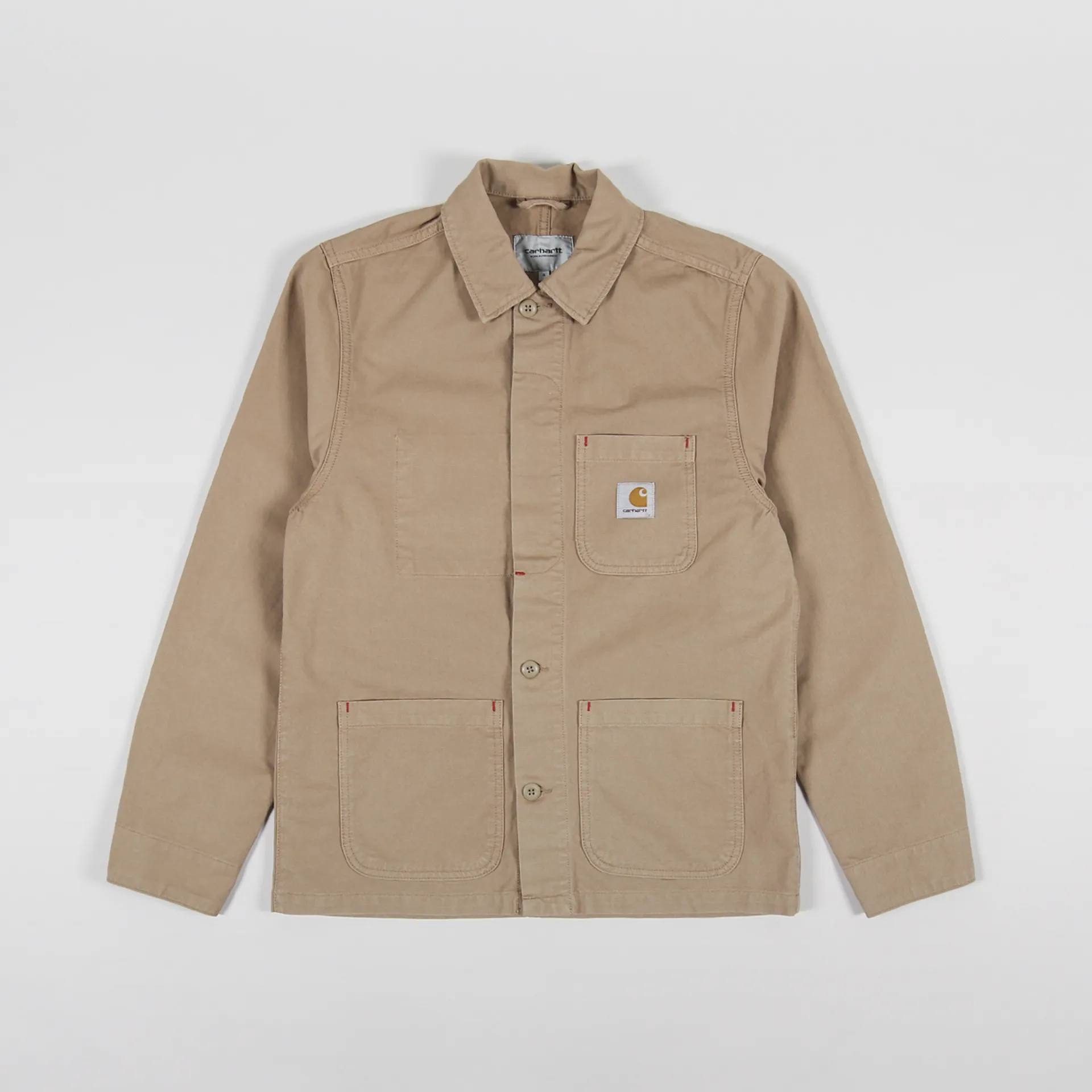 It has bartack stitching at vital stresspoints, buttoned cuffs and a buttoned front with a hidden placket. The jacket has three patch pockets to the outside and a fourth inside, along with a woven logo patch for classic Carhartt branding.