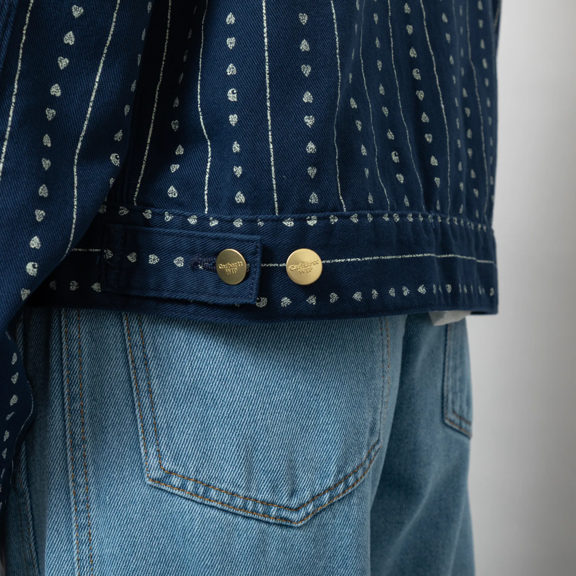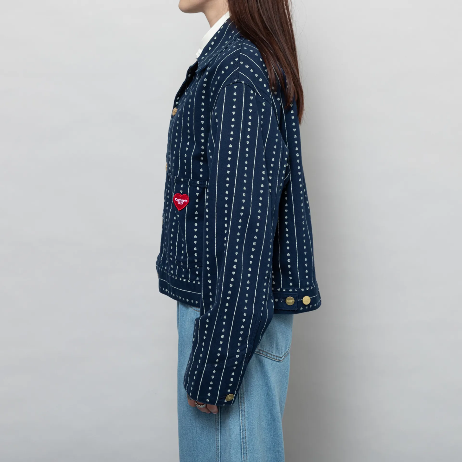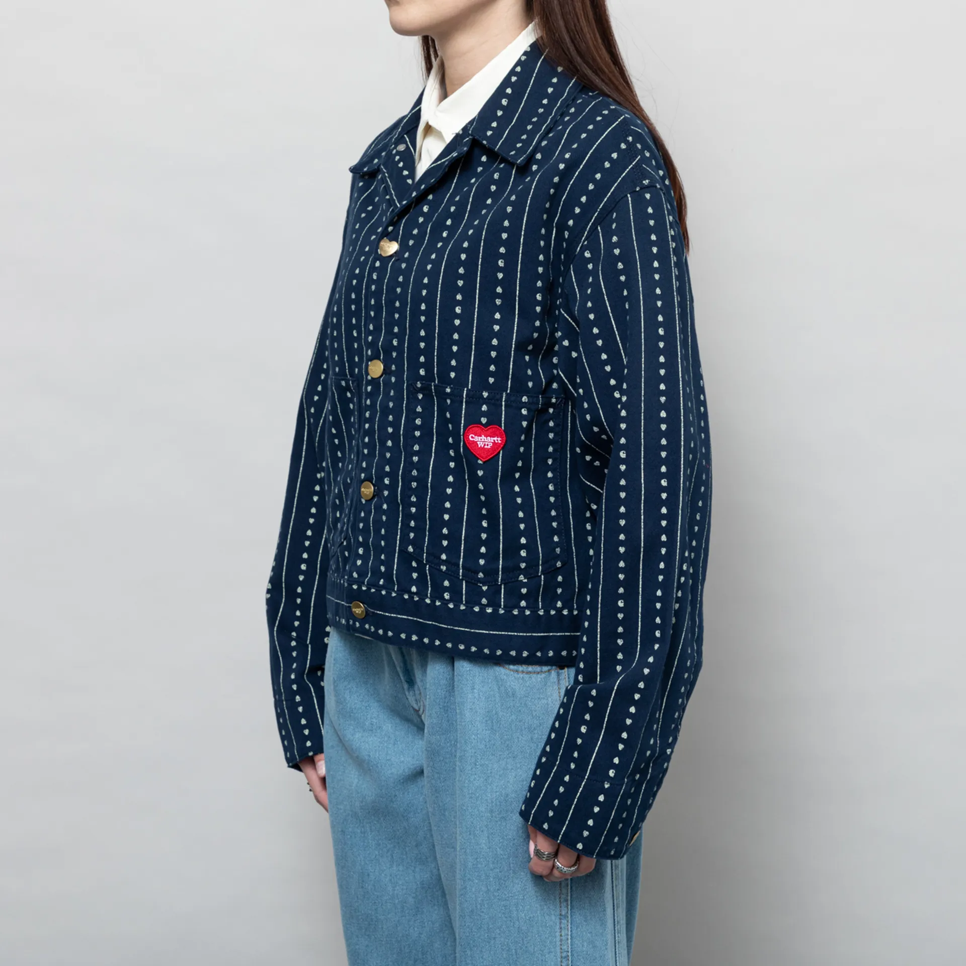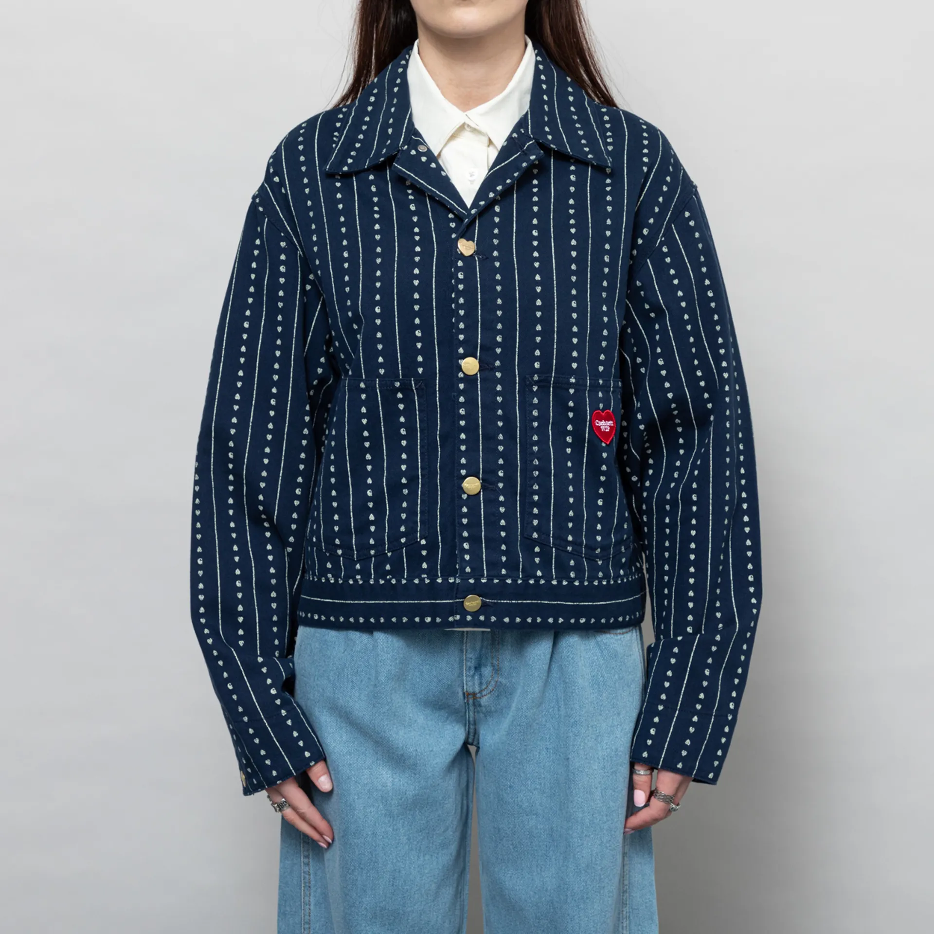 The Drewe Jacket from Carhartt WIP womenswear collection has been cut in a relaxed, boxy fit with a dropped shoulder and an all-over Heart C Pinstripe print. It has been constructed from unlined, midweight cotton twill with tripe-stitched details. It features a button-through front, with a single heart-shaped button and adjustable buttons at the hem and cuffs. The design is complete with two patch pockets to the front and a lovely little embroidered Carhartt WIP heart patch.