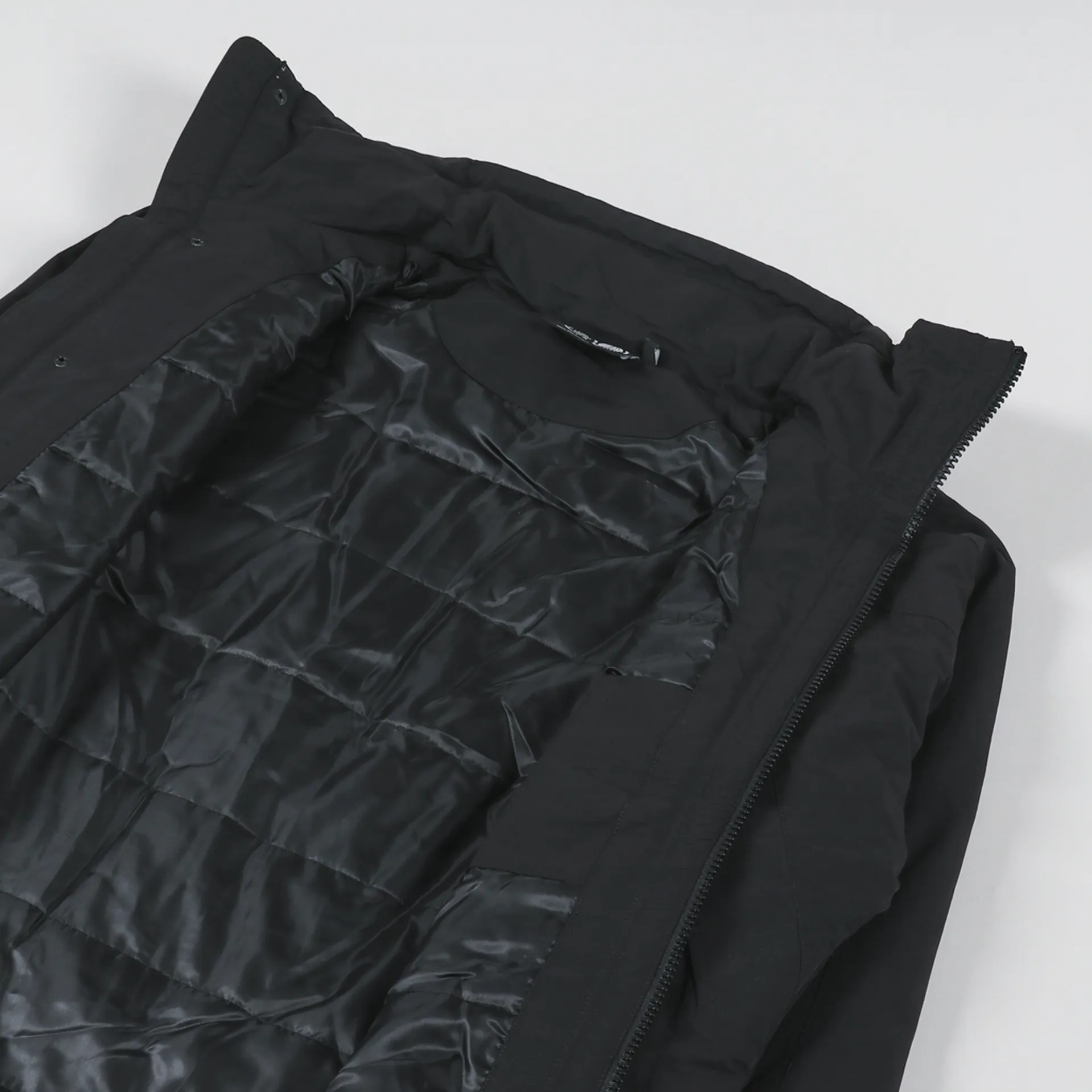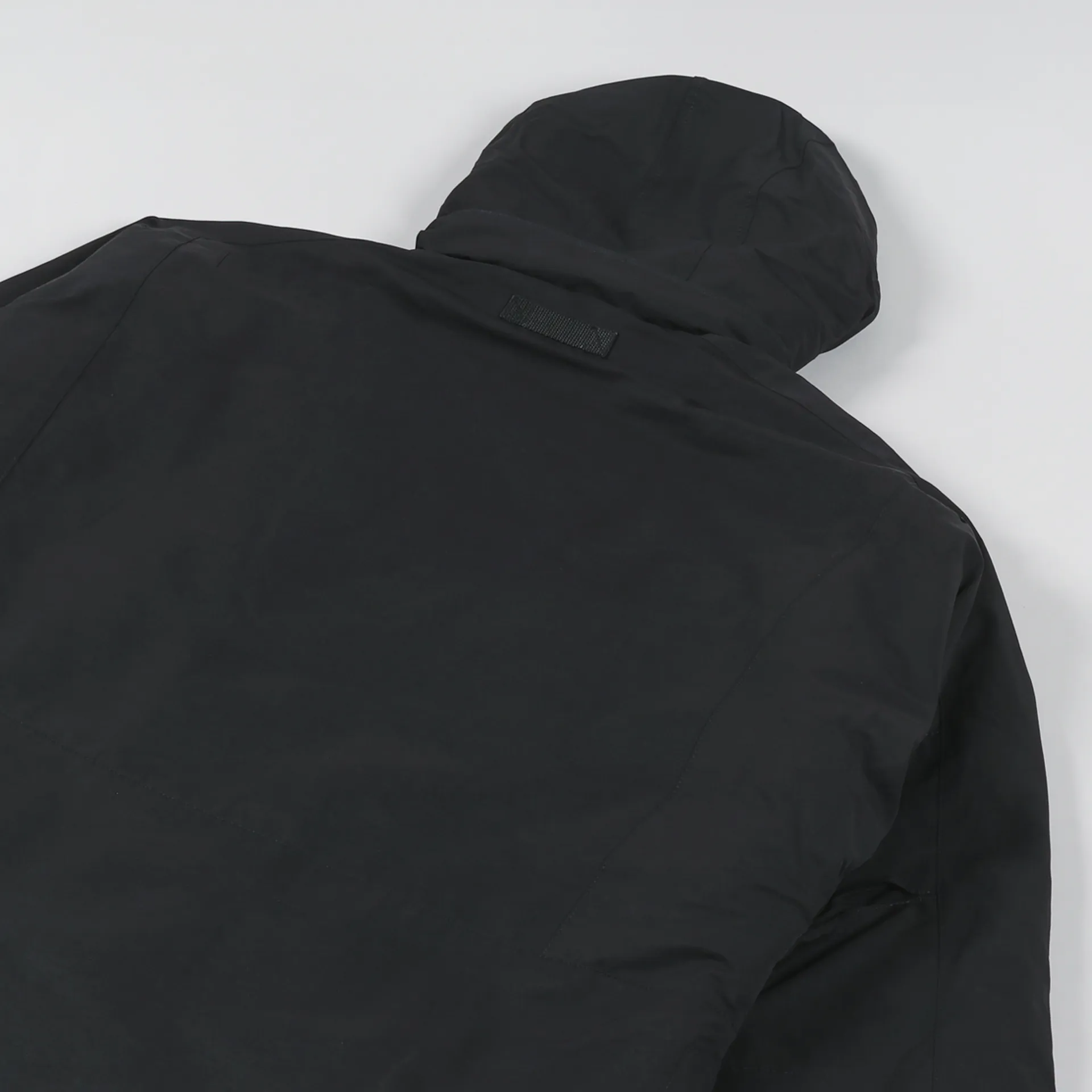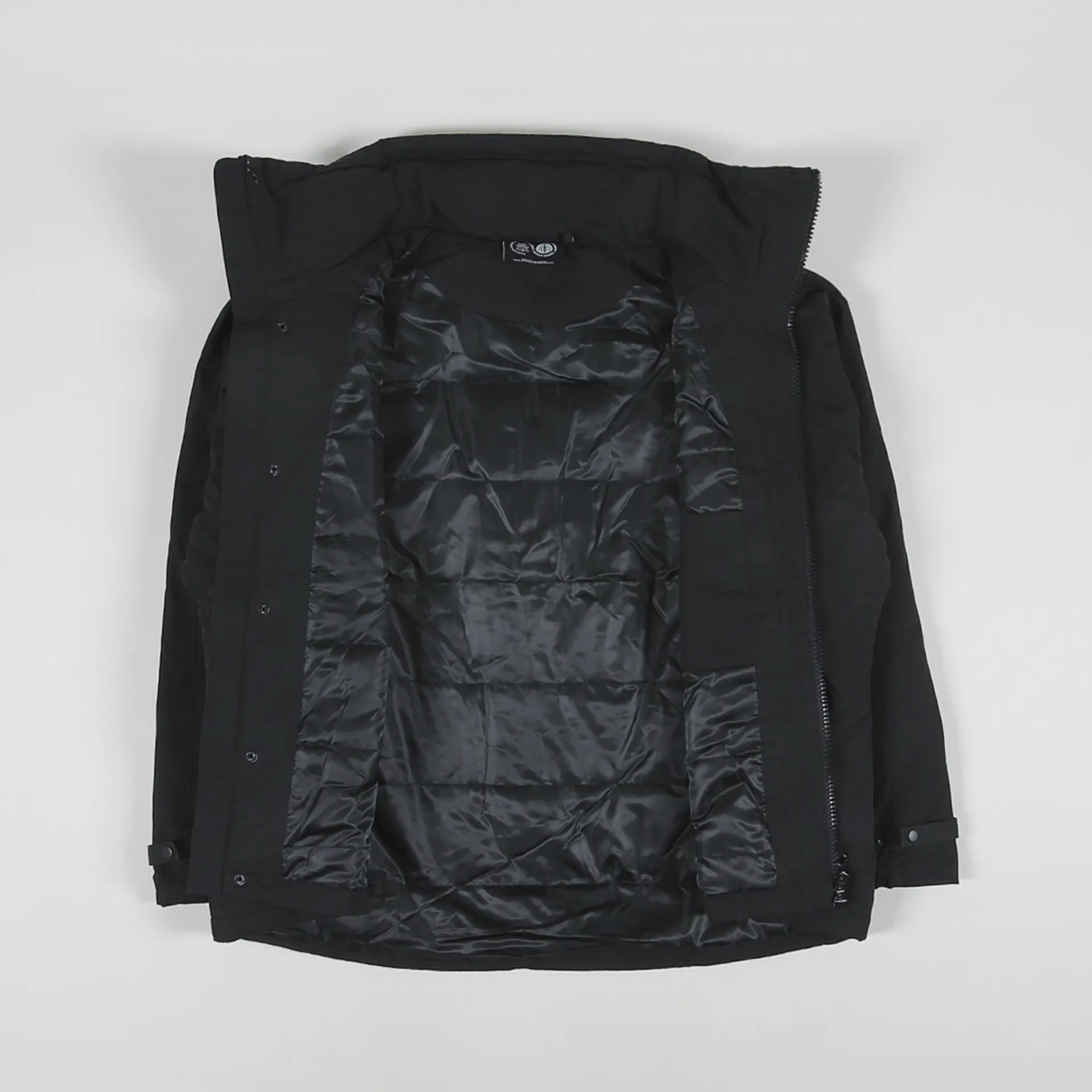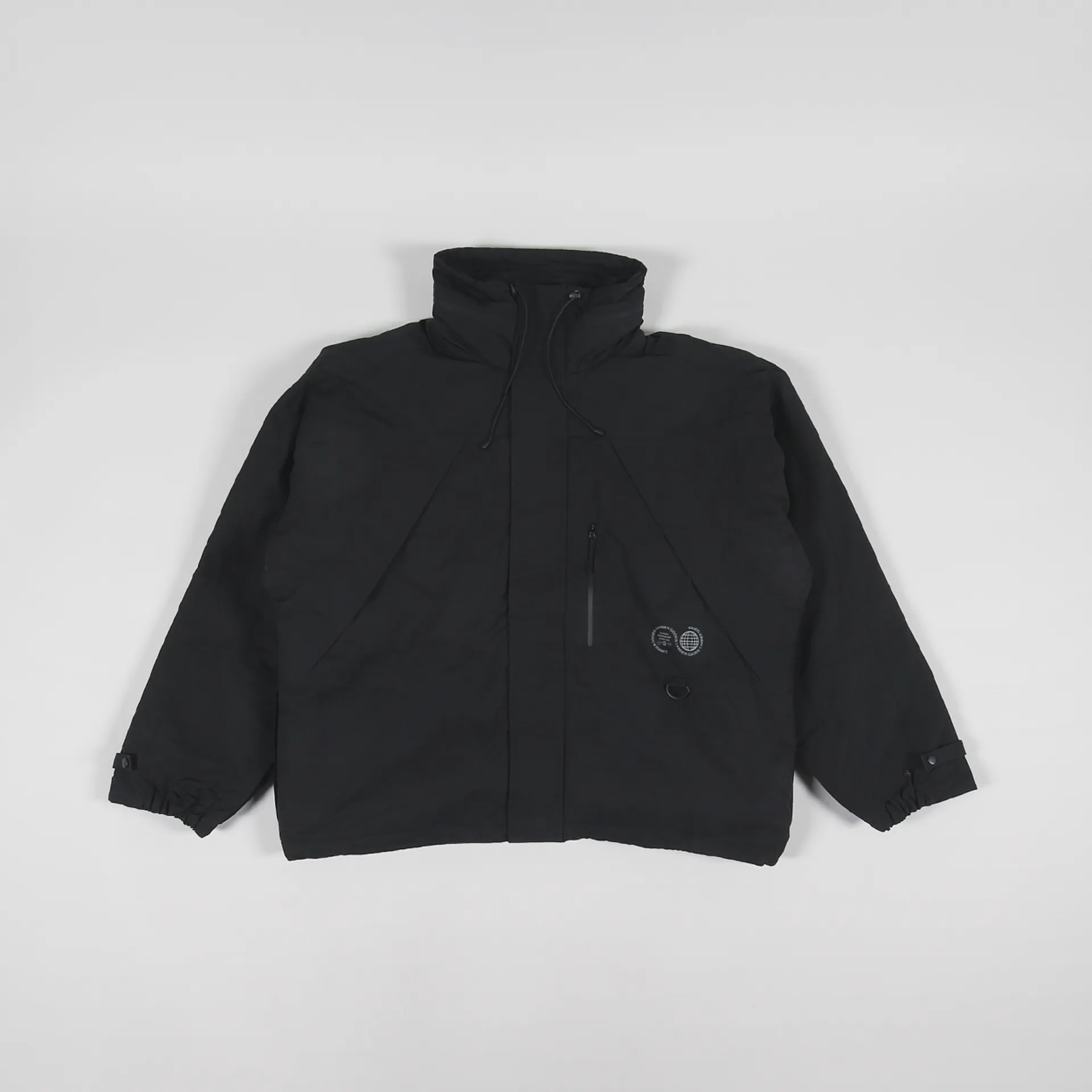 The jacket has a two-way full-zip front with a snap-up stormflap, drawcords through the collar, zip-away hood and hem, and elasticated cuffs with snap-up straps.
