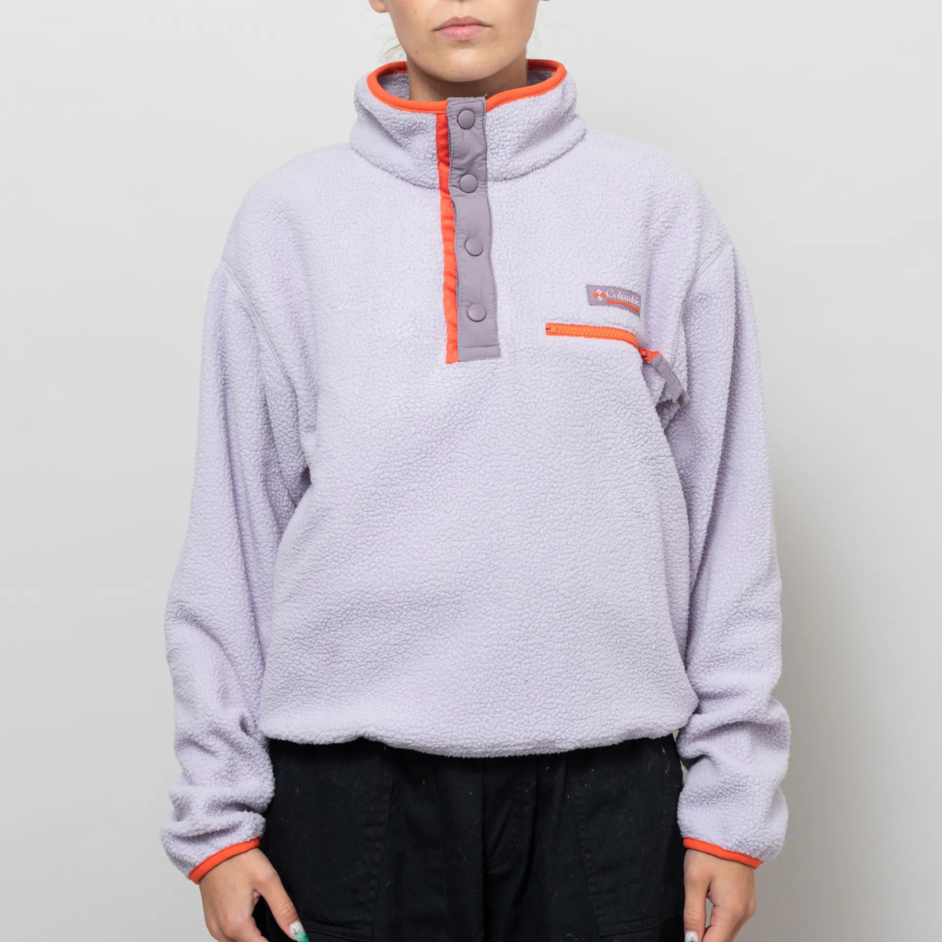 The Helvetia II Half Snap Fleece from Columbia has been cut in a regular fit for everyday comfort, crafted from a warm and soft 100% polyester sherpa pile. It features a snap-button placket which leads up to a stand collar, with contrast binding to the hem and cuffs and a single zippered pocket to the chest. Finished off with the signature rubber Columbia logo above the pocket.