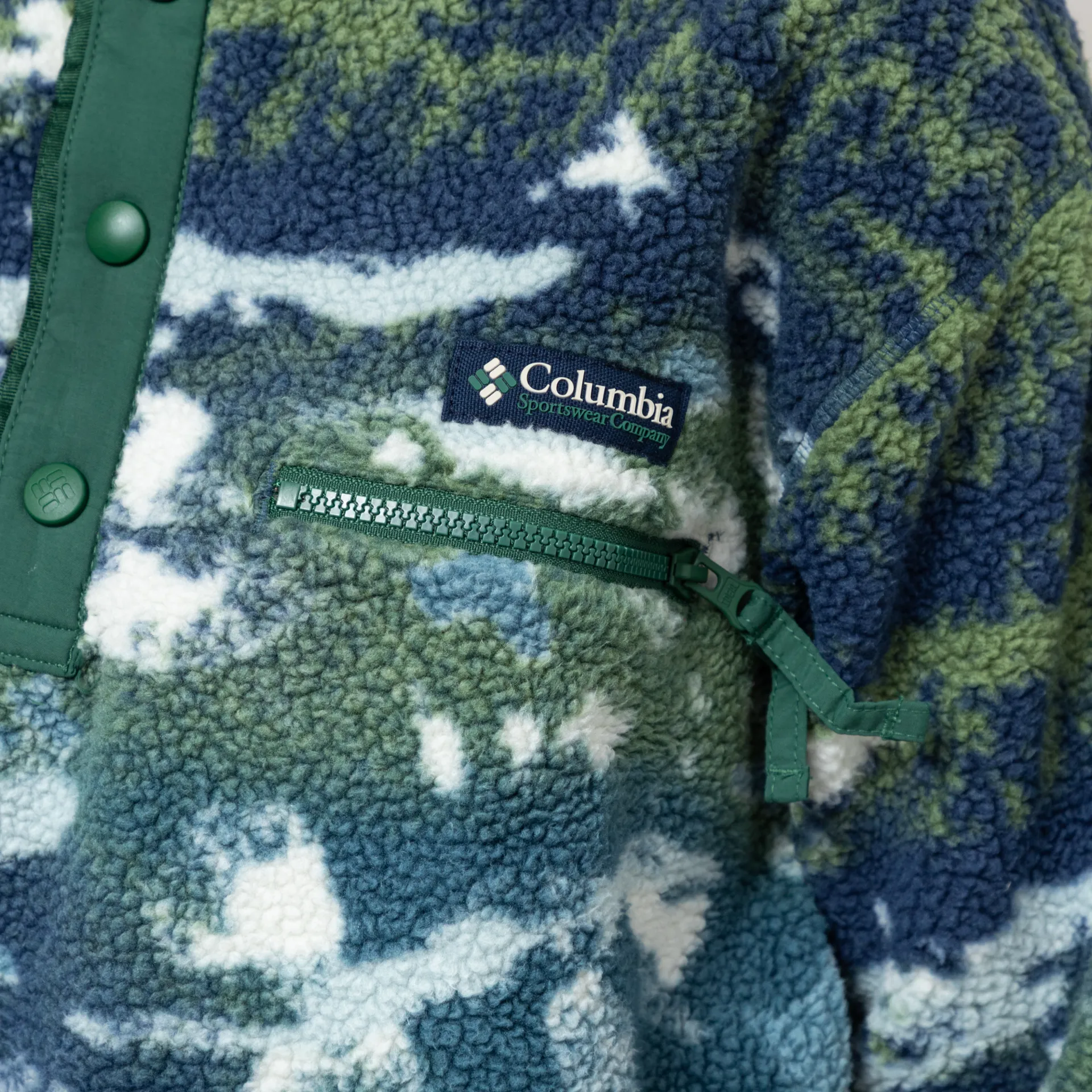 The Helvetia II Half Snap Fleece from Columbia has been cut in a regular fit for everyday comfort, crafted from a warm and soft 100% polyester sherpa pile. It features a snap-button placket which leads up to a stand collar, with contrast binding to the hem and cuffs and a single zippered pocket to the chest. Finished off with the signature rubber Columbia logo above the pocket.