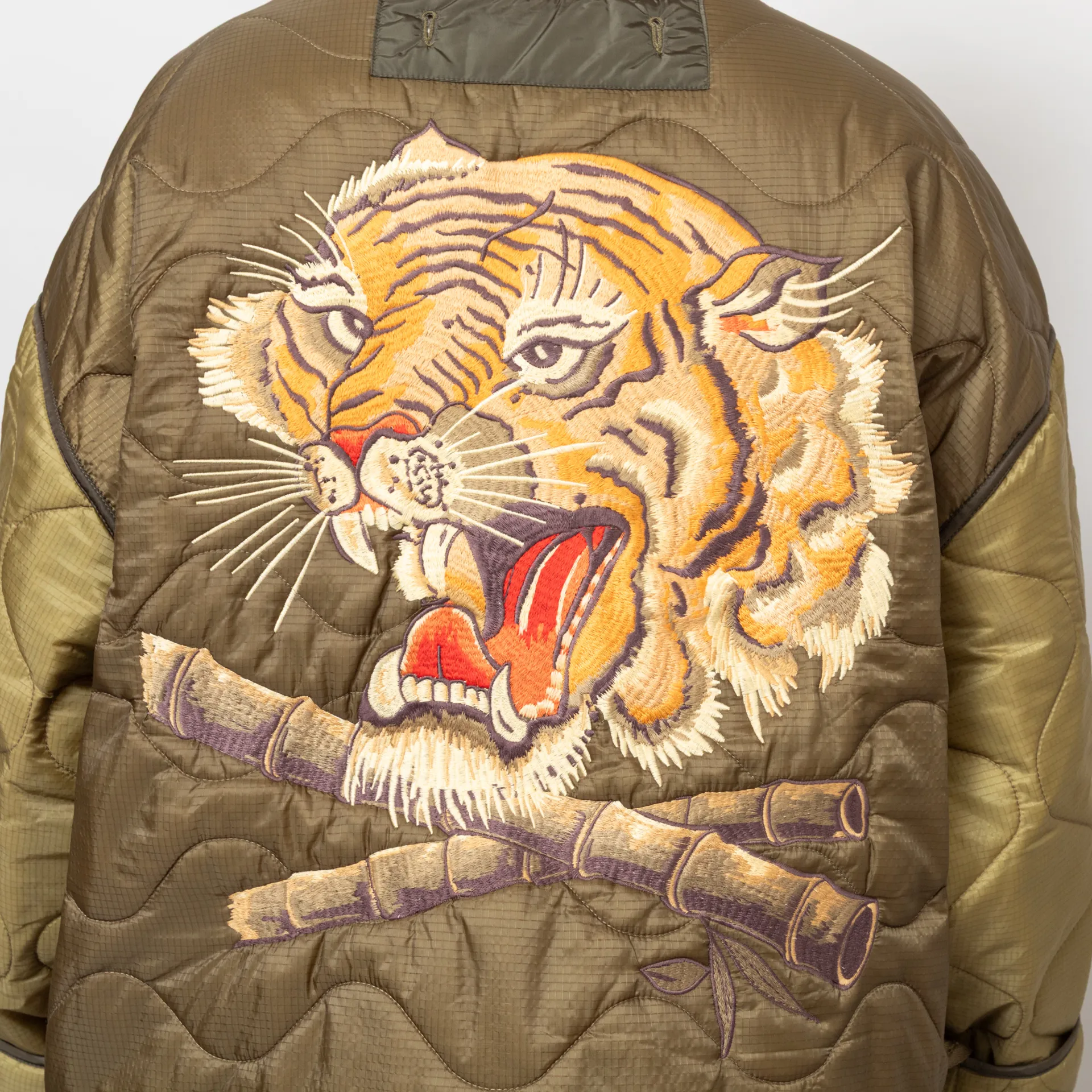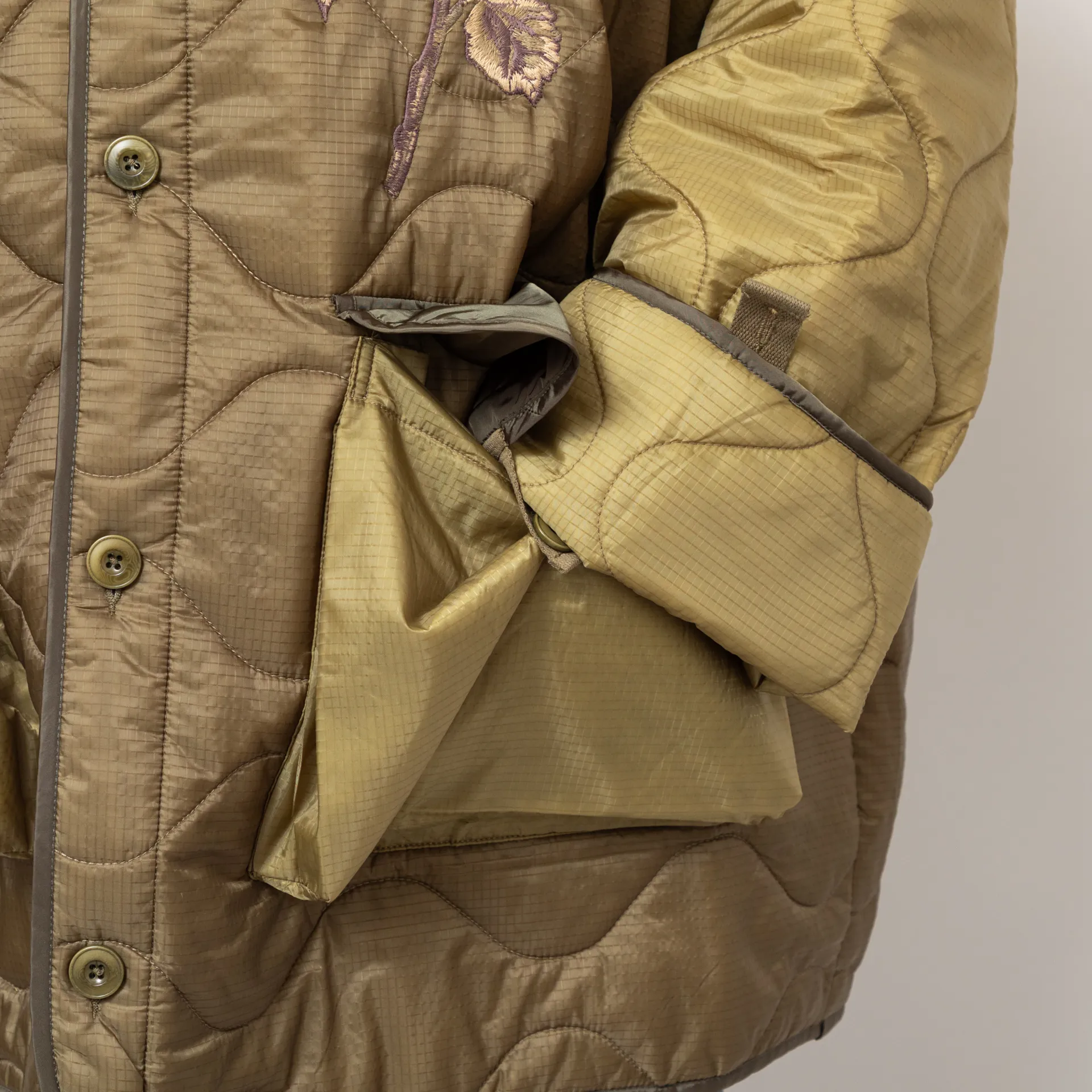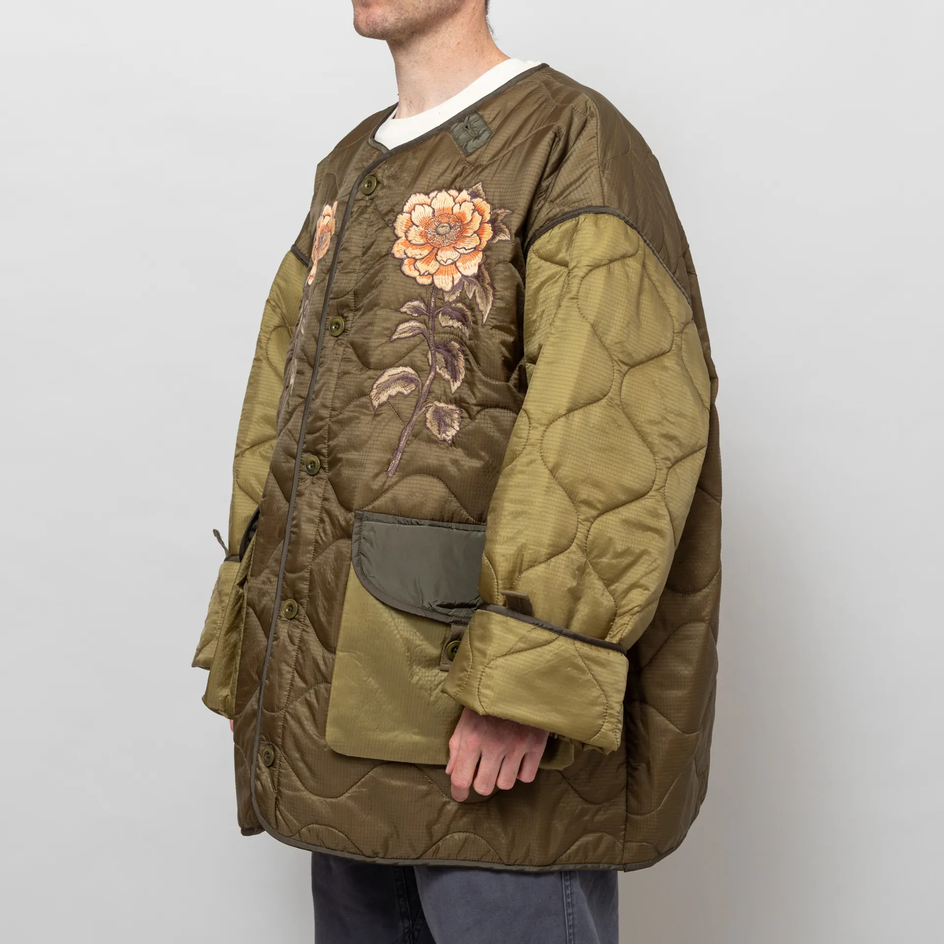 A very oversized liner jacket from Deus, constructed from wadded nylon ripstop with an all-over quilting pattern and contrast nylon binding at the seams. Featuring a button-through front, leading to a collarless neckline, two large buttoned patch pockets and finished with some lovely embroidered patches to the chest and back.