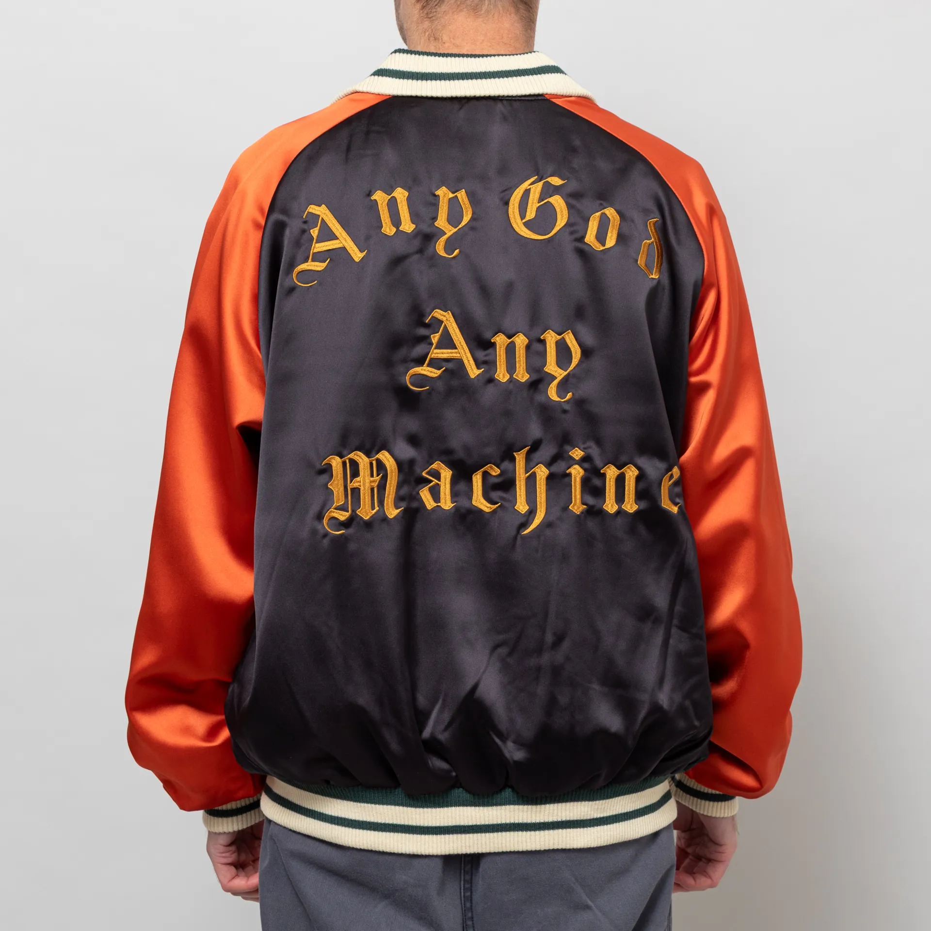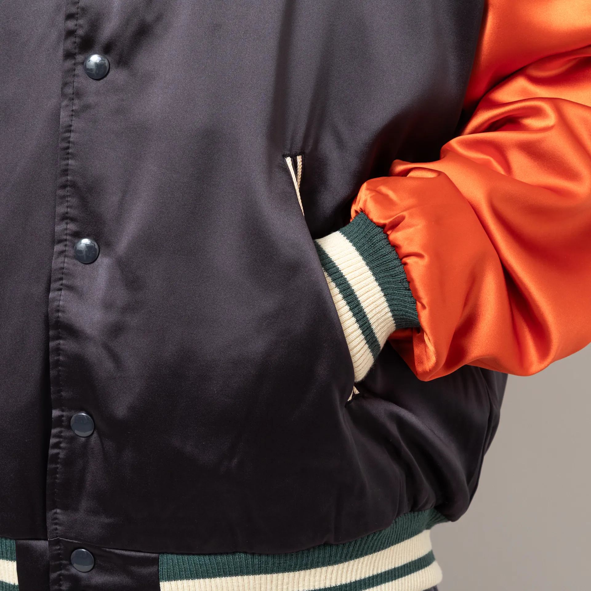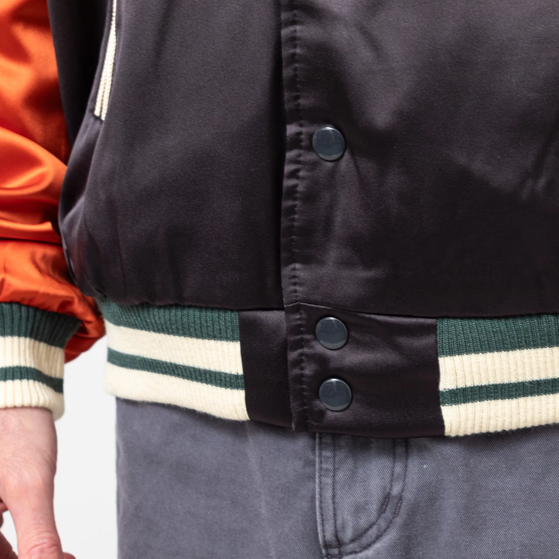 A varsity jacket from Deus, constructed from recycled polyester satin with a subtle wash and fade for an aged appearance.