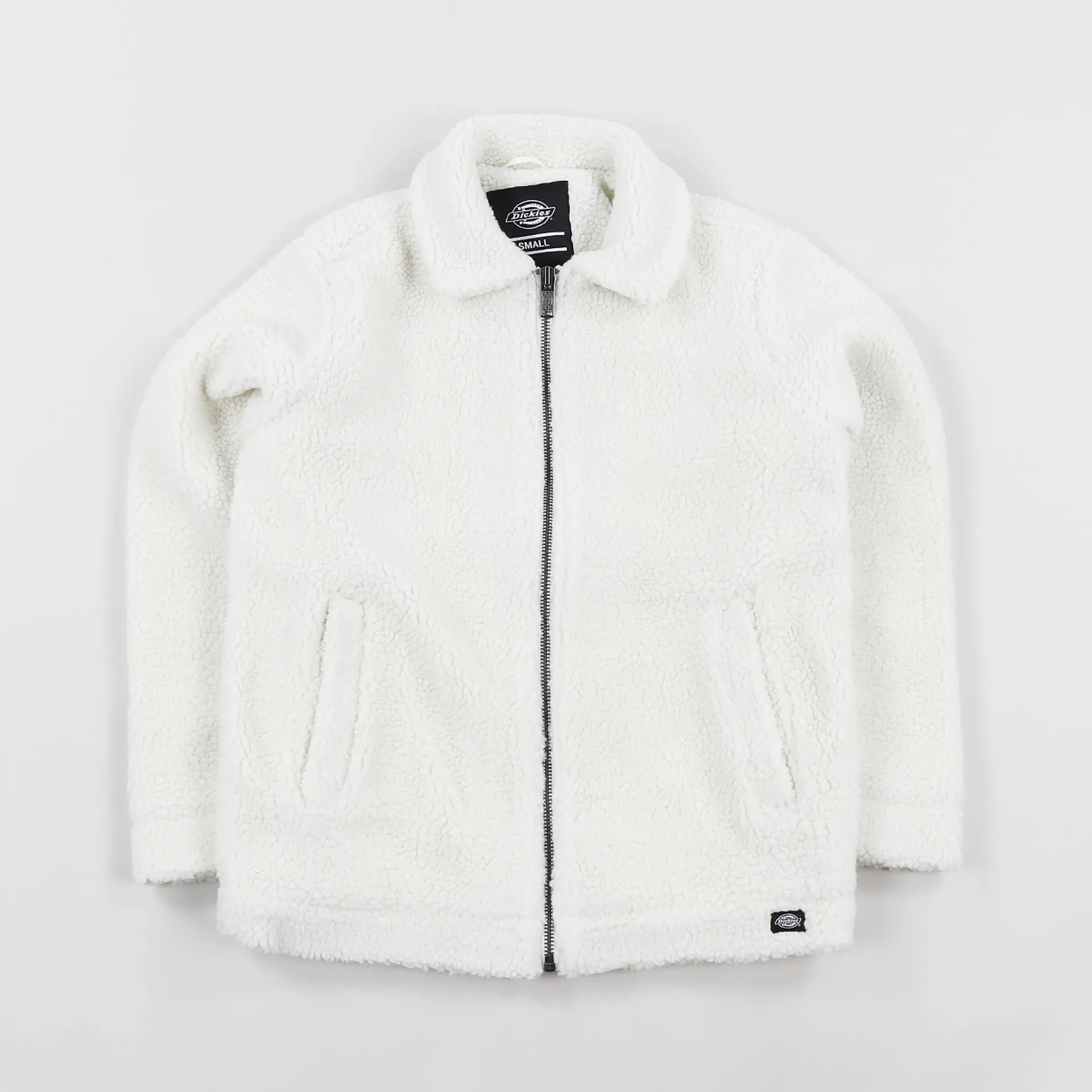 The silhouette is similar to a coach jacket with a shell of 100% polyester pile which is extremely warm and insulating, as well as very lightweight. It has a body lining made from 65% polyester nad 35% cotton which is incredibly comfortable against the skin and the sleeves are lined with another cut of polyester. The jacket has two handwarmer pockets and an internal chest pocket, and it has a metallic full-zip. To the hem it has a woven Dickies logo patch.