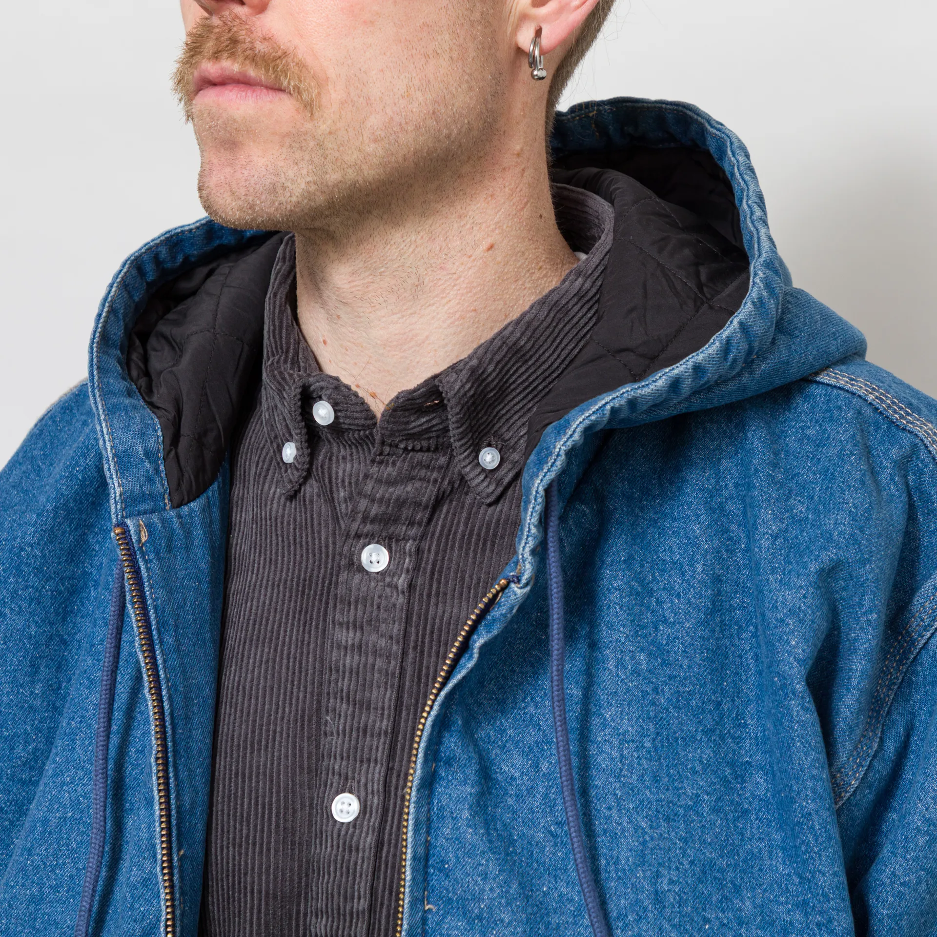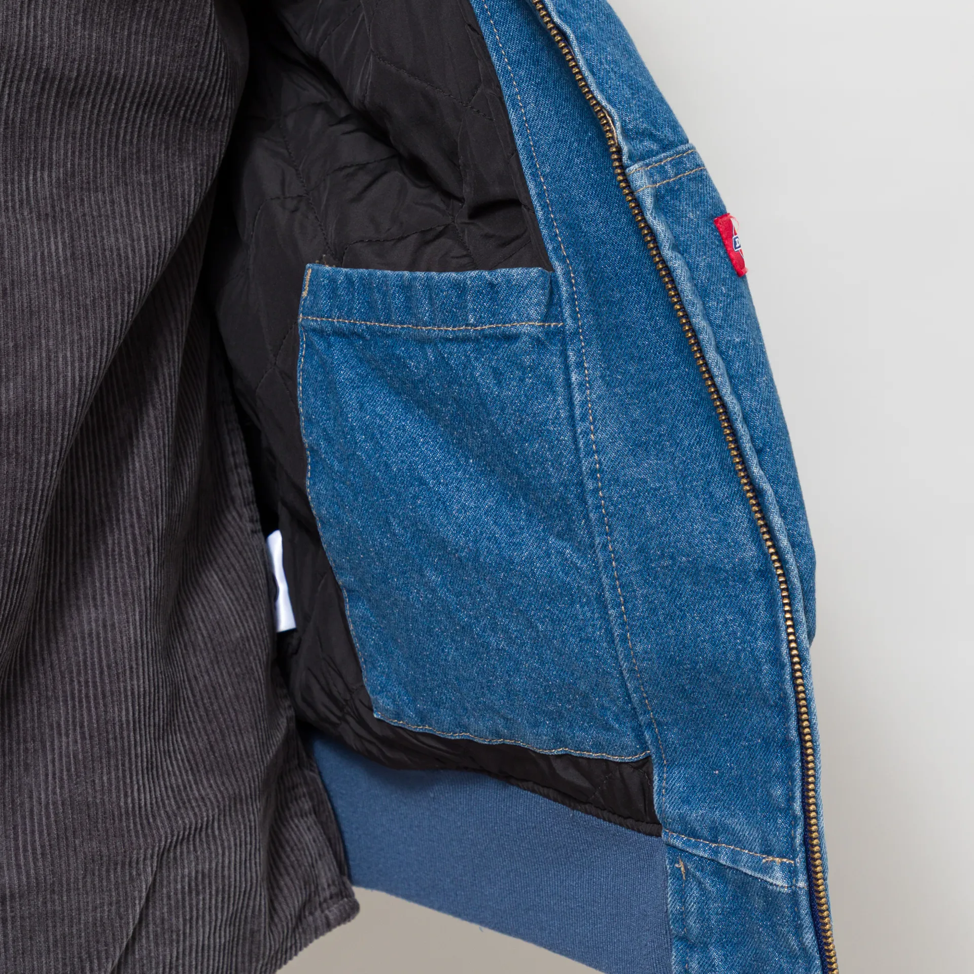 A heavyweight bomber jacket from Dickies, cut in a relaxed fit for easy layering and constructed from 14oz slub cotton denim twill, garment-washed for a worn-in look. It features a full zip-through front, leading up to a drawstring hood, with a ribbed hem and cuffs. The design is complete with a diamond-quilted lining for added warmth, two hand pockets with metal rivet detailing, and of course, the signature woven Dickies patch.