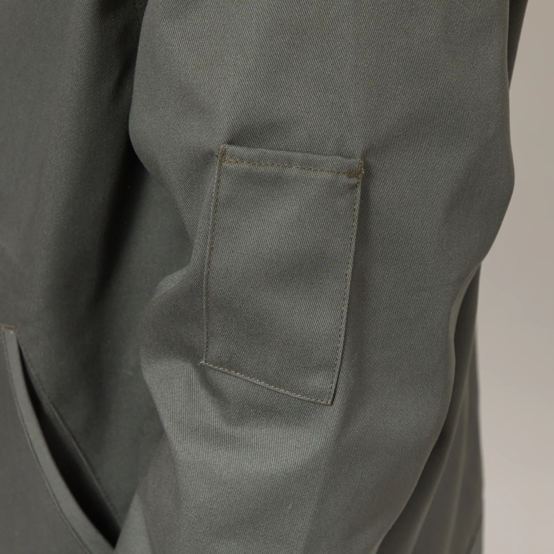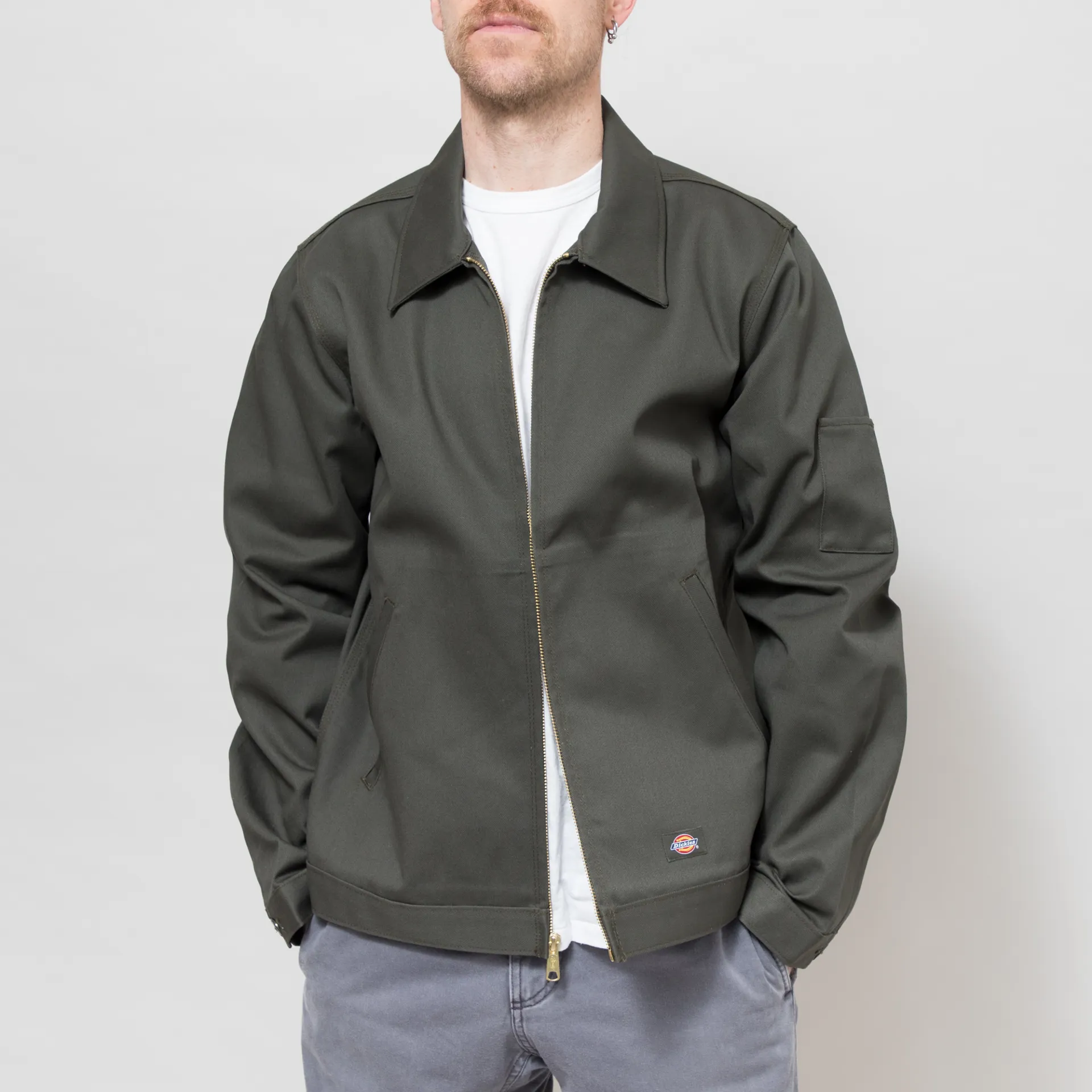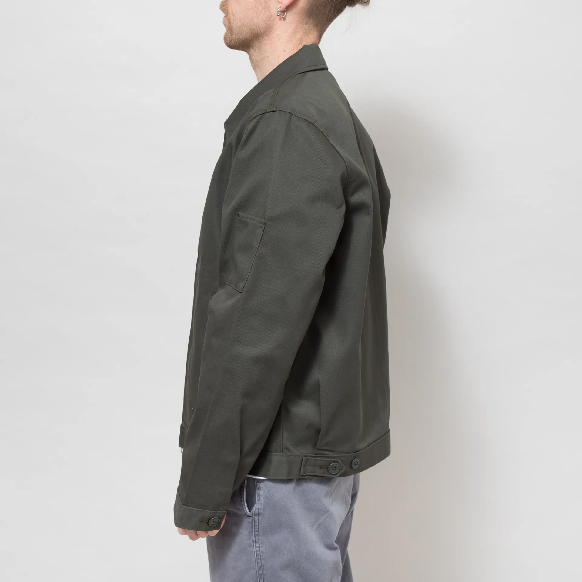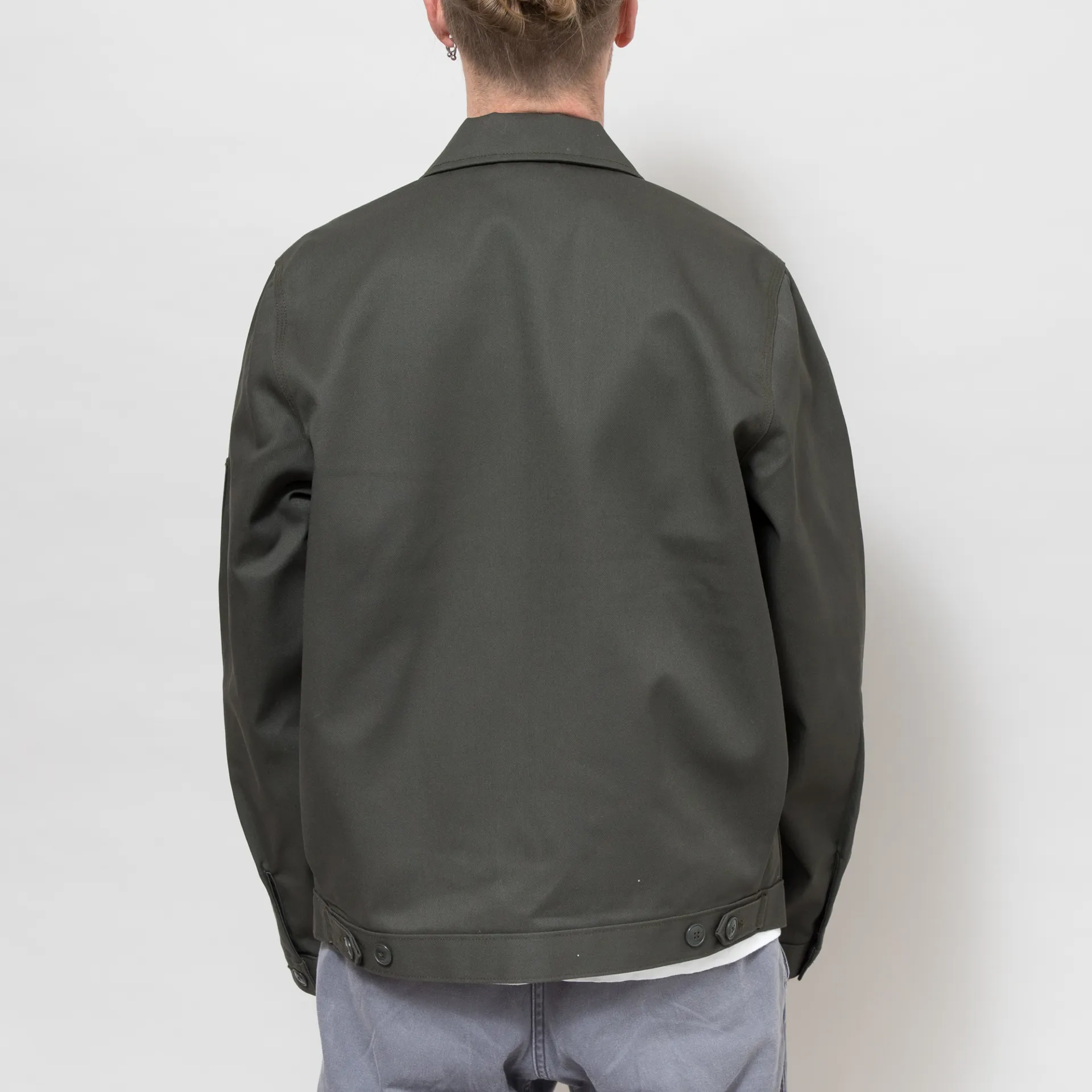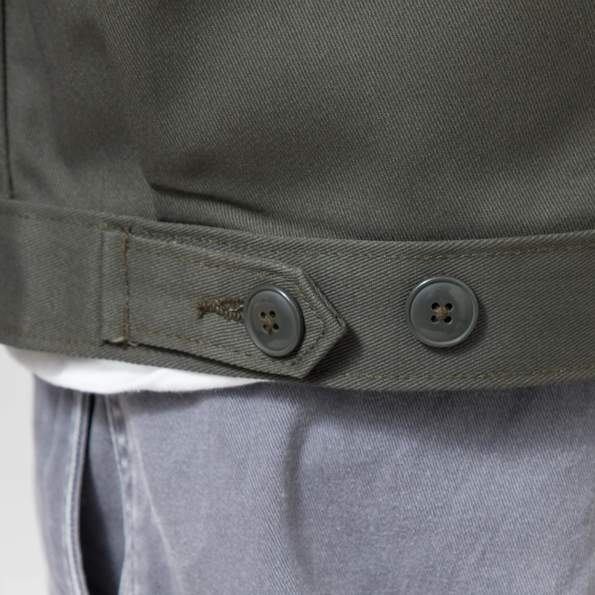 A classic jacket from Dickies, made from a durable twill blend of 65% recycled polyester and 35% BCI cotton with a full-zip front, a buttoned hem and cuffs, handwarmer pockets and a woven logo patch.