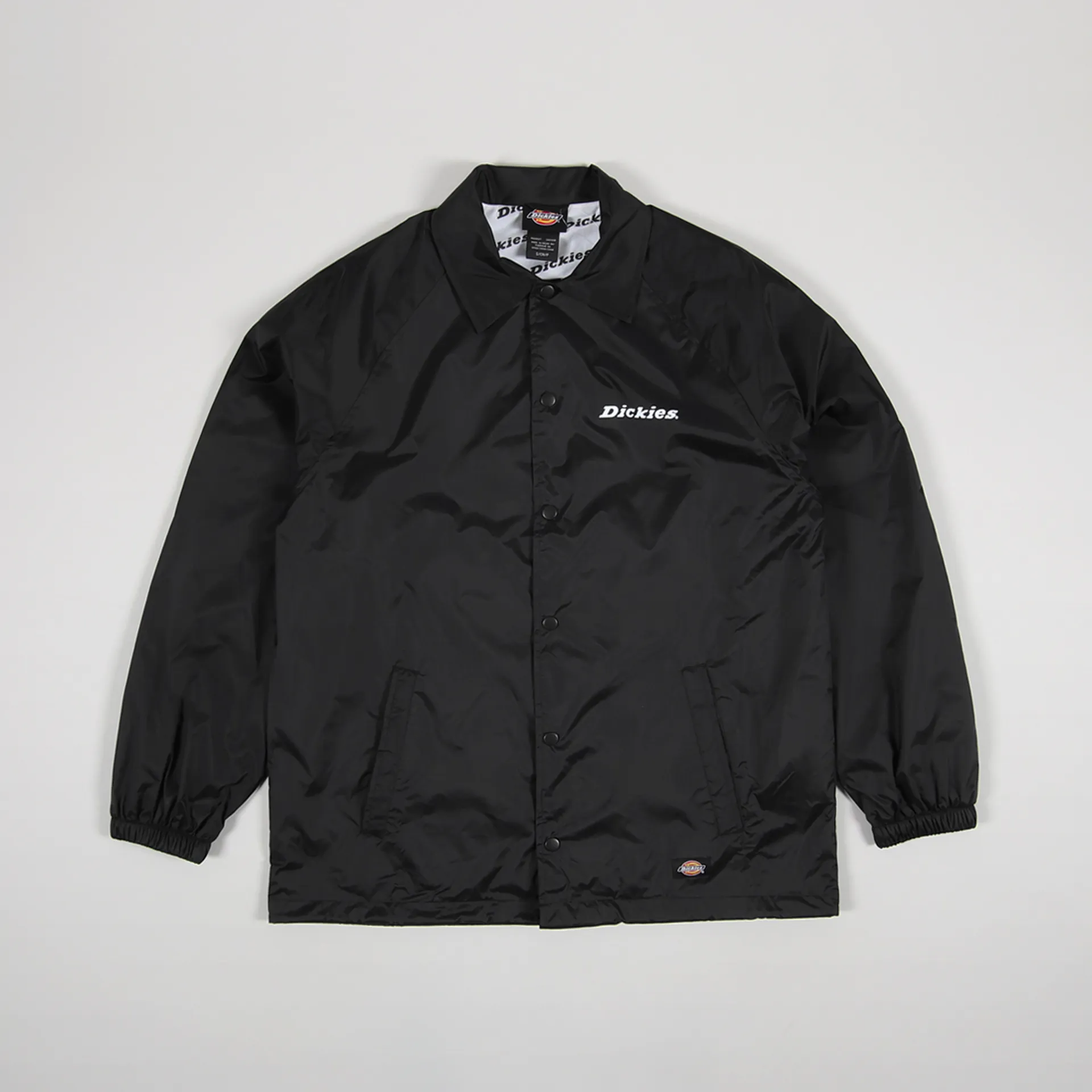 A coach jacket from Dickies made from a smooth plain weave of 100% polyamide with a soft brushed polyester lining, elasticated cuffs, a drawstring hem, snap-up front and an internal patch pocket. It has a graphic chest print and a woven logo patch.