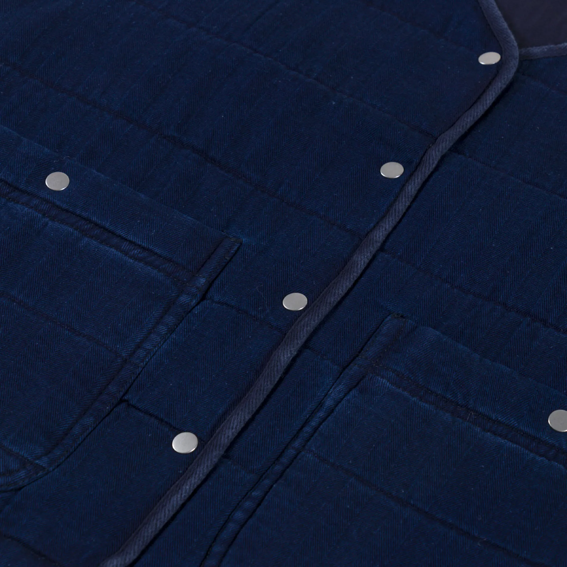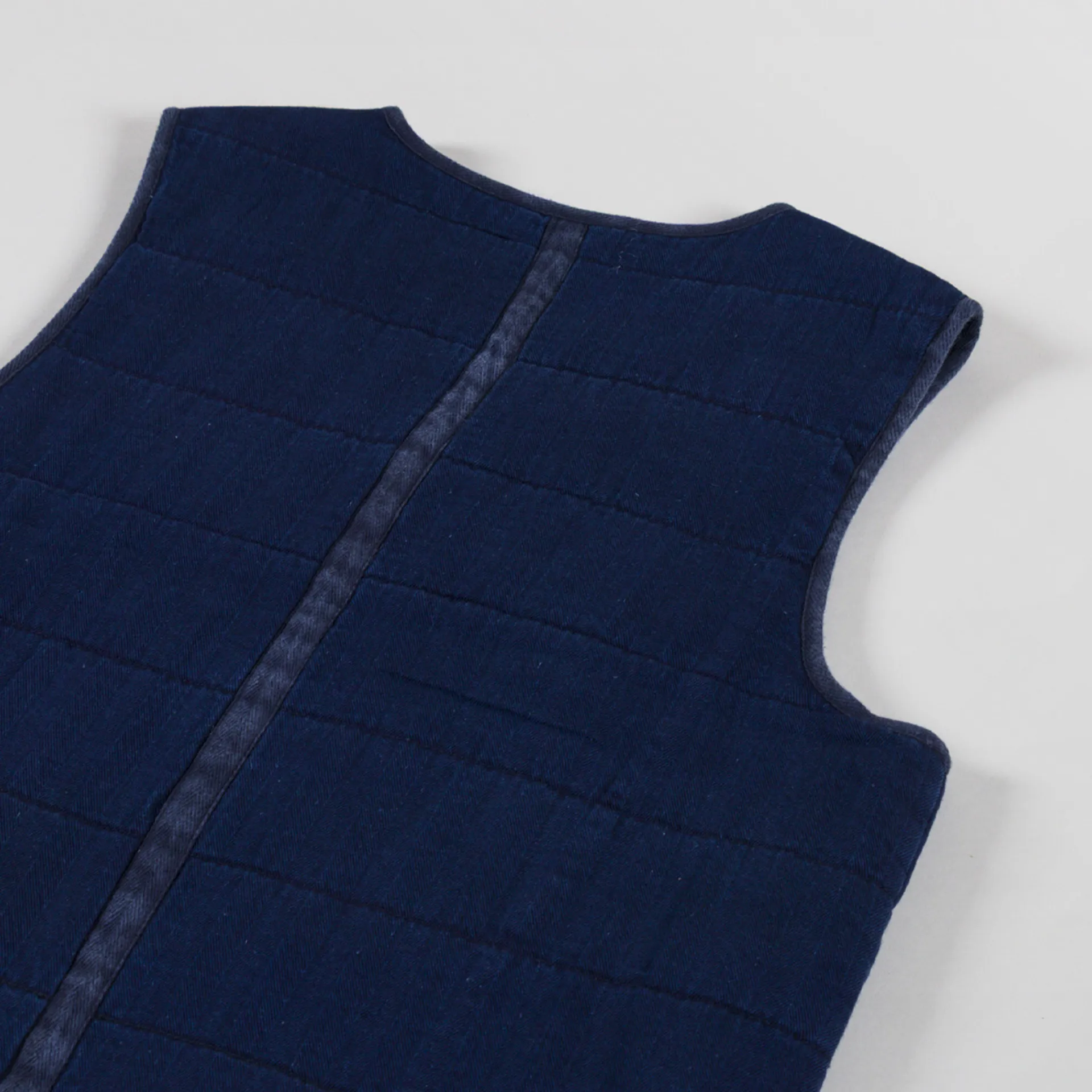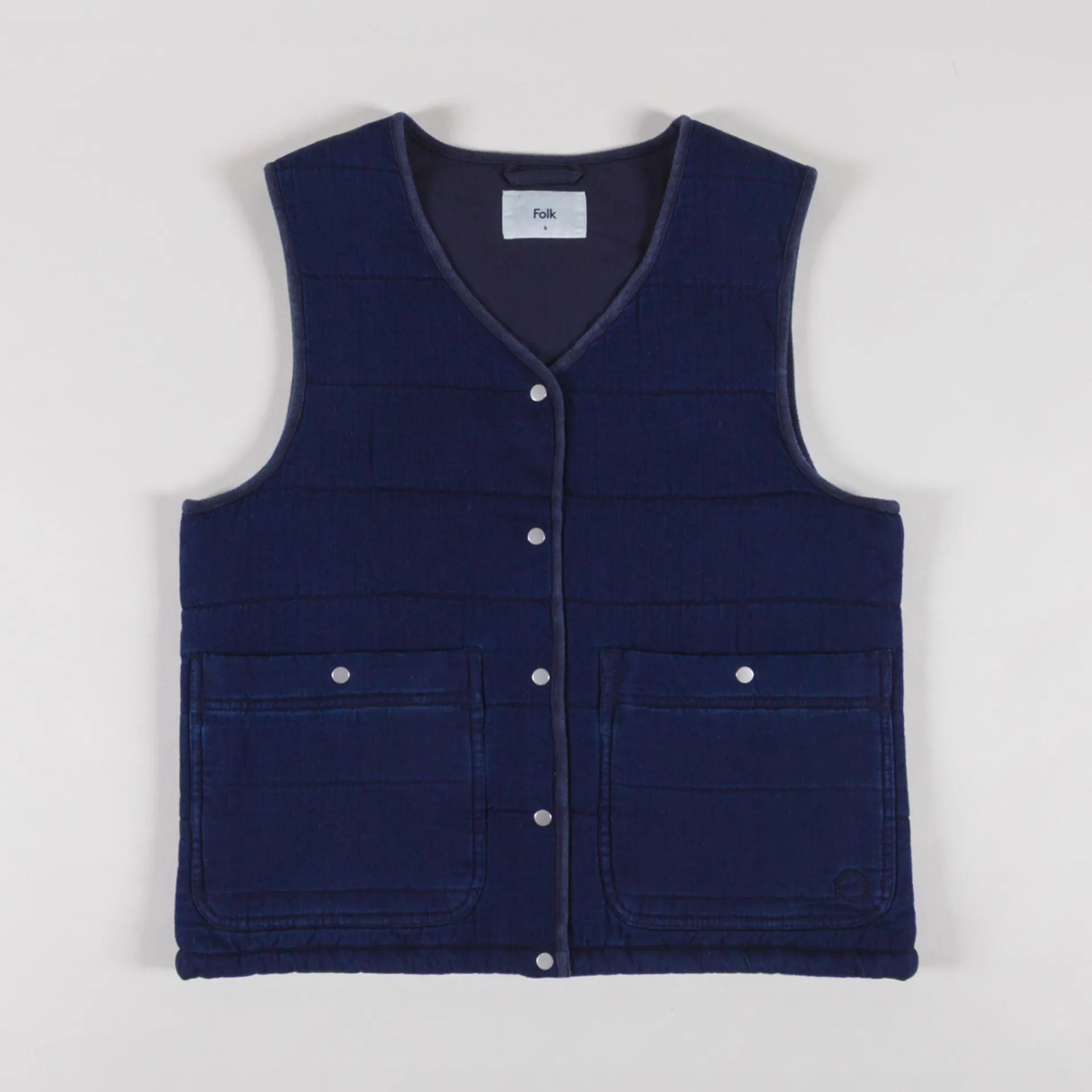 A quilted gilet from Folk, cut in a slightly oversized and boxy fit, perfect for layering. It's constructed from a soft cotton fabric, that's gently padded and garment-dyed for texture and character of colour. It has a button-through front, leading to a collarless neckline, with tonal binding throughout and two patch pockets.