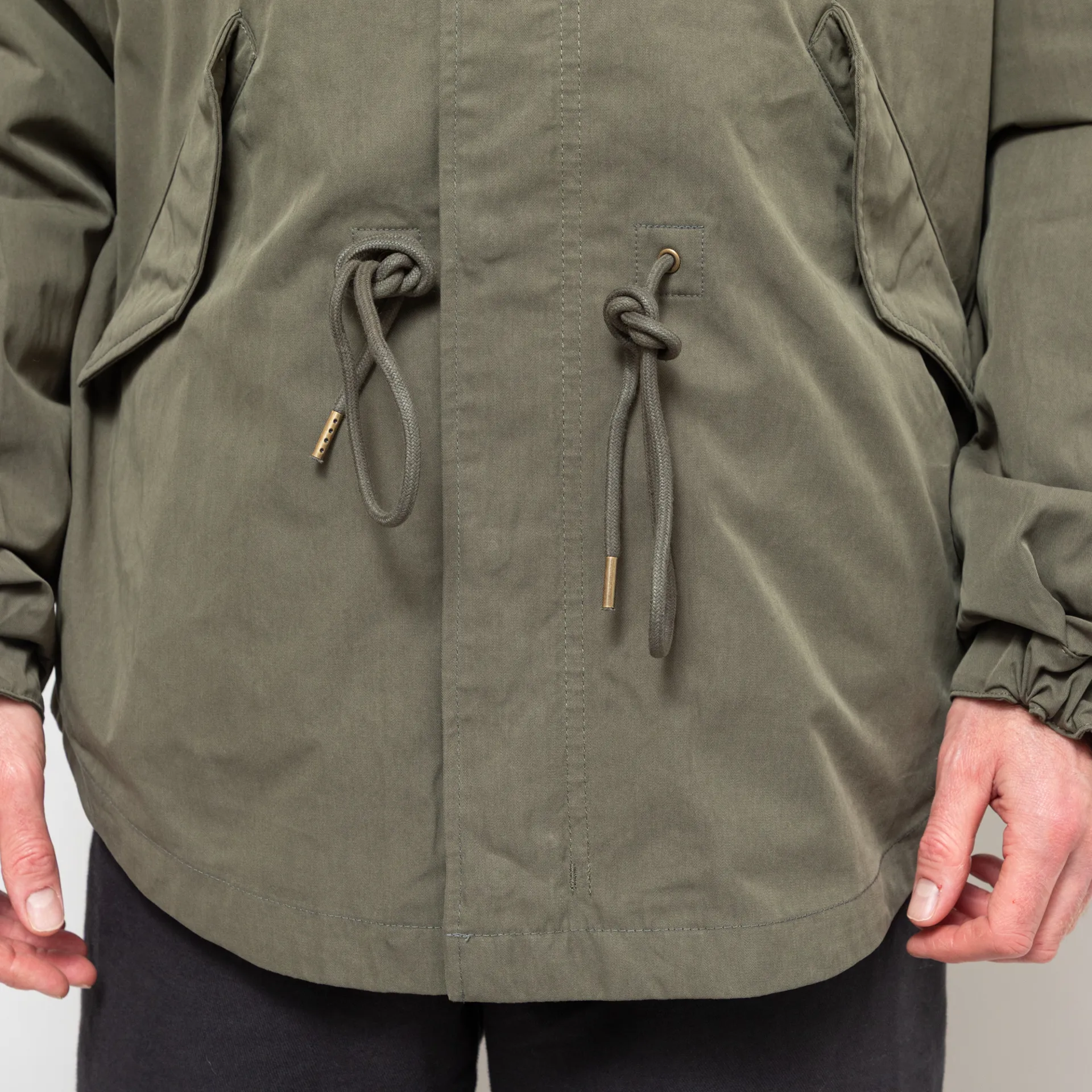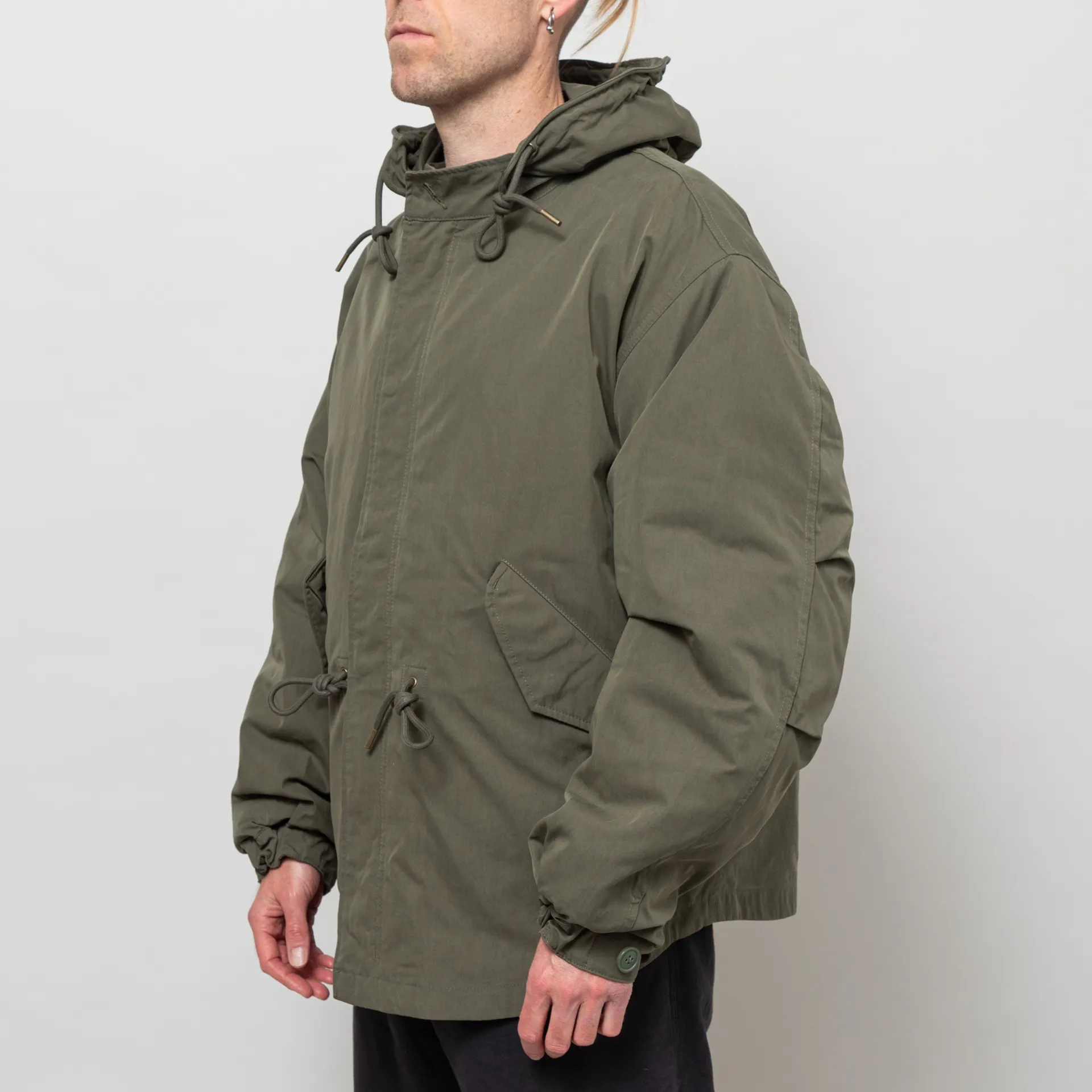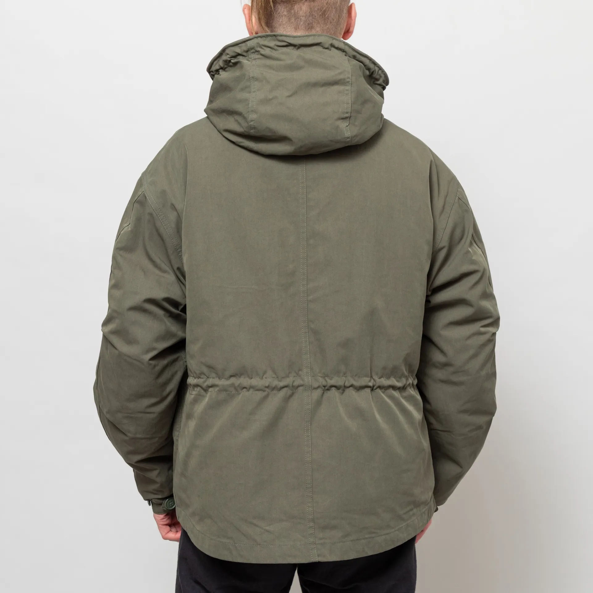 A two-layer jacket from Frizmworks, with a classic fishtail silhouette to the outer and a quilted liner jacket on the inner, secured with buttons and easily removable to wear alone if desired. The outer layer has a zip-through front, covered by a buttoned placket and leading up to a drawstring adjustable hood. The hood has wiring around the front for structure and can be removed using the buttons. Drawcords run through the waist of the jacket in classic parka style, to cinch in and change the shape, while buttons at the cuffs can be adjusted to help keep out the draught. Two hand pockets at the front and an internal drop-in pocket complete the outer.