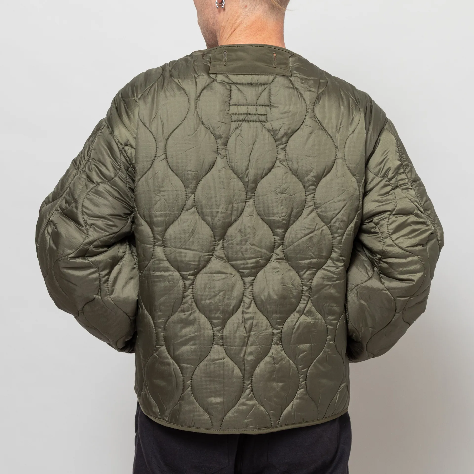 The quilted lining has a button-through front with a tonal placket, leading to a collarless neckline, with curved edges at the front of the hem and two hand pockets. Complete with an internal Frizmworks label to both jackets.