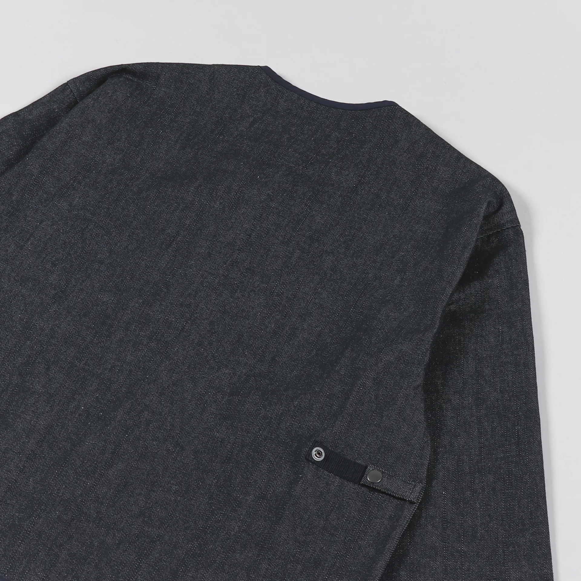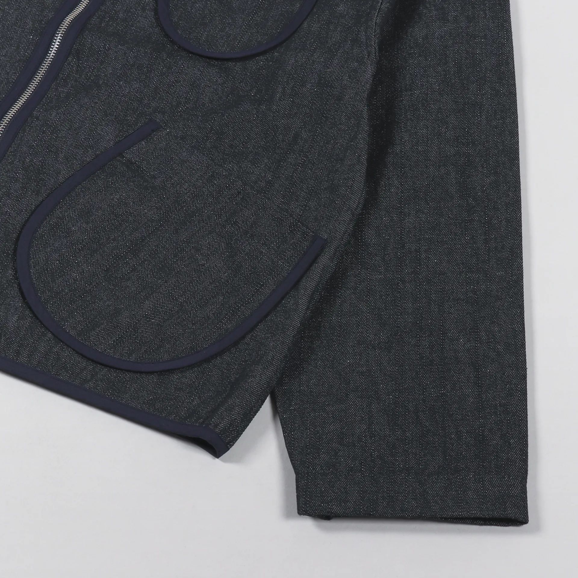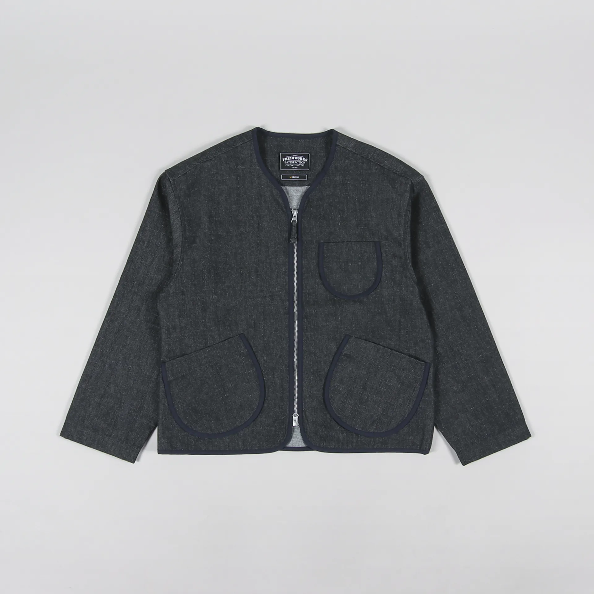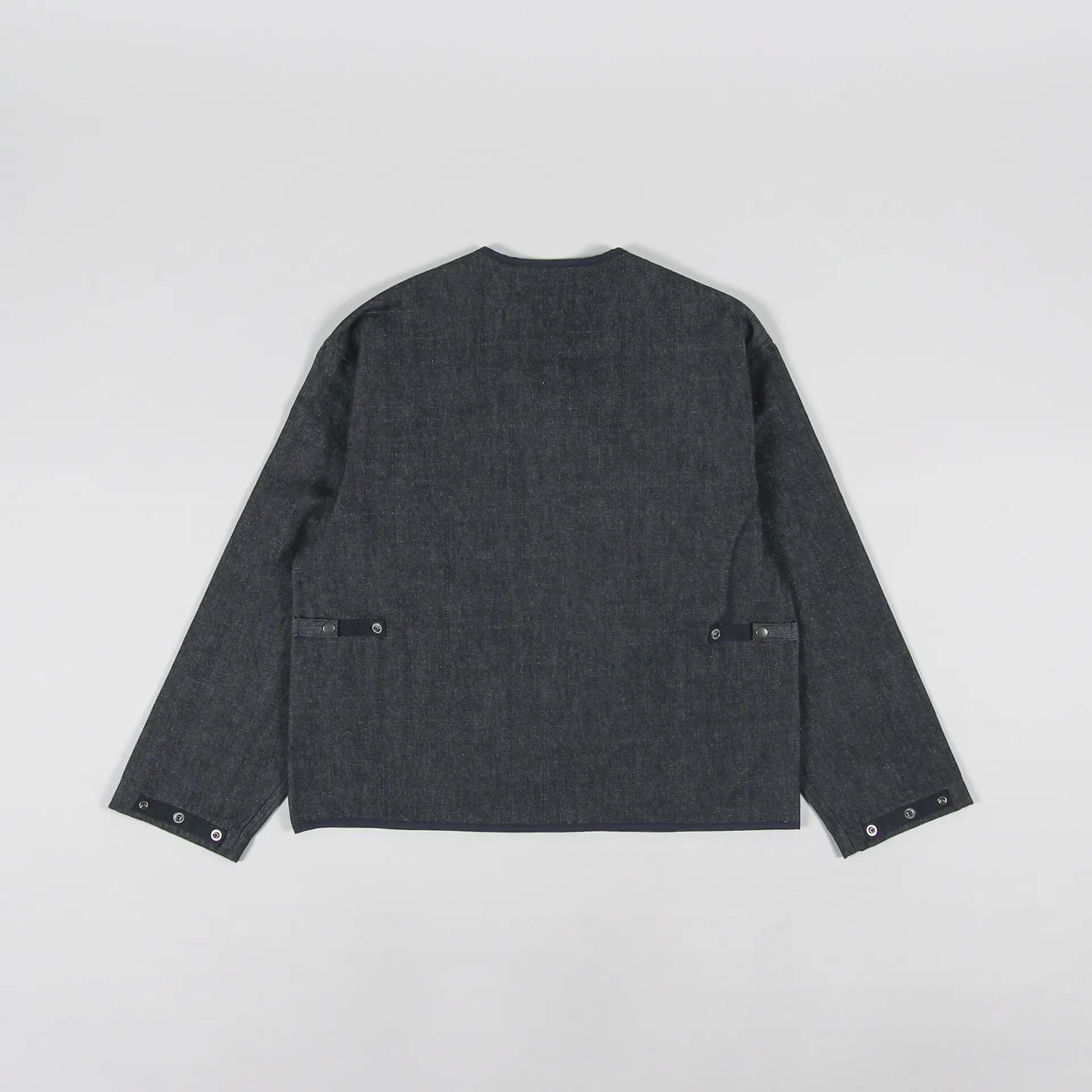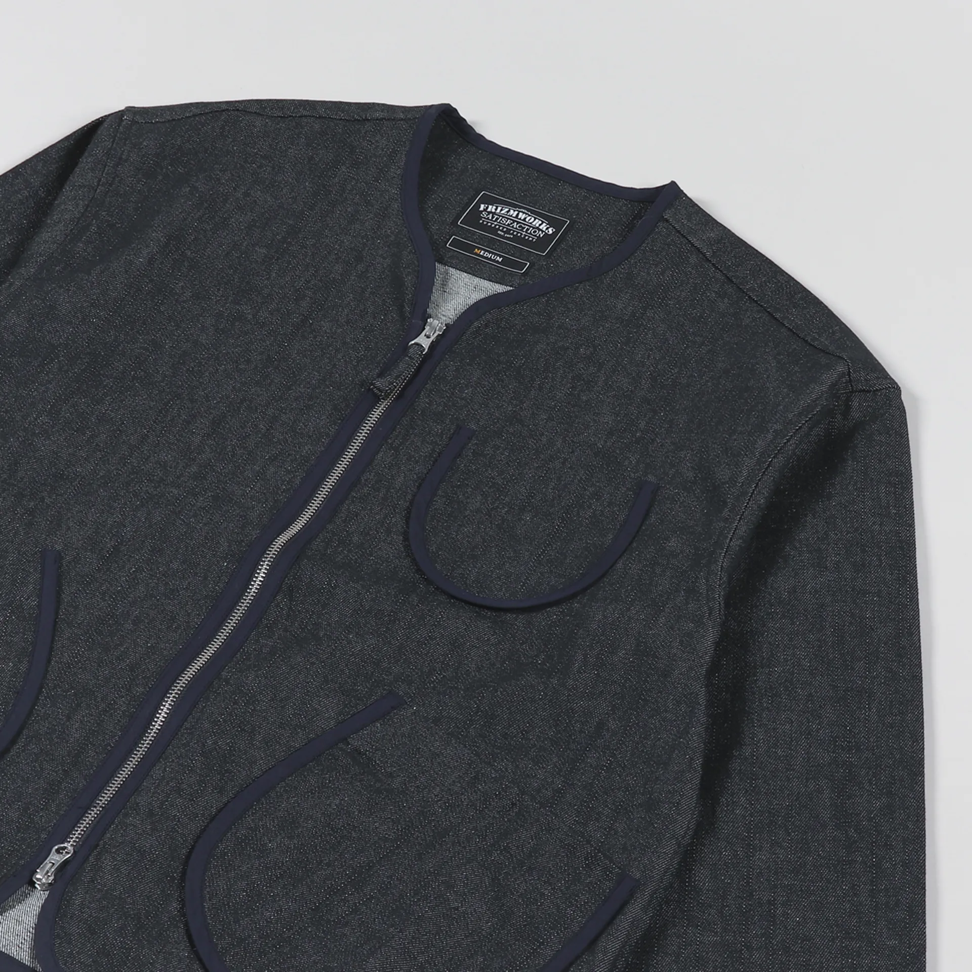 A cardigan-silhouetted jacket by Korean outerwear label FrizmWORKS, made from a comfortable yet durable 100% cotton in a classic indigo denim. It has a zip-up front with snap-up cuffs and waist straps, and three rounded patch pockets to the front.