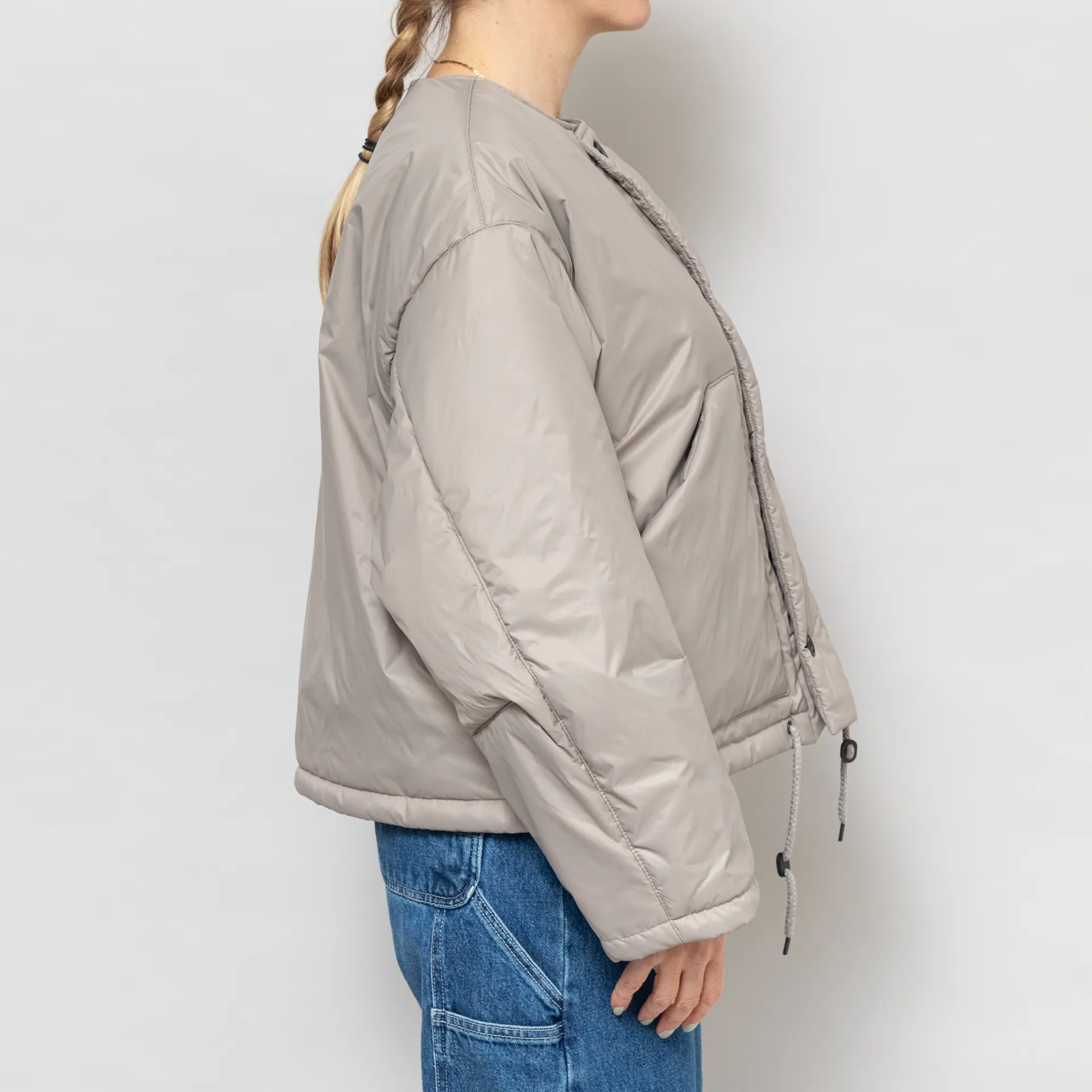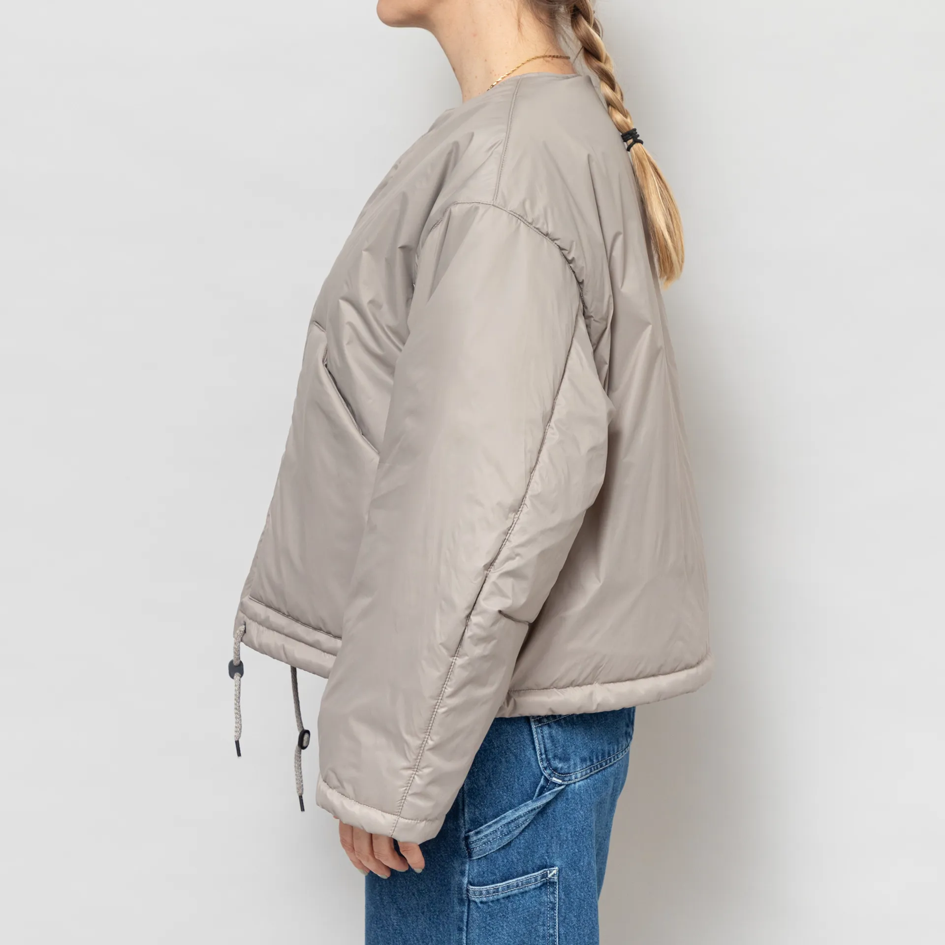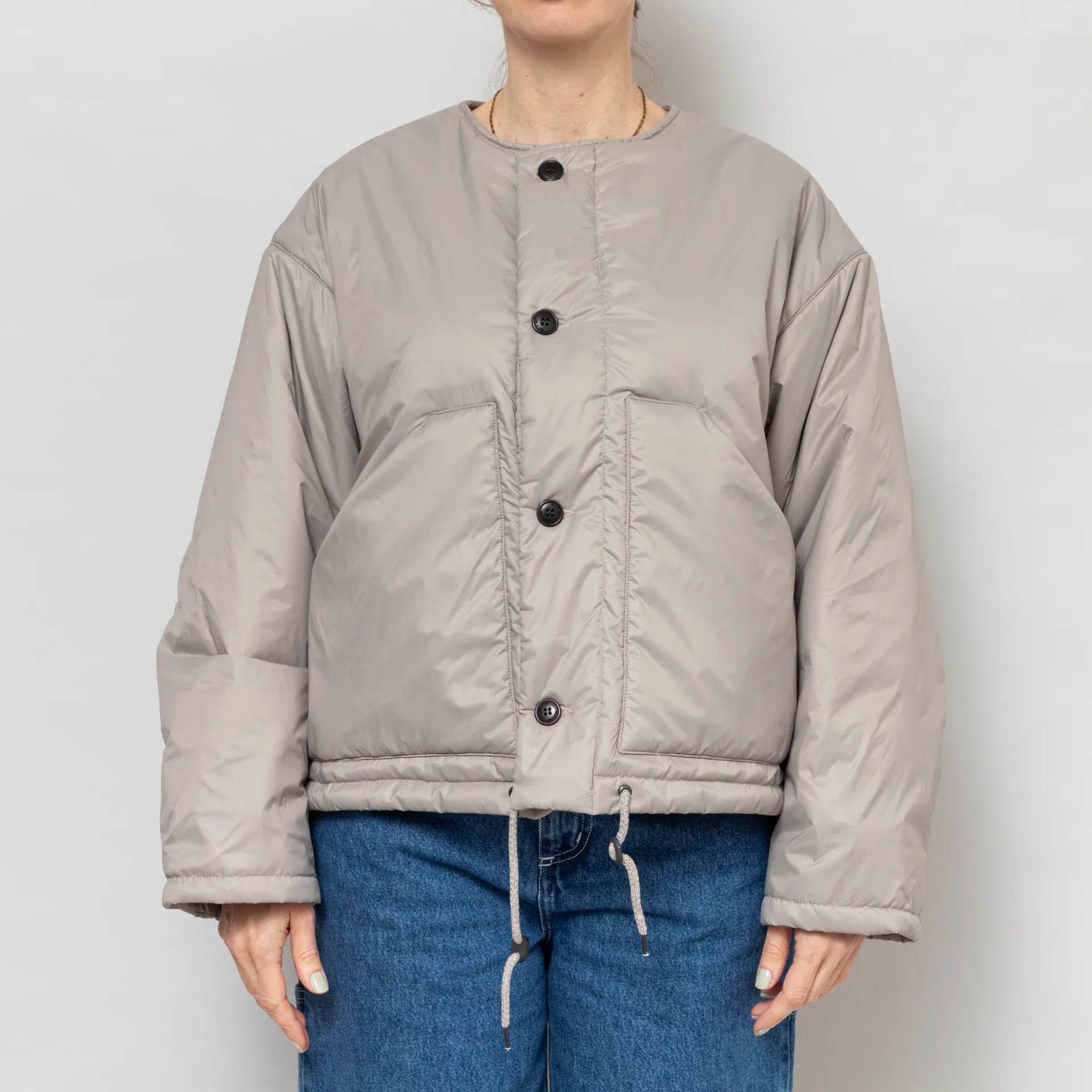 The Nuclear Jacket from Girls of Dust is cut in a loose, boxy fit for a laidback silhouette, constructed from a premium Italian polyamide fabric, with PrimaLoft Silver insulation for warmth. It features a full button-through front, leading to a collarless neckline, with slouchy dropped shoulders, a drawstring at the hem for adjustability and finished with two large patch pockets.