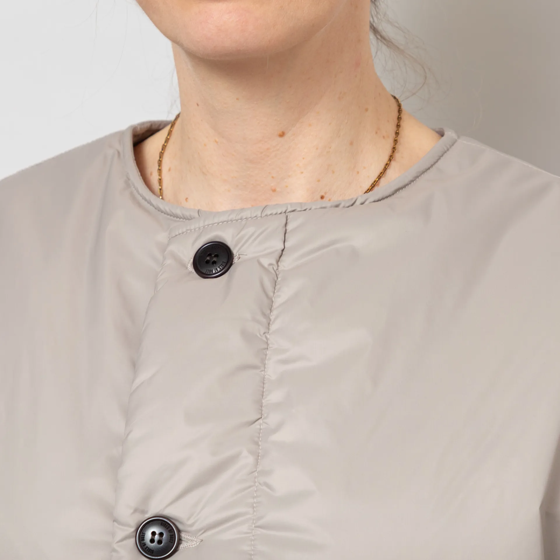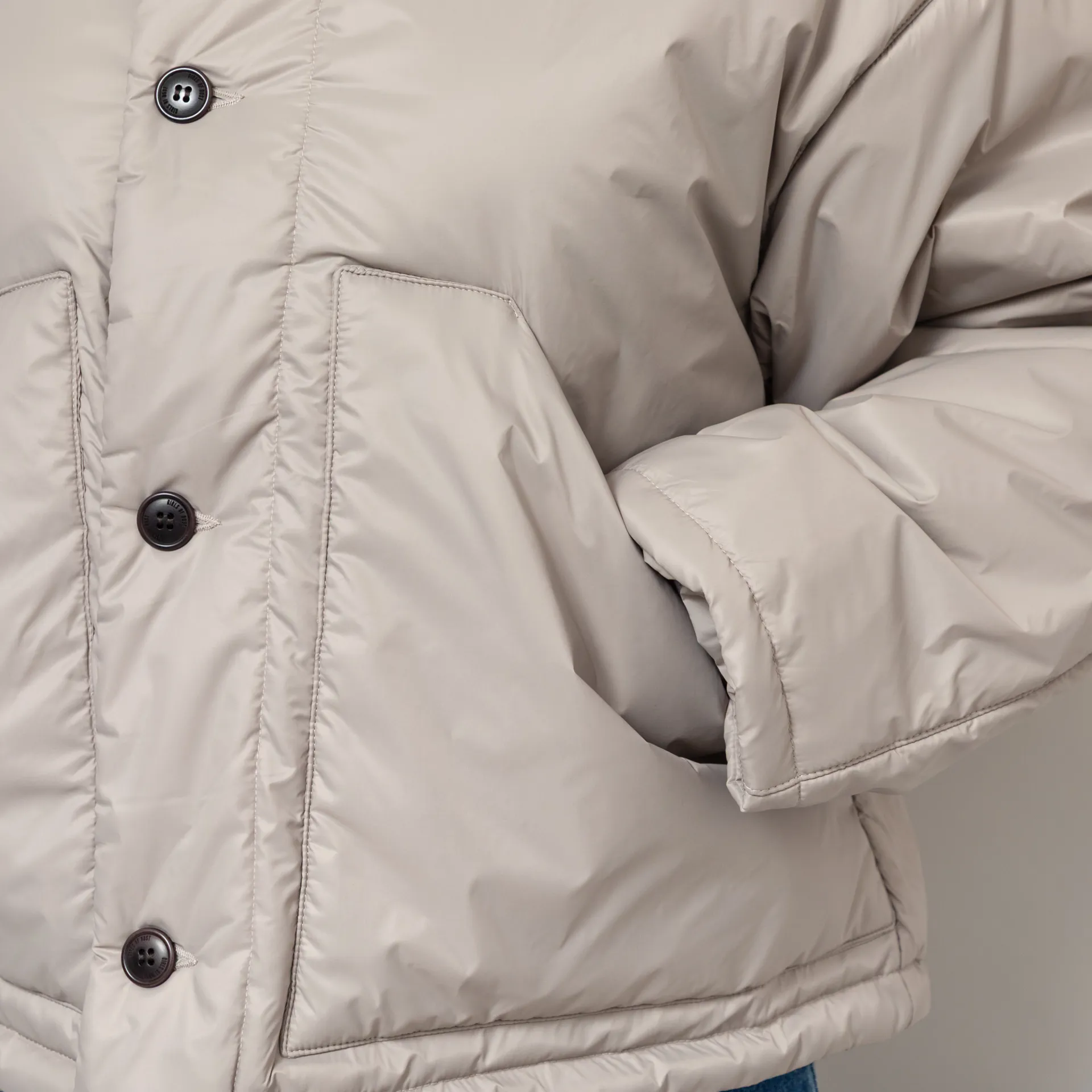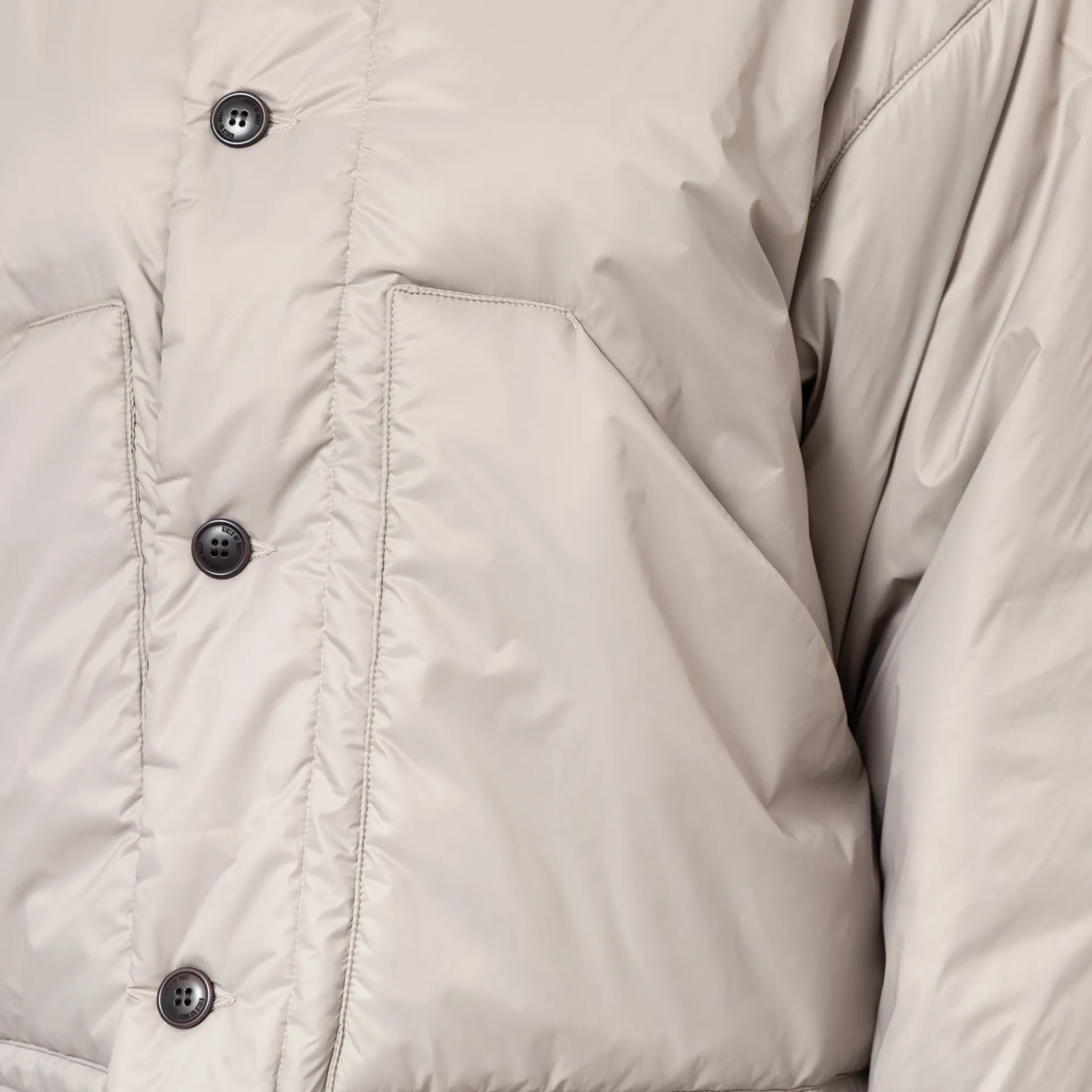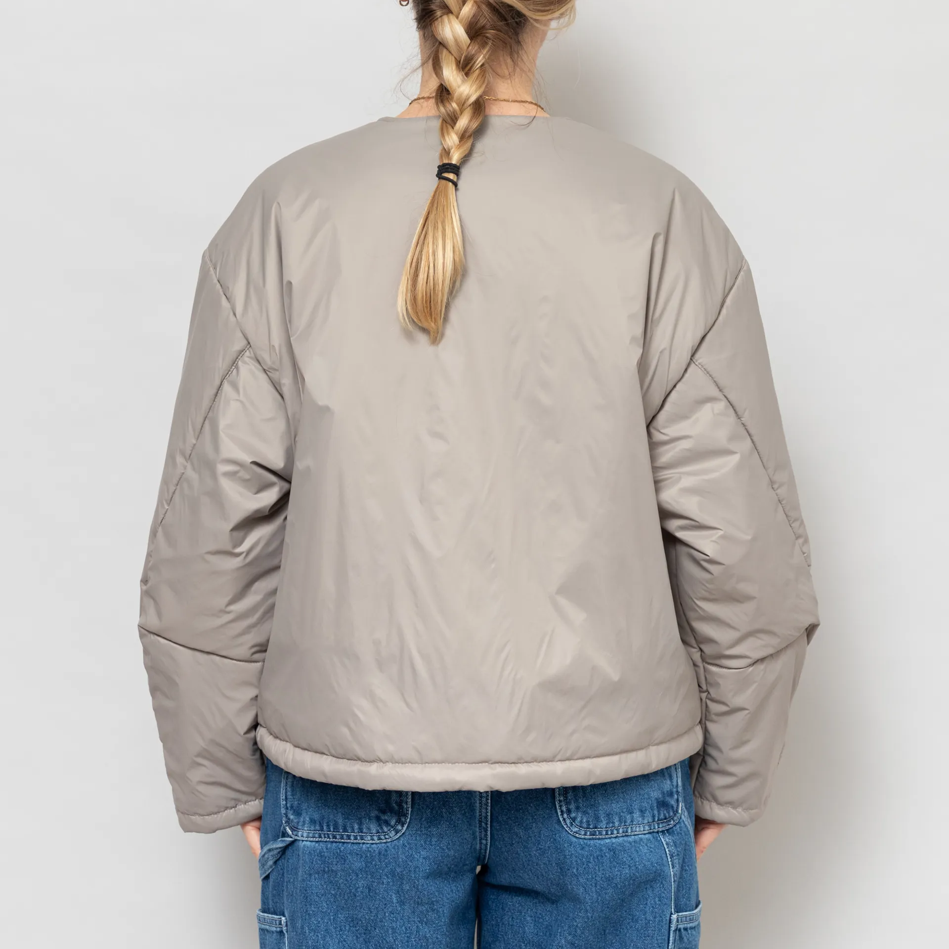 The Nuclear Jacket from Girls of Dust is cut in a loose, boxy fit for a laidback silhouette, constructed from a premium Italian polyamide fabric, with PrimaLoft Silver insulation for warmth. It features a full button-through front, leading to a collarless neckline, with slouchy dropped shoulders, a drawstring at the hem for adjustability and finished with two large patch pockets.