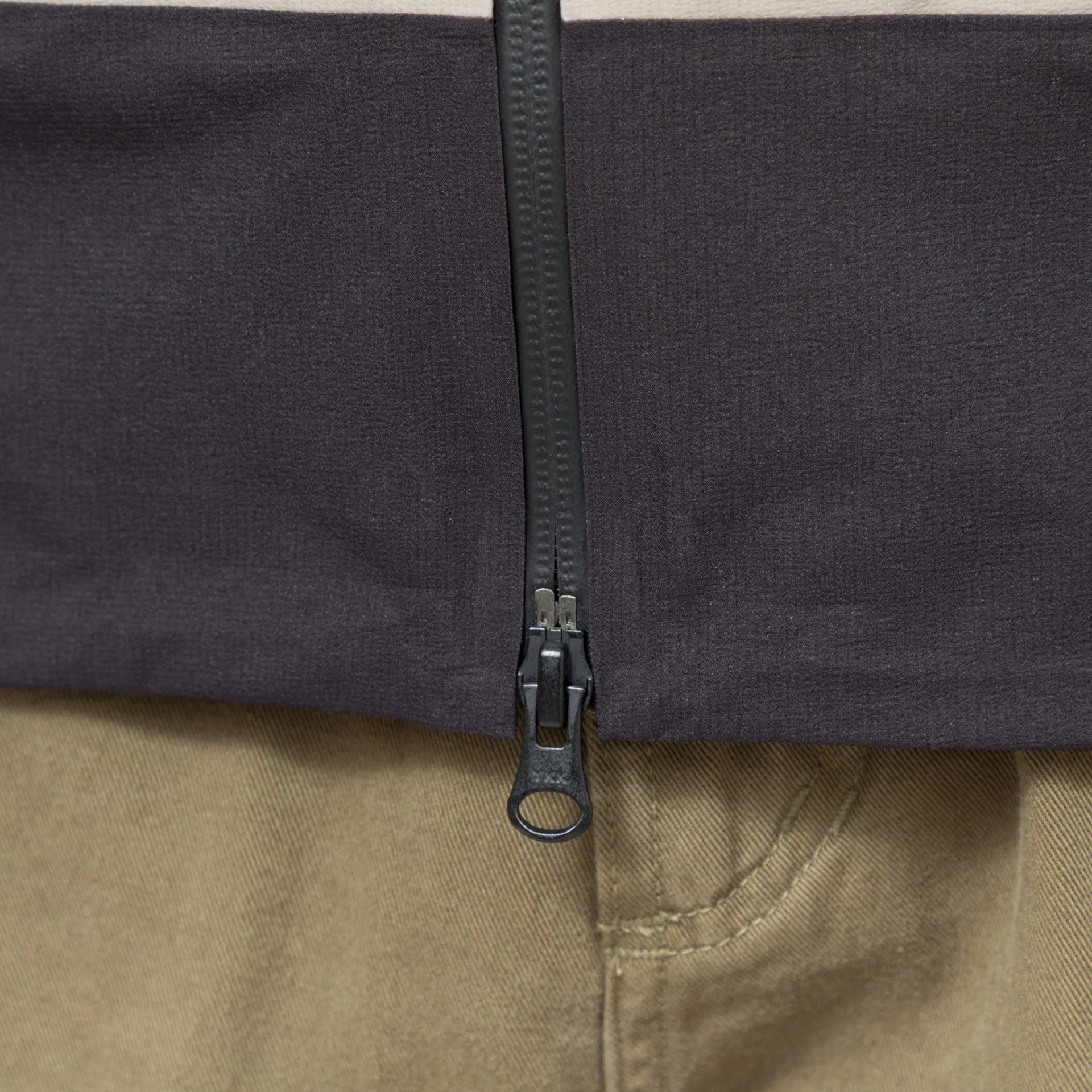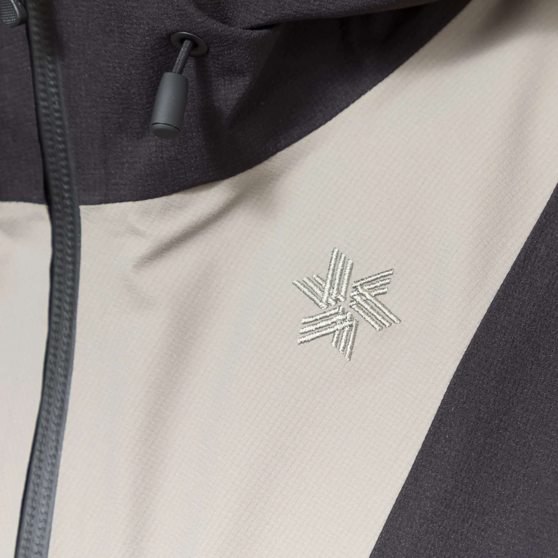 It has a full zip-through front, leading up to an adjustable hood, with drawcords at the hem and velcro at the hood to adjust the fit. It has ergonomically designed sleeves, following natural body movement, with forward set-sleeve construction for freedom of movement. It has an additional inner layer at the collar to help reduce fabric wear, front panel seam lines inspired by the Goldwin logo symbol, two zipped pockets and a single inside-out mesh pocket. The design is complete with a tonal Goldwin logo.