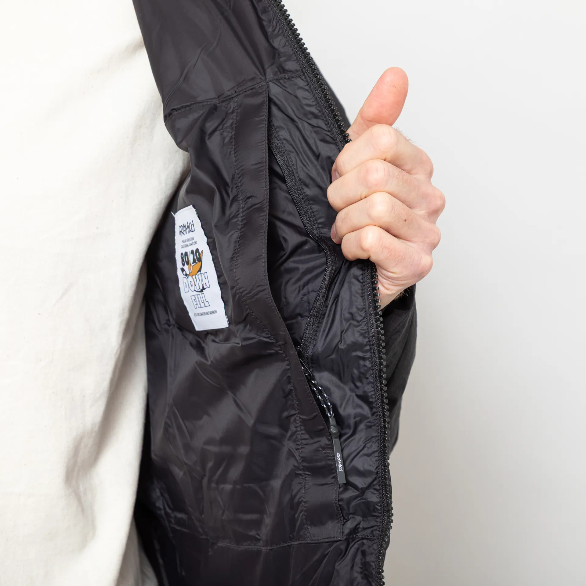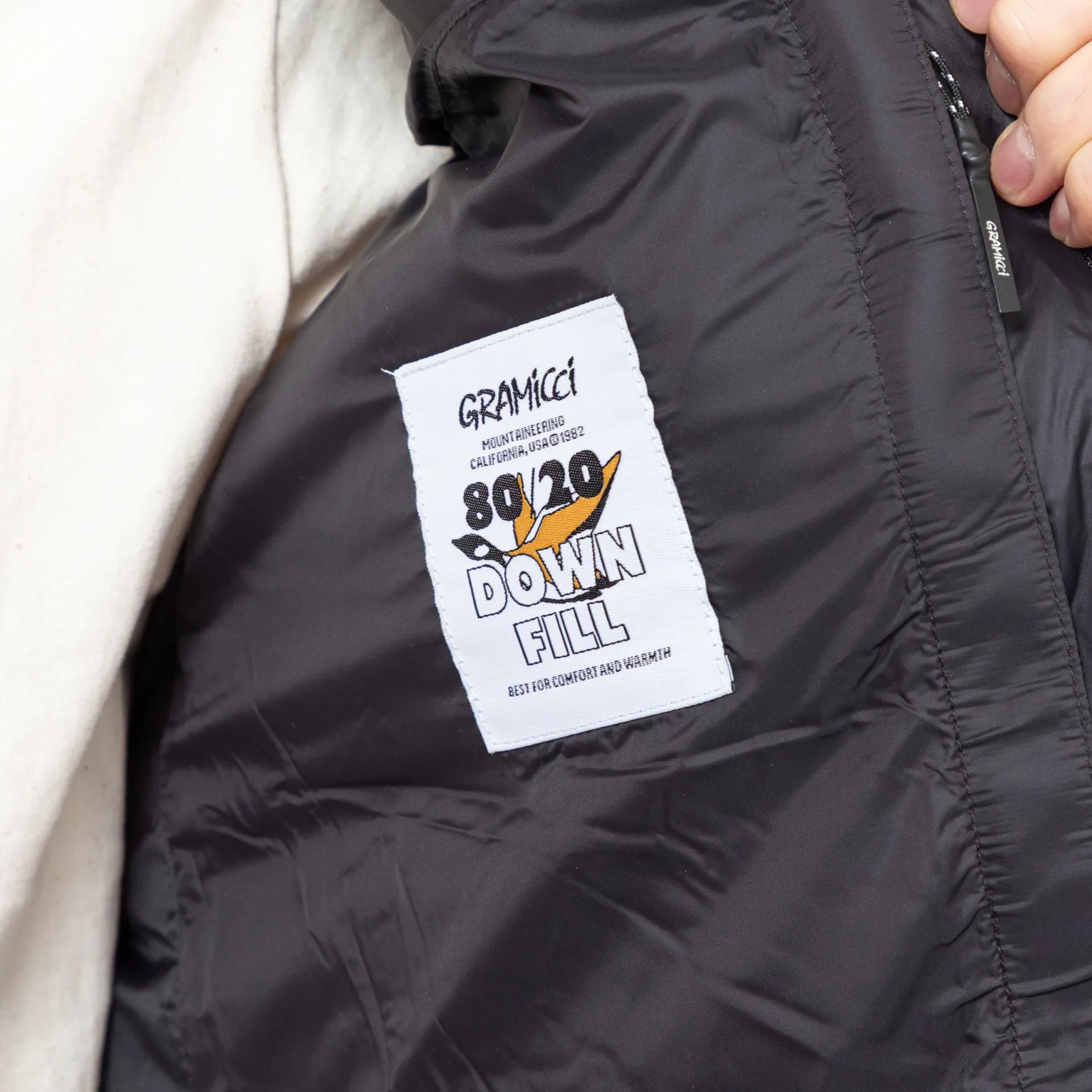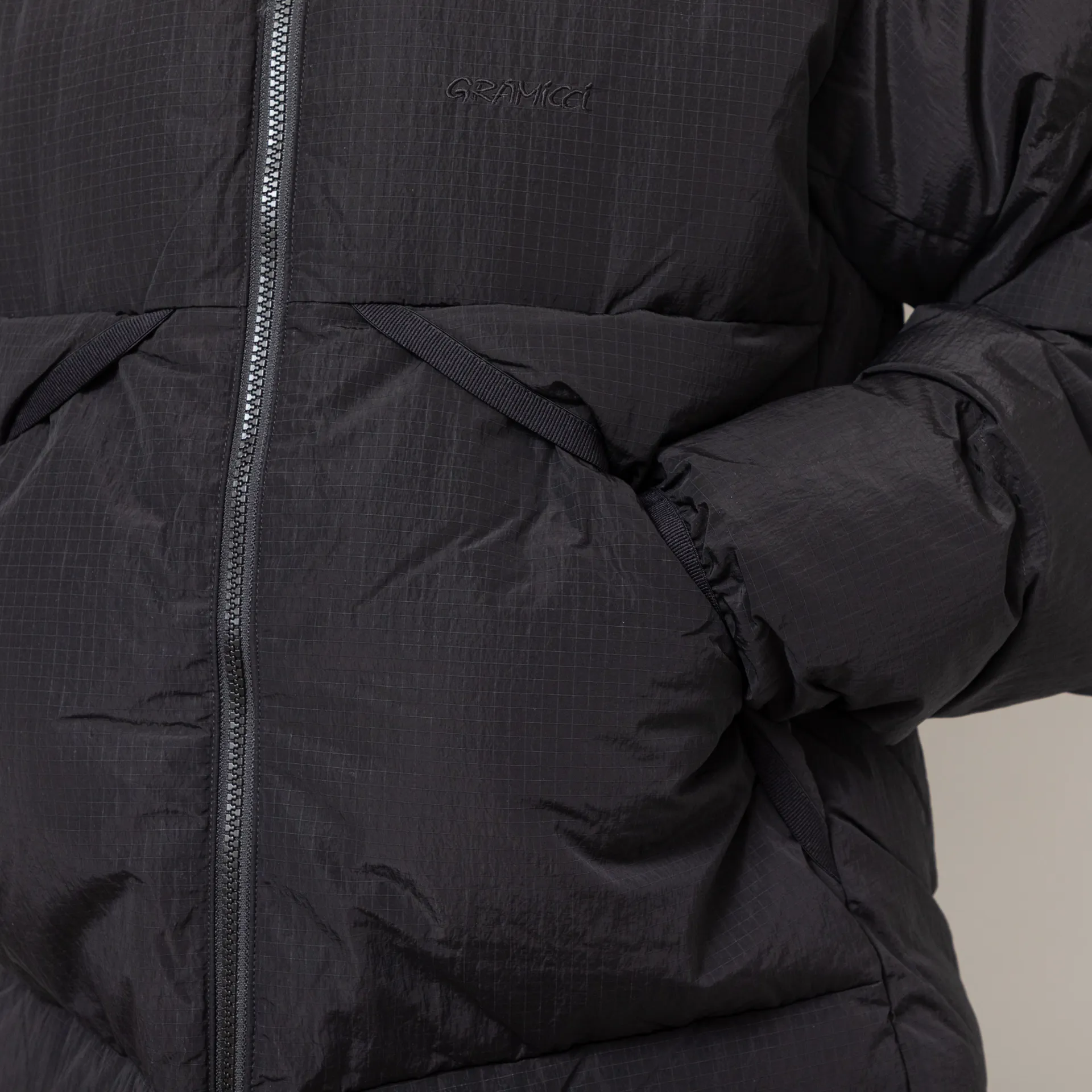 A mountaineering-inspired down jacket from Gramicci, constructed with a nylon outer shell and filled with toasty 80% down, 20% feather insulation.