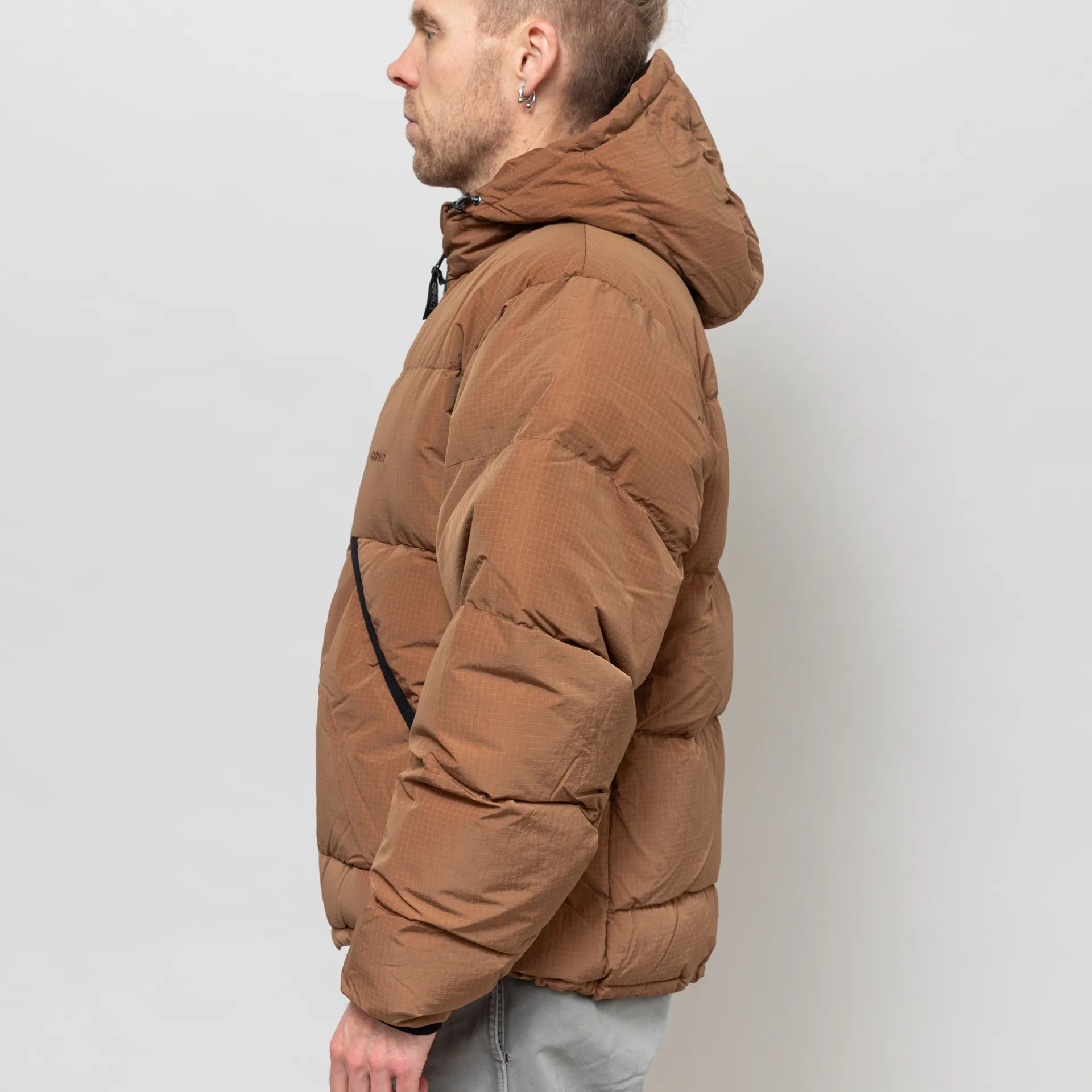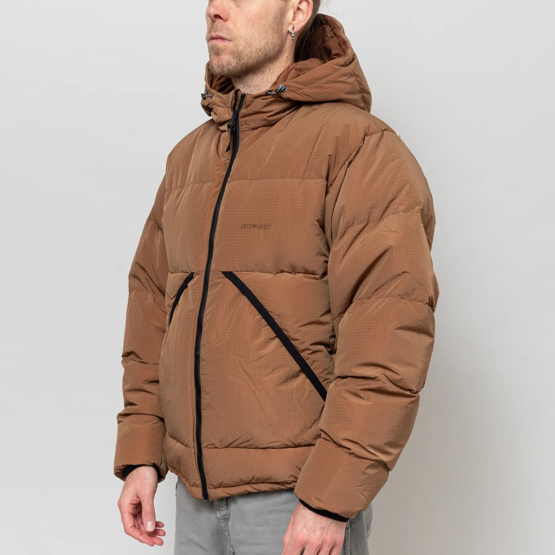 A mountaineering-inspired down jacket from Gramicci, constructed with a nylon outer shell and filled with toasty 80% down, 20% feather insulation. It features a full zip-through front, leading up to an adjustable hood, with elasticated cuffs to help keep the draught out. It has two large zipped hand pockets, a single internal pocket for security and is finished off with a tonal embroidered logo at the chest.