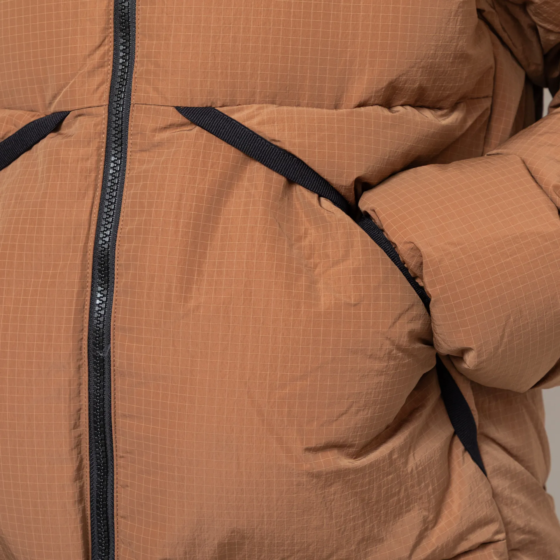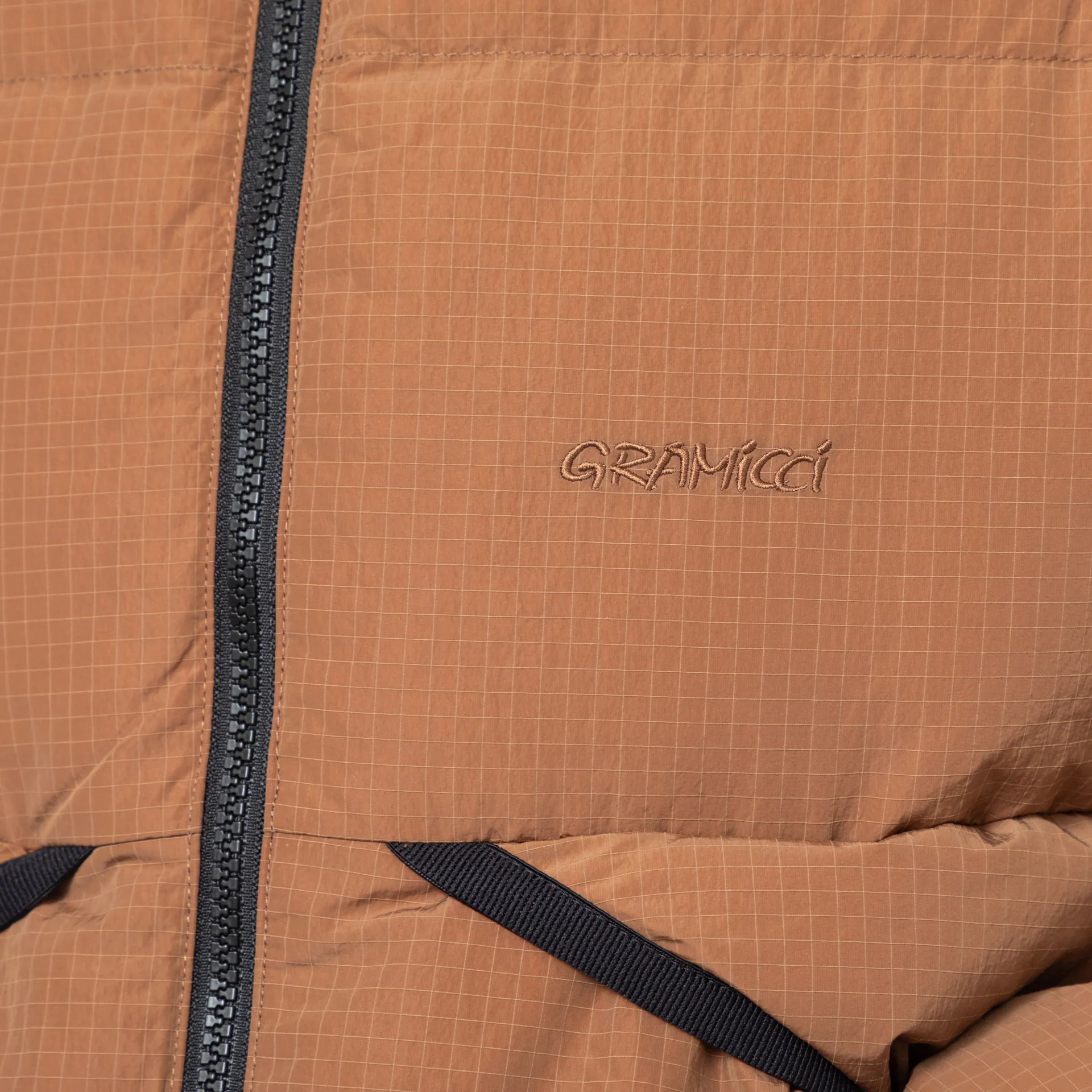 A mountaineering-inspired down jacket from Gramicci, constructed with a nylon outer shell and filled with toasty 80% down, 20% feather insulation.