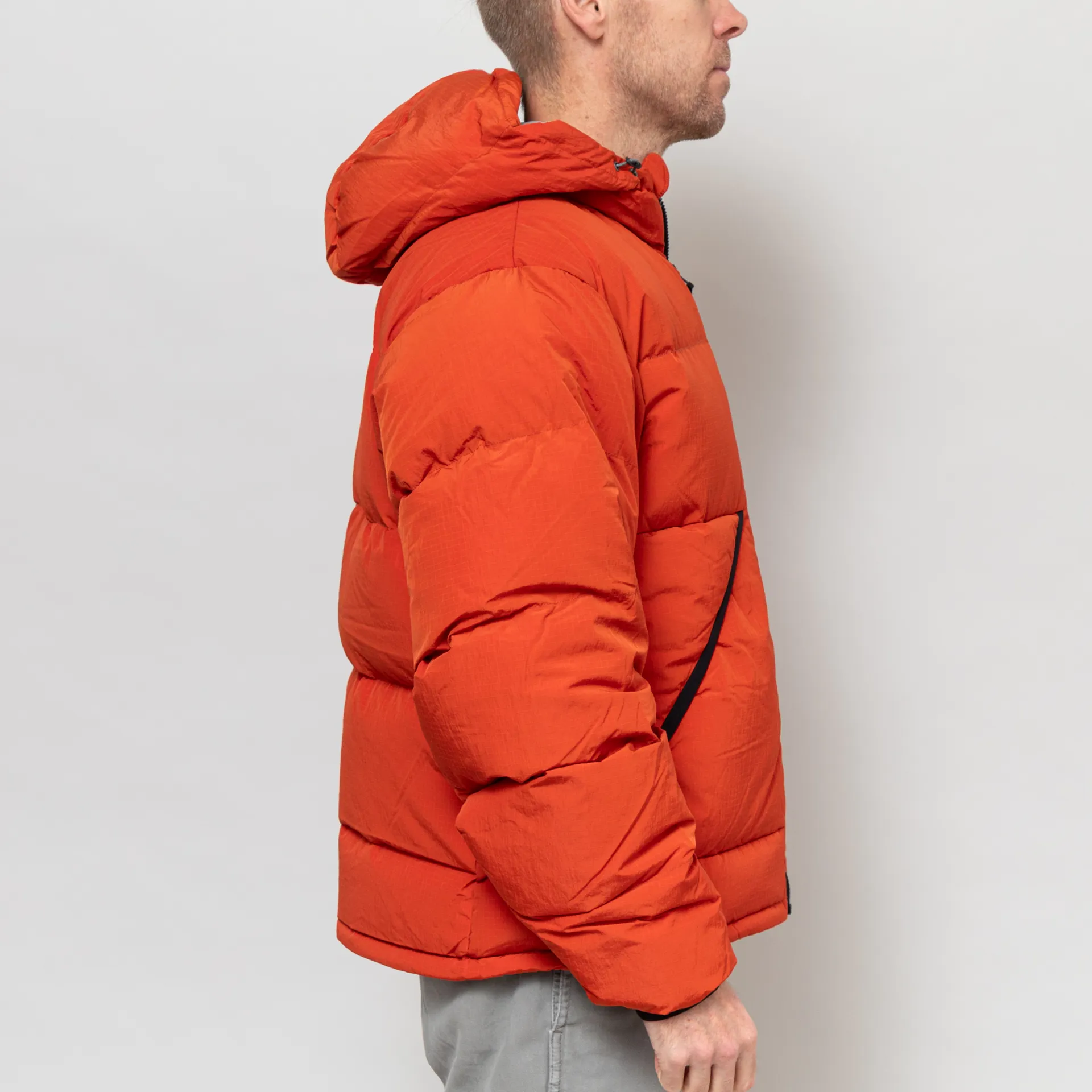 A mountaineering-inspired down jacket from Gramicci, constructed with a nylon outer shell and filled with toasty 80% down, 20% feather insulation. It features a full zip-through front, leading up to an adjustable hood, with elasticated cuffs to help keep the draught out. It has two large zipped hand pockets, a single internal pocket for security and is finished off with a tonal embroidered logo at the chest.