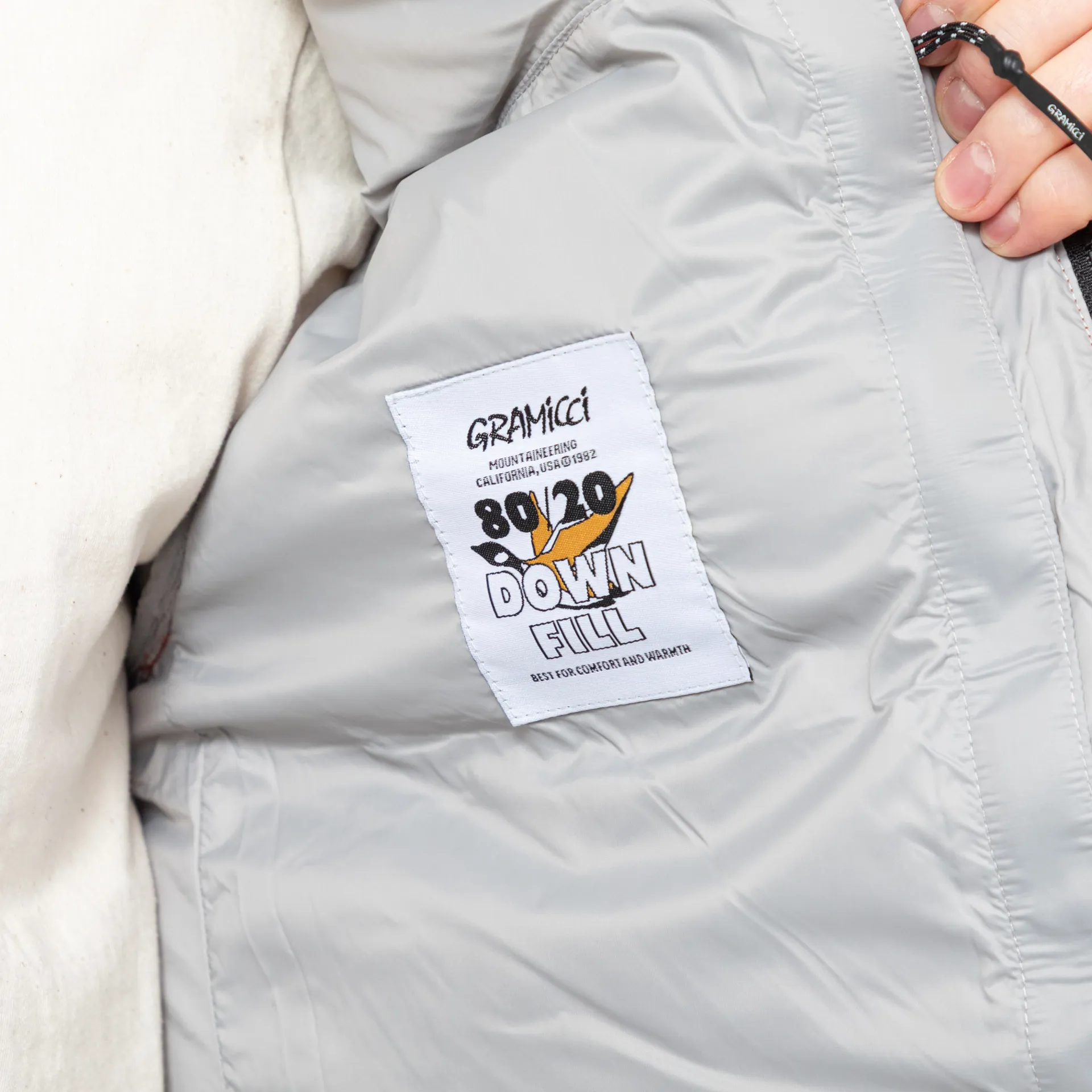 A mountaineering-inspired down jacket from Gramicci, constructed with a nylon outer shell and filled with toasty 80% down, 20% feather insulation.