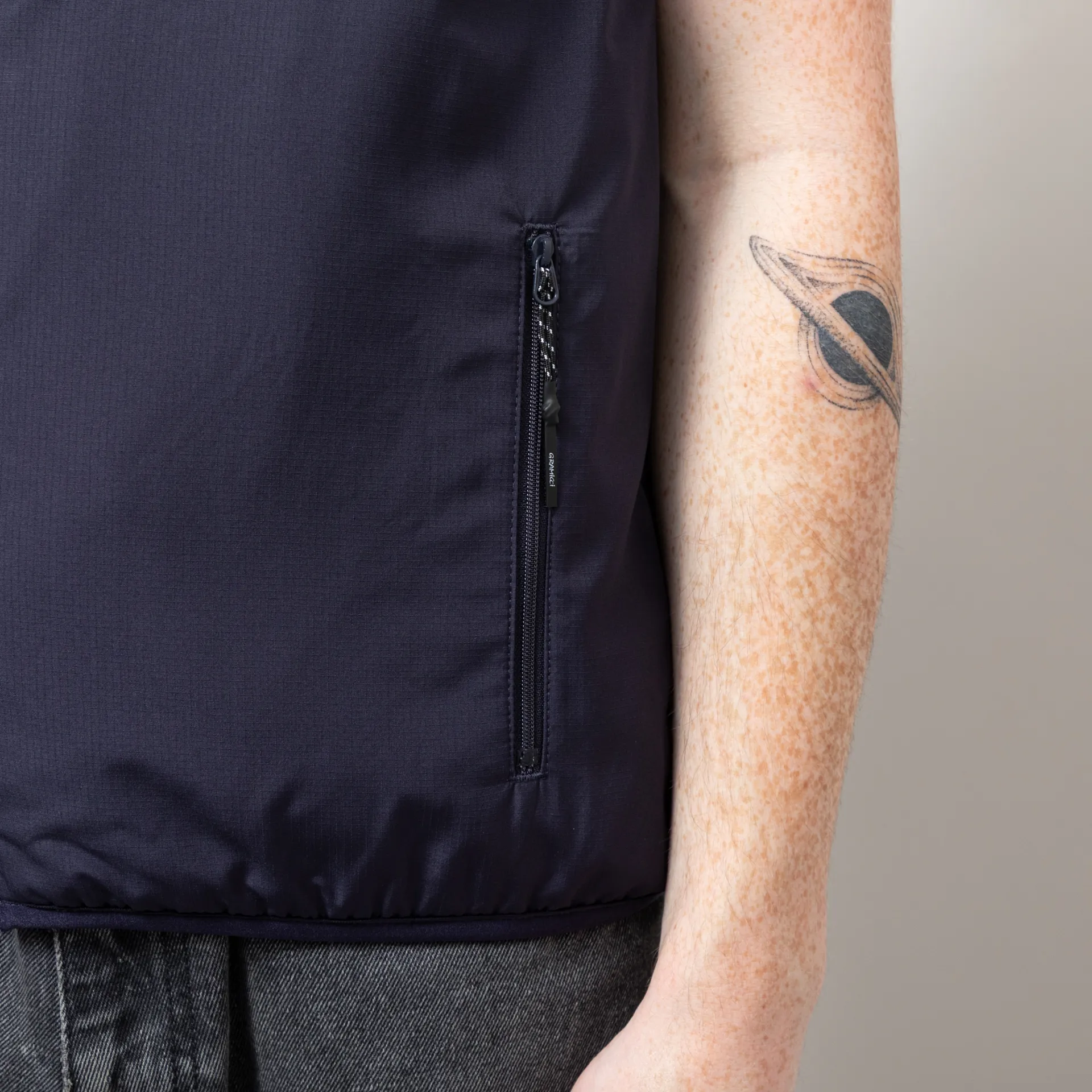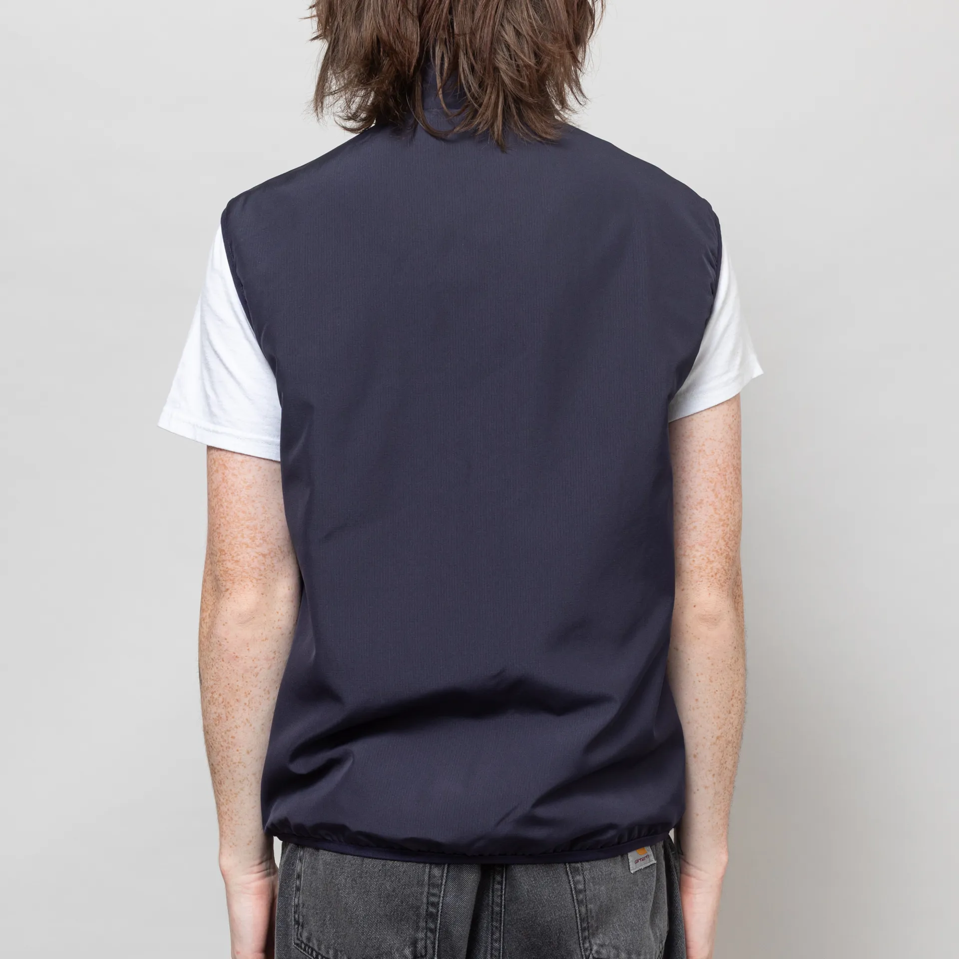 A reversible fleece vest from Gramicci, constructed with a water-repellent ripstop outer and a recycled polyester fleece lining with an all-over striped design.