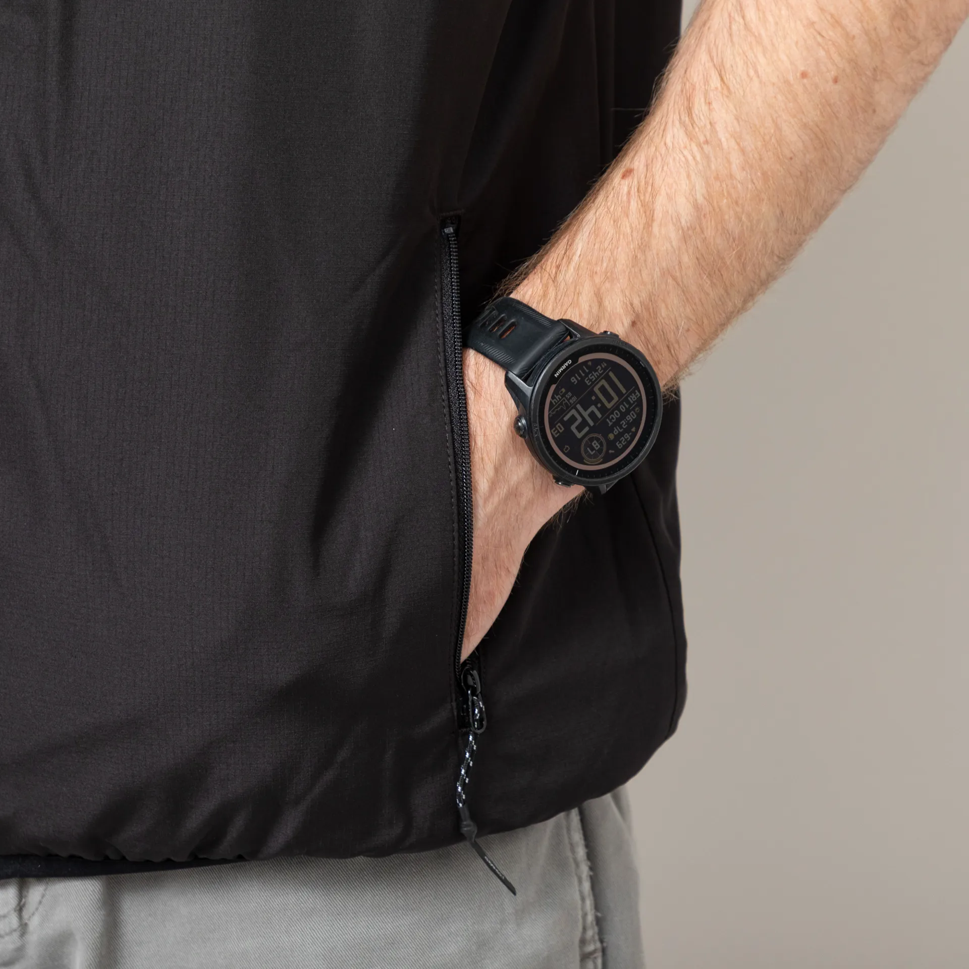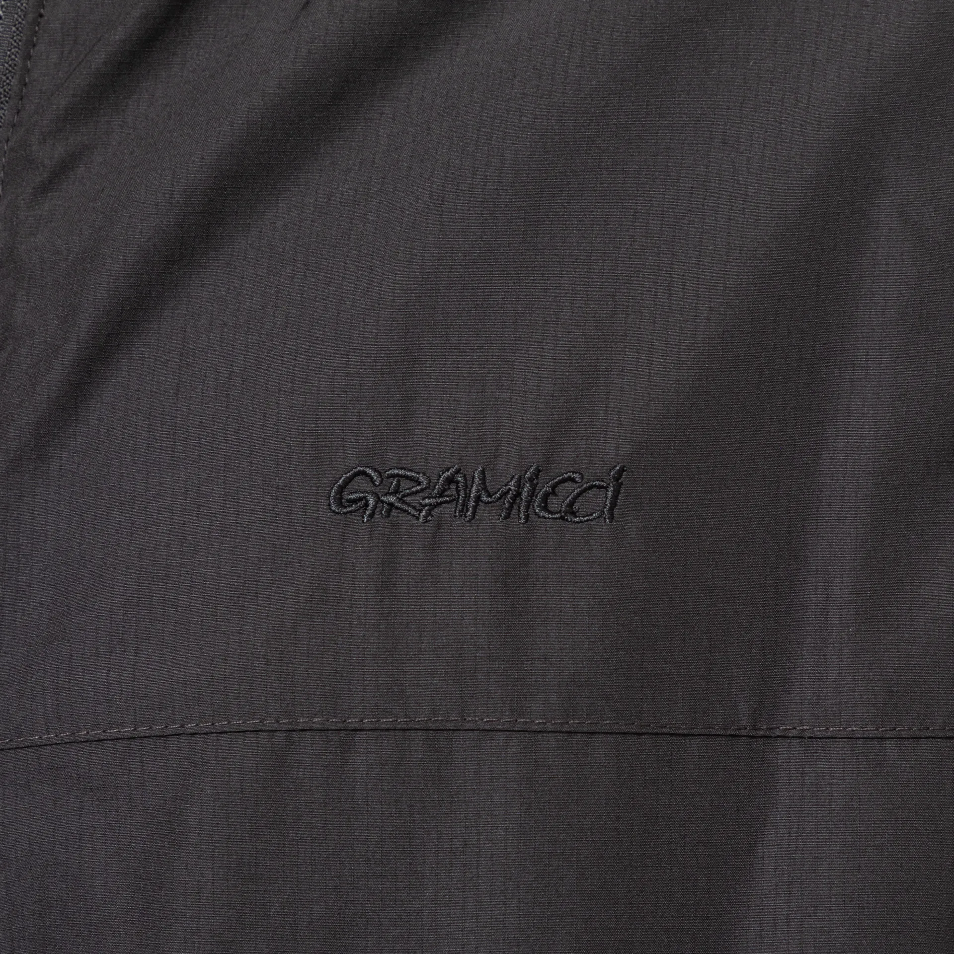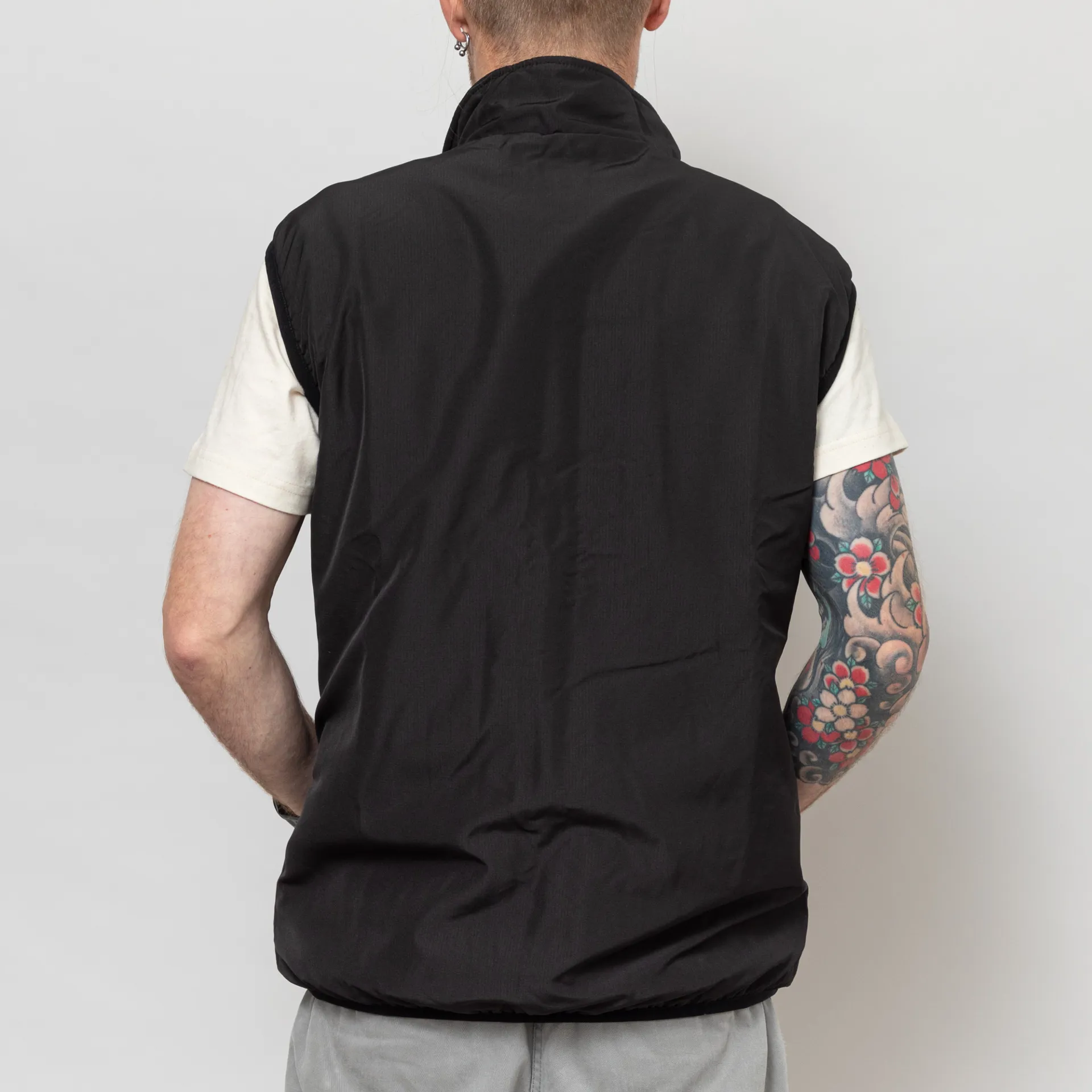 A reversible fleece vest from Gramicci, constructed with a water-repellent ripstop outer and a recycled polyester fleece lining with an all-over striped design.