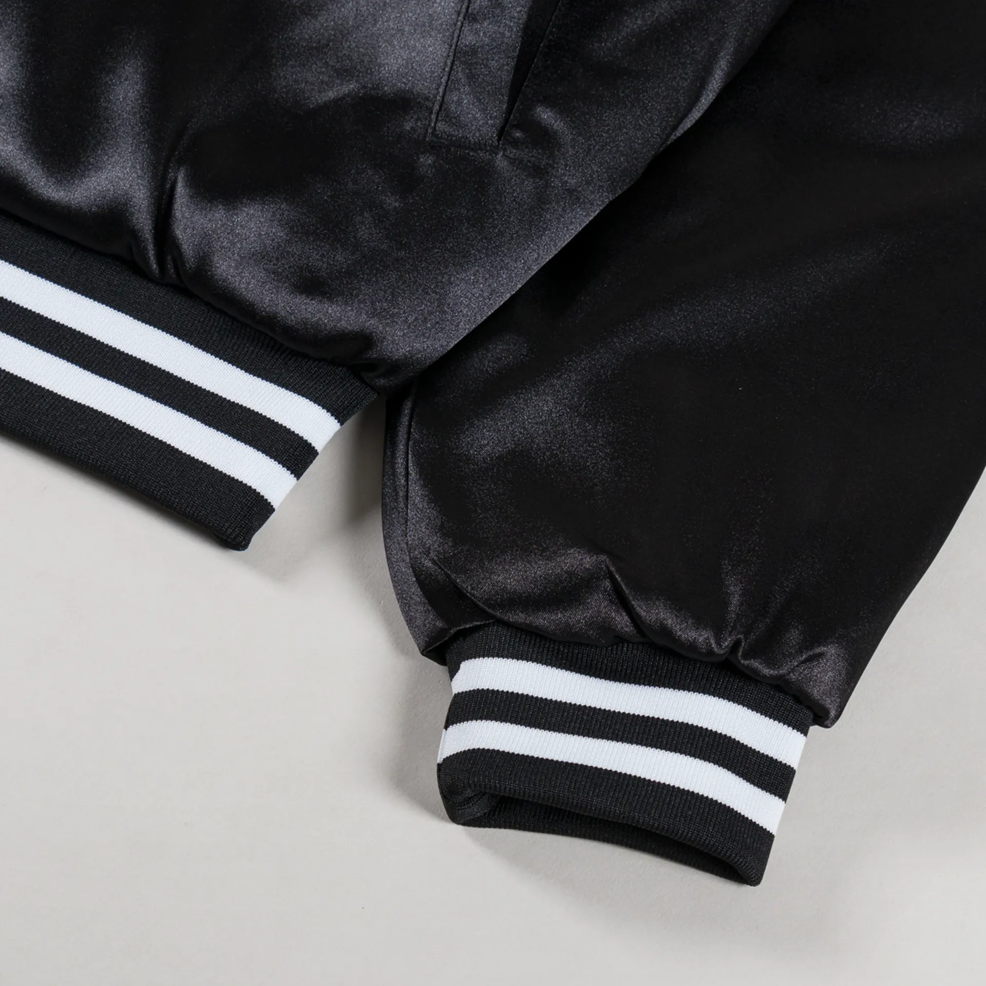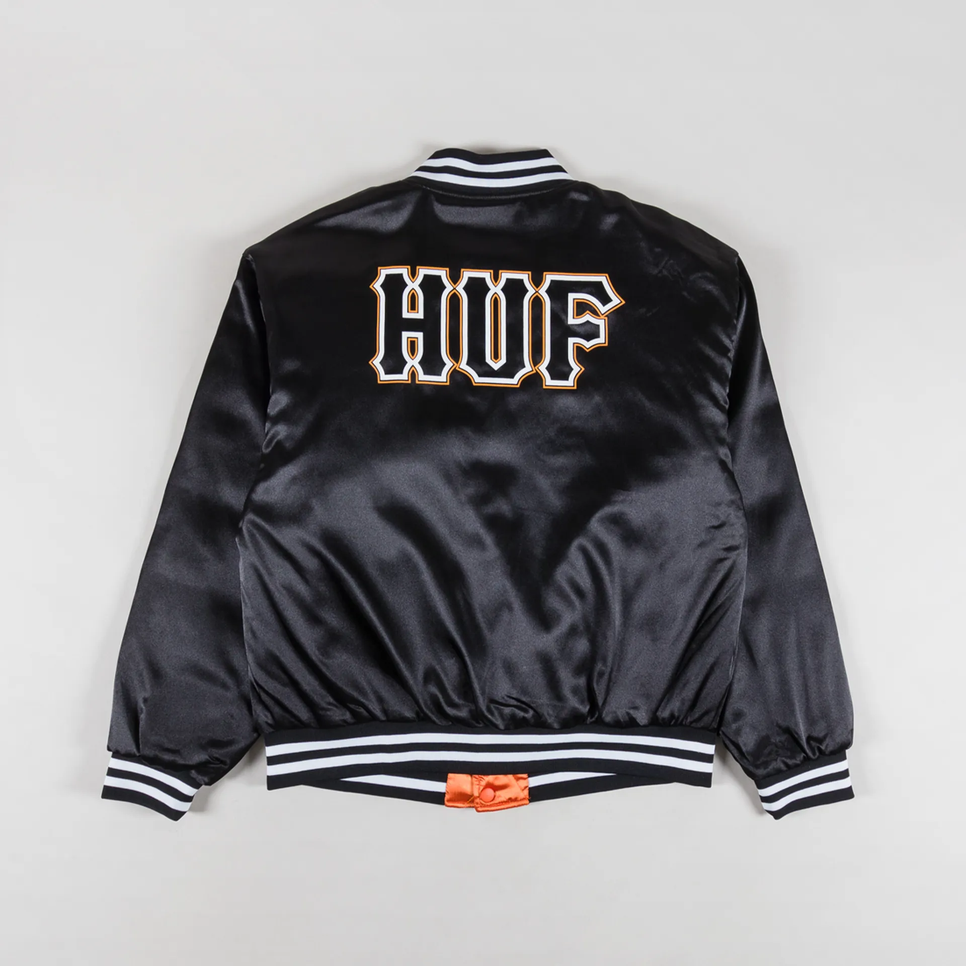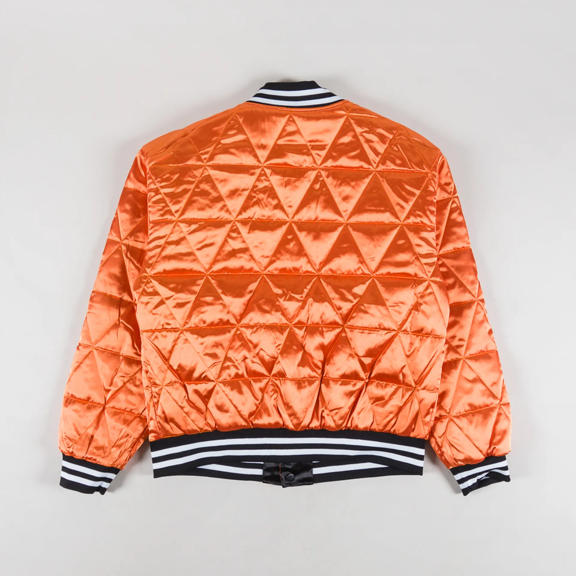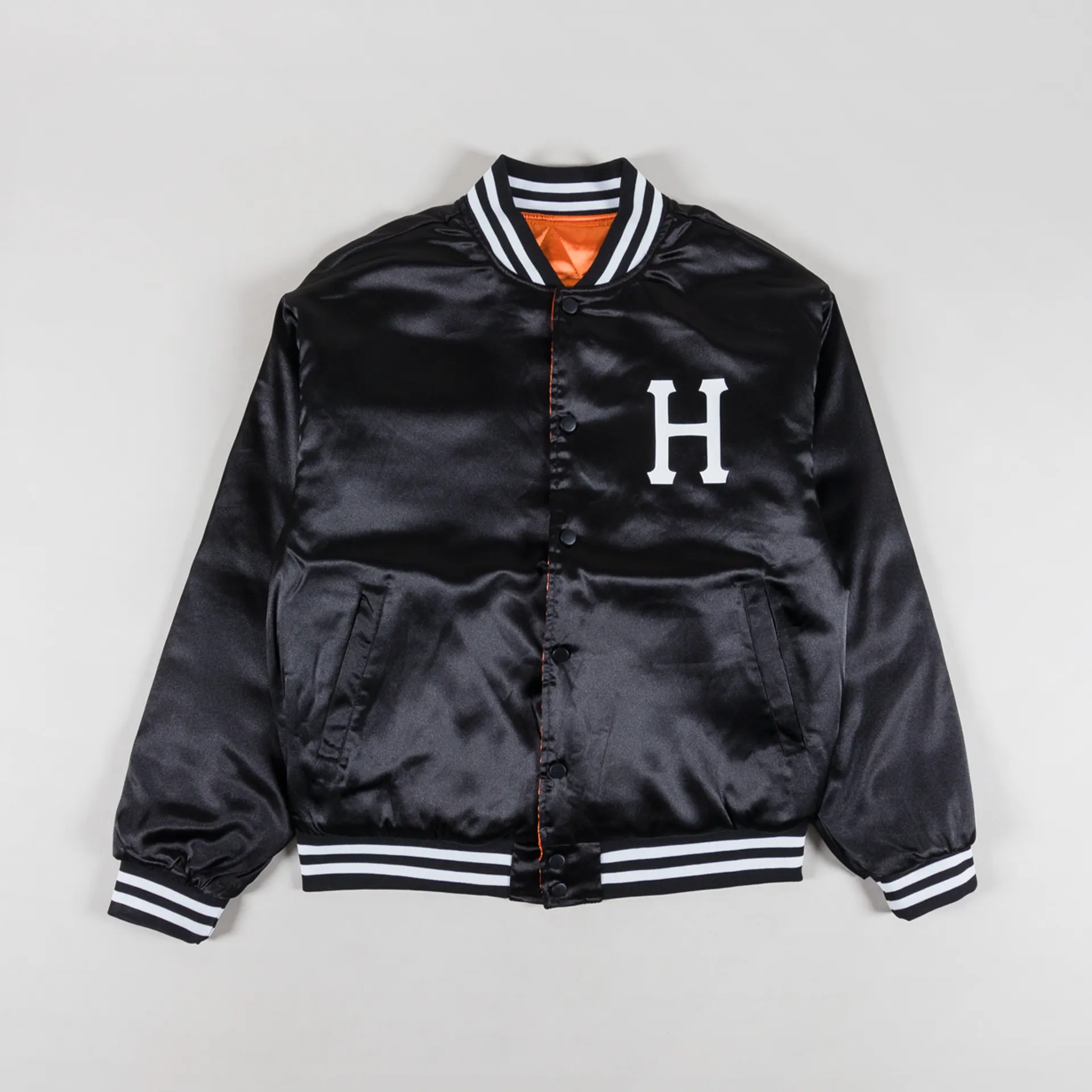 The Back 2 Back Jacket from Huf has been cut in a regular fit for everyday comfort, crafted from satin-like 100% polyester. Both sides feature a snap-button through front, leading up to a striped ribbed collar, elasticated cuffs and hem, with dual front welt pockets. The outer side features a H patch to the chest and a large Huf logo to the back, while the reverse side is quilted throughout, with the signature Huf triangle logo to the chest.