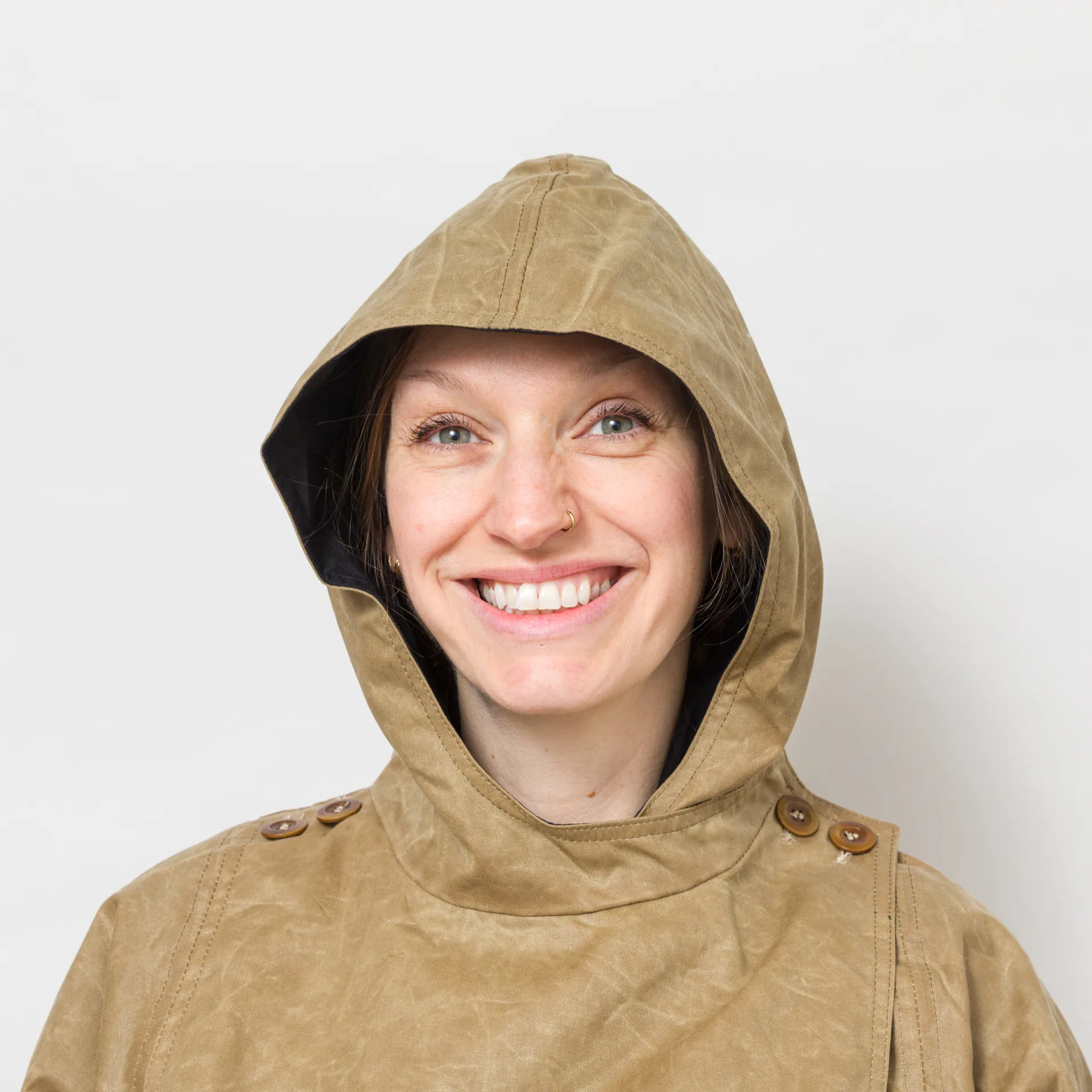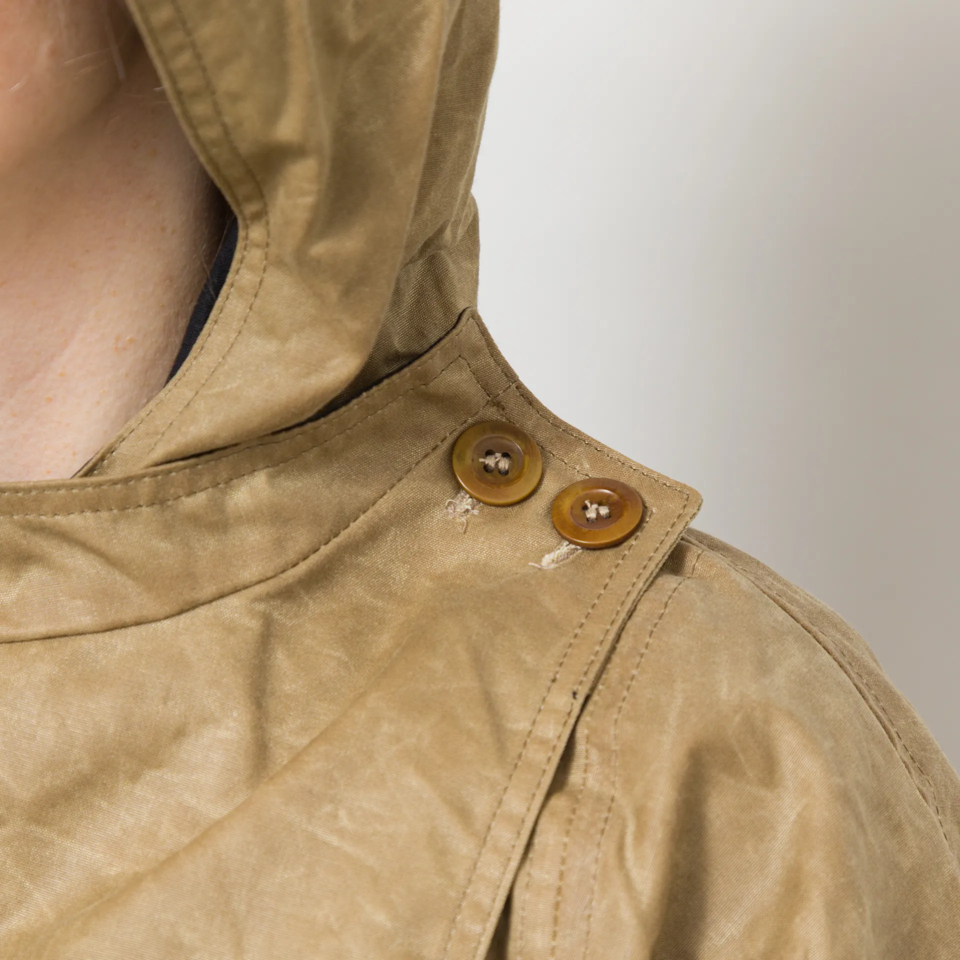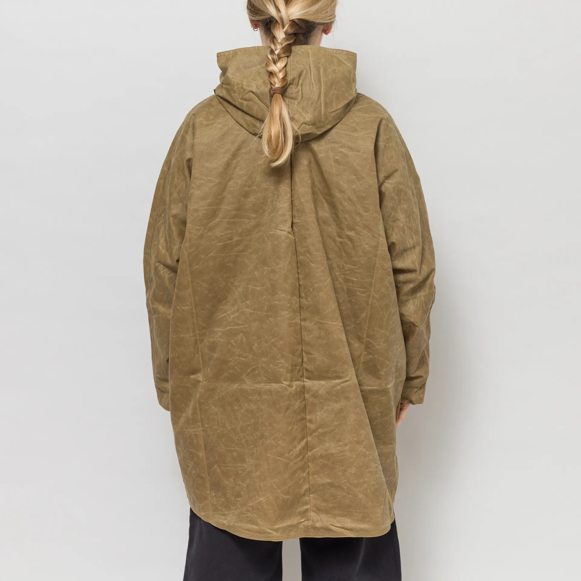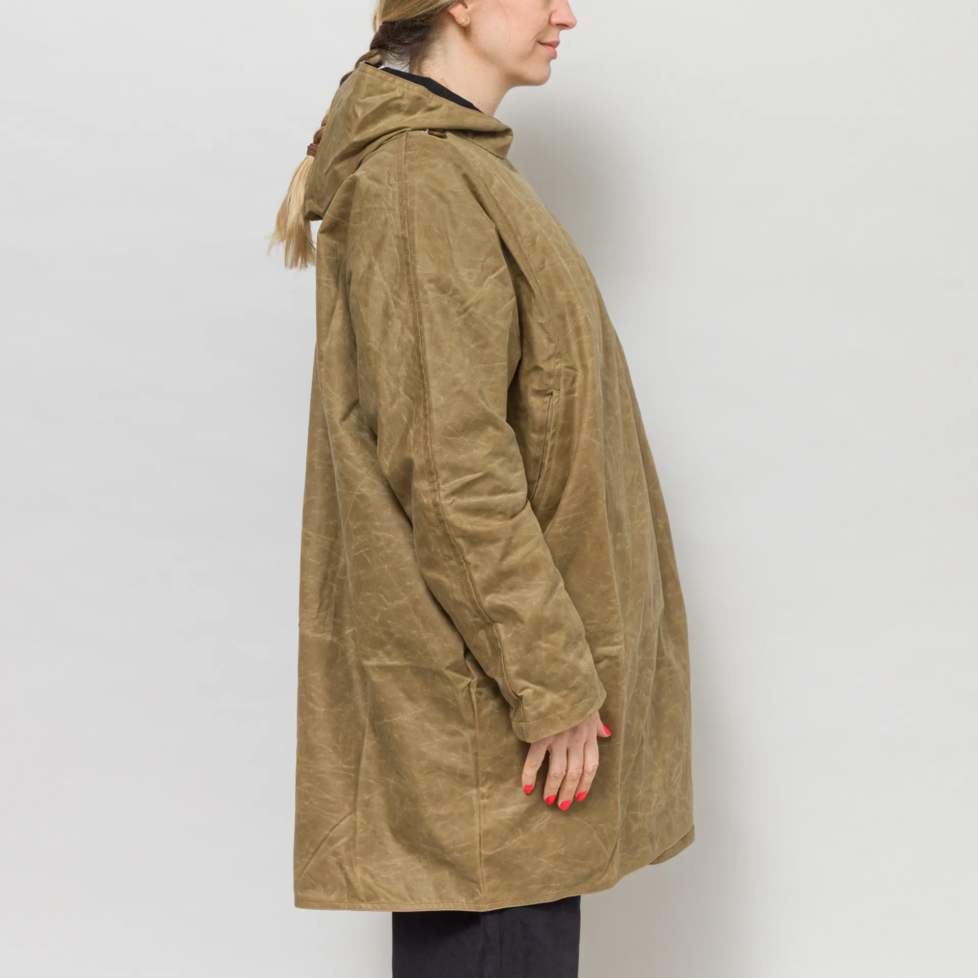 A batwing coat from Kate Sheridan, constructed with Halley Stevenson antique style water resistant waxed cotton. It's cut in an oversized fit, with batwing sleeves, a large hood and deep side pockets. It's fastened by overlapping the front panels that button up on the shoulders. This is a super versatile piece and can be worn fully fastened, fully open or with the sleeves rolled up to show off the lining.