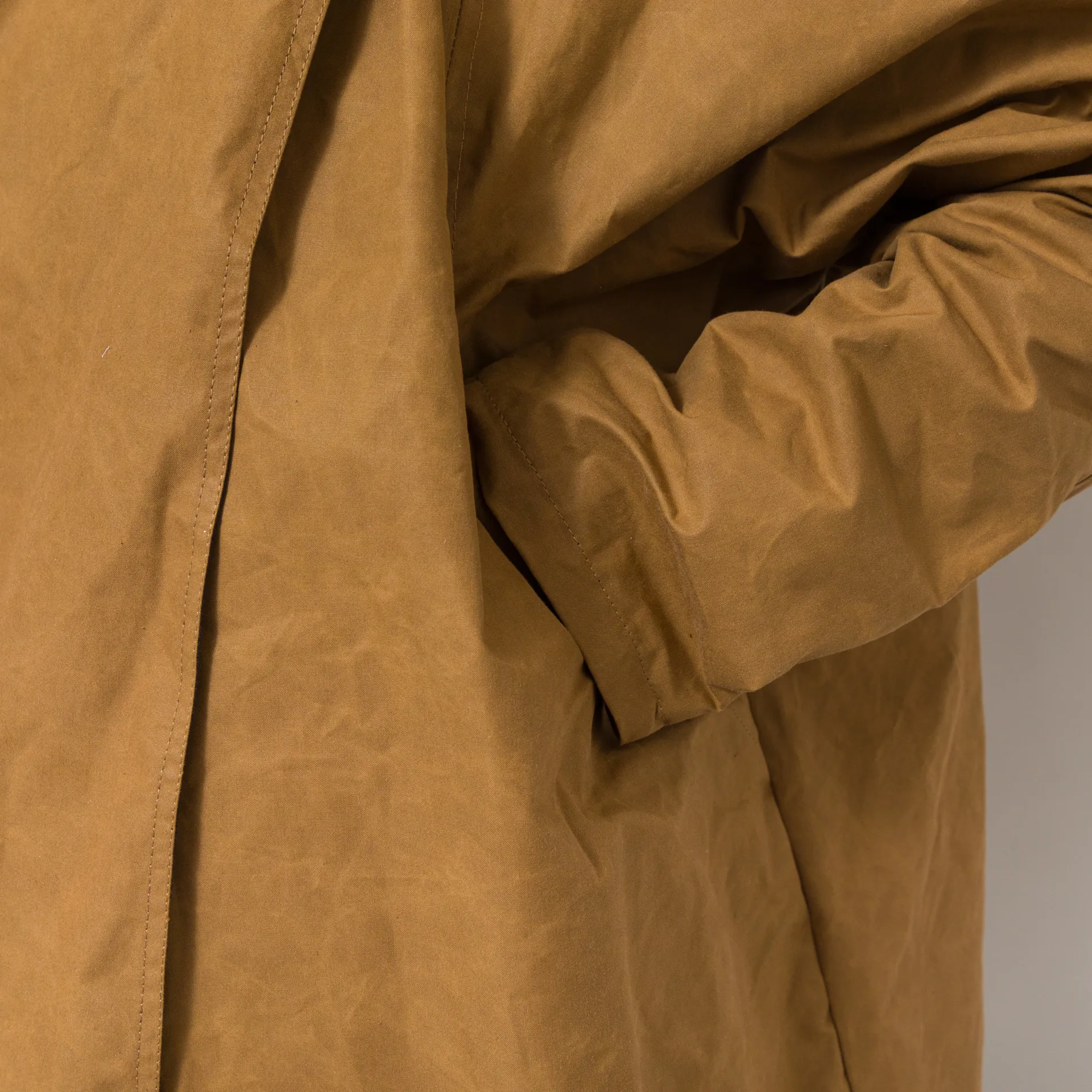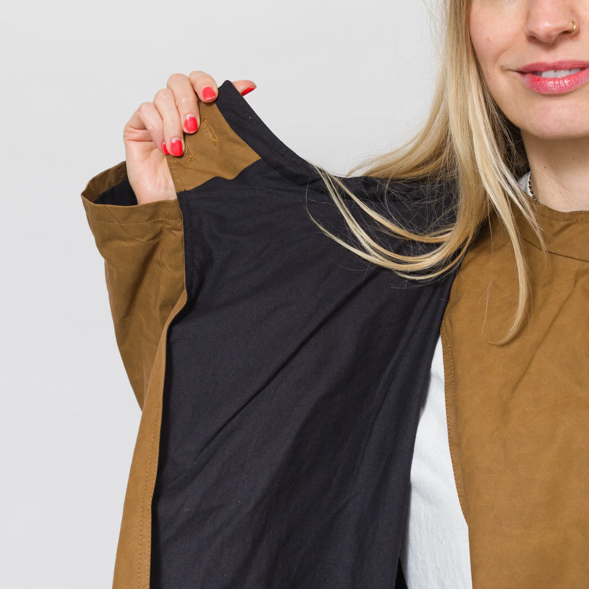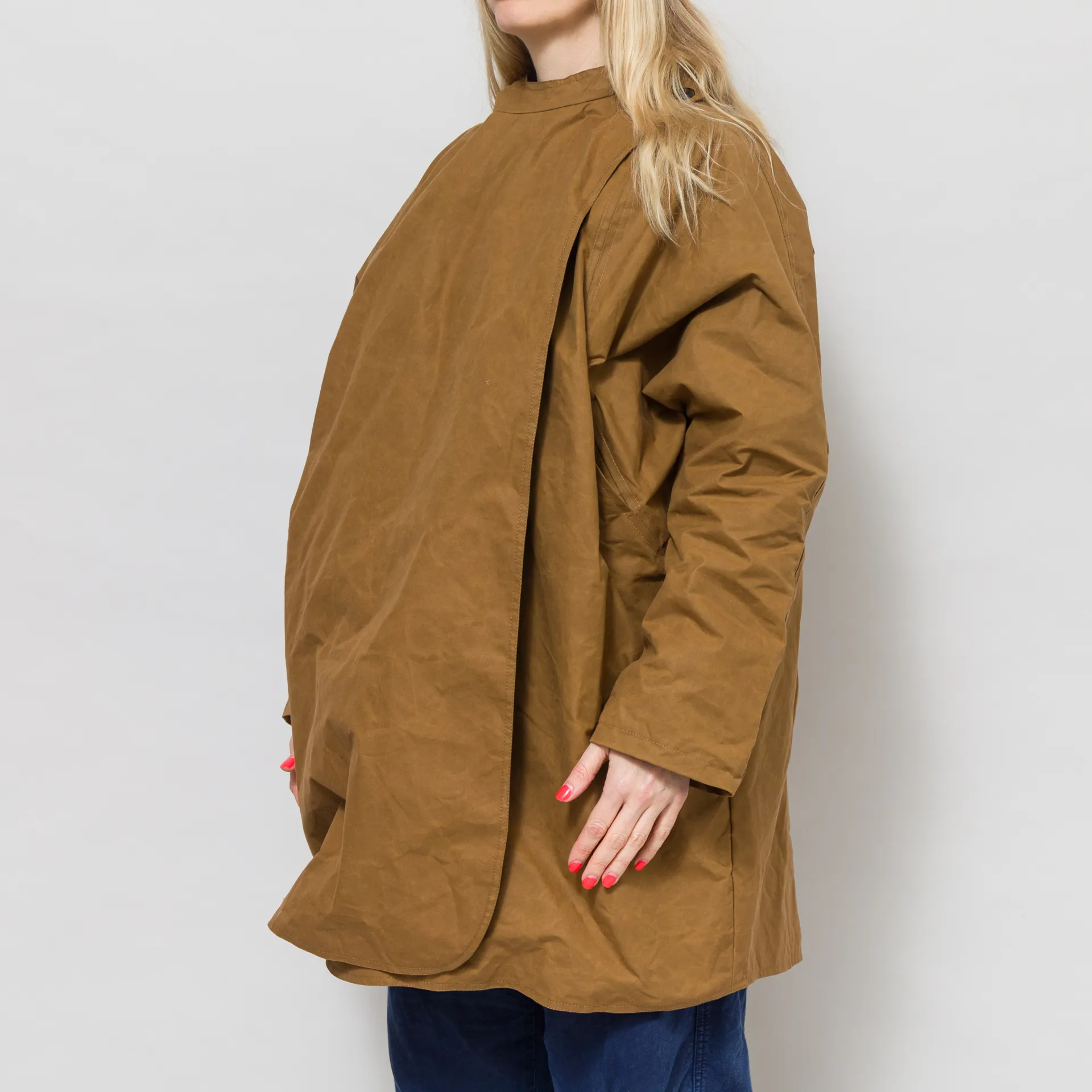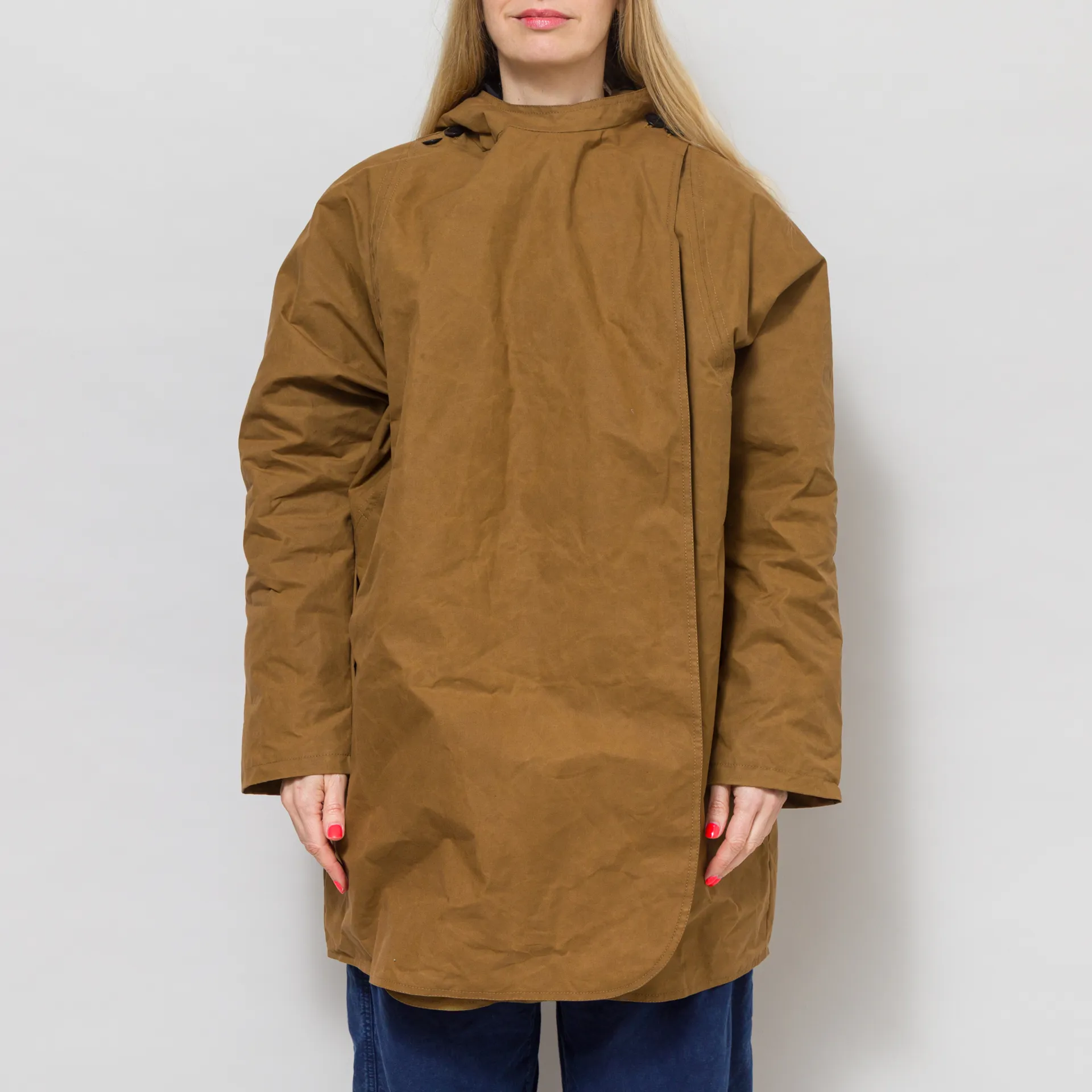 A batwing coat from Kate Sheridan, constructed with Halley Stevenson antique style water resistant waxed cotton. It's cut in an oversized fit, with batwing sleeves, a large hood and deep side pockets. It's fastened by overlapping the front panels that button up on the shoulders. This is a super versatile piece and can be worn fully fastened, fully open or with the sleeves rolled up to show off the lining.