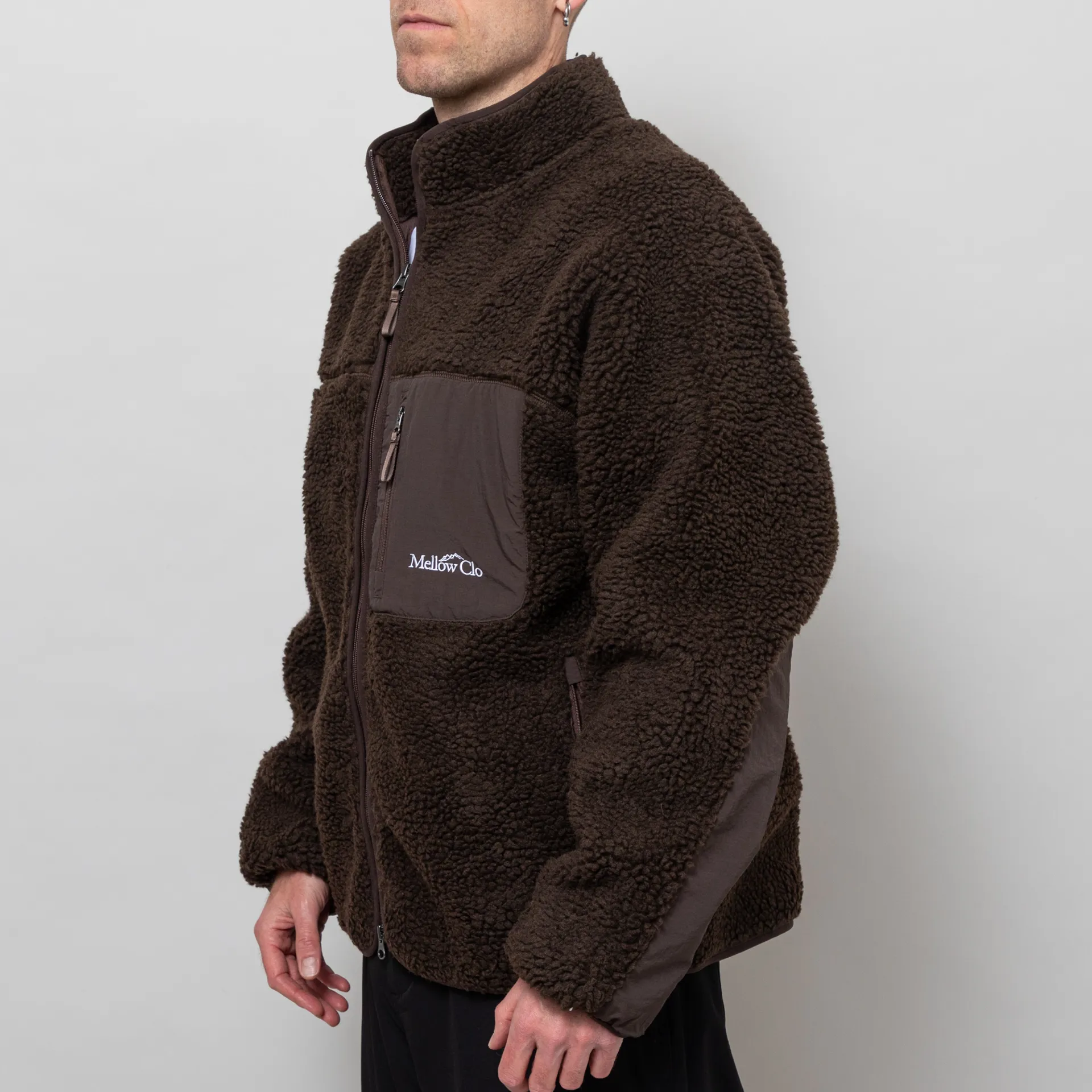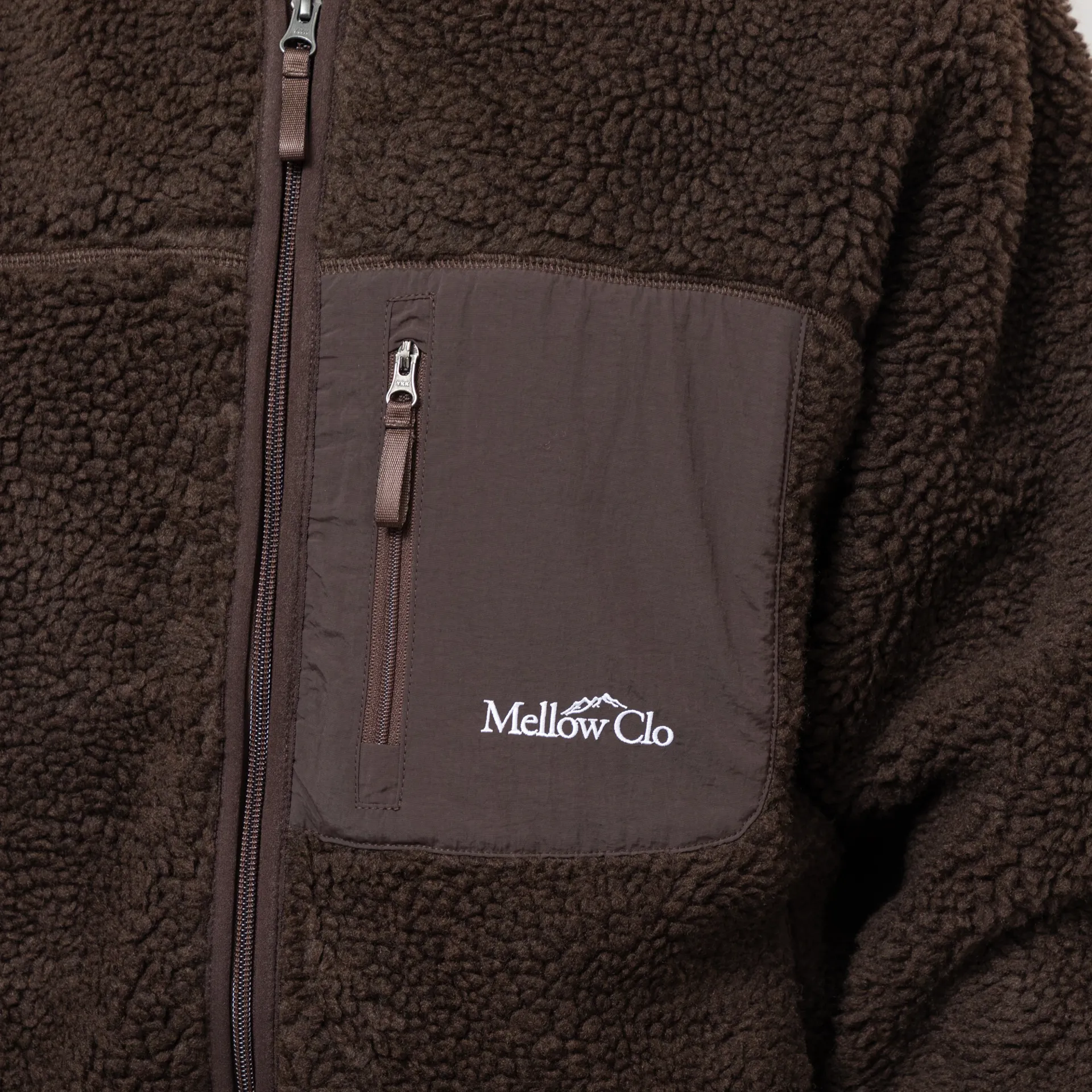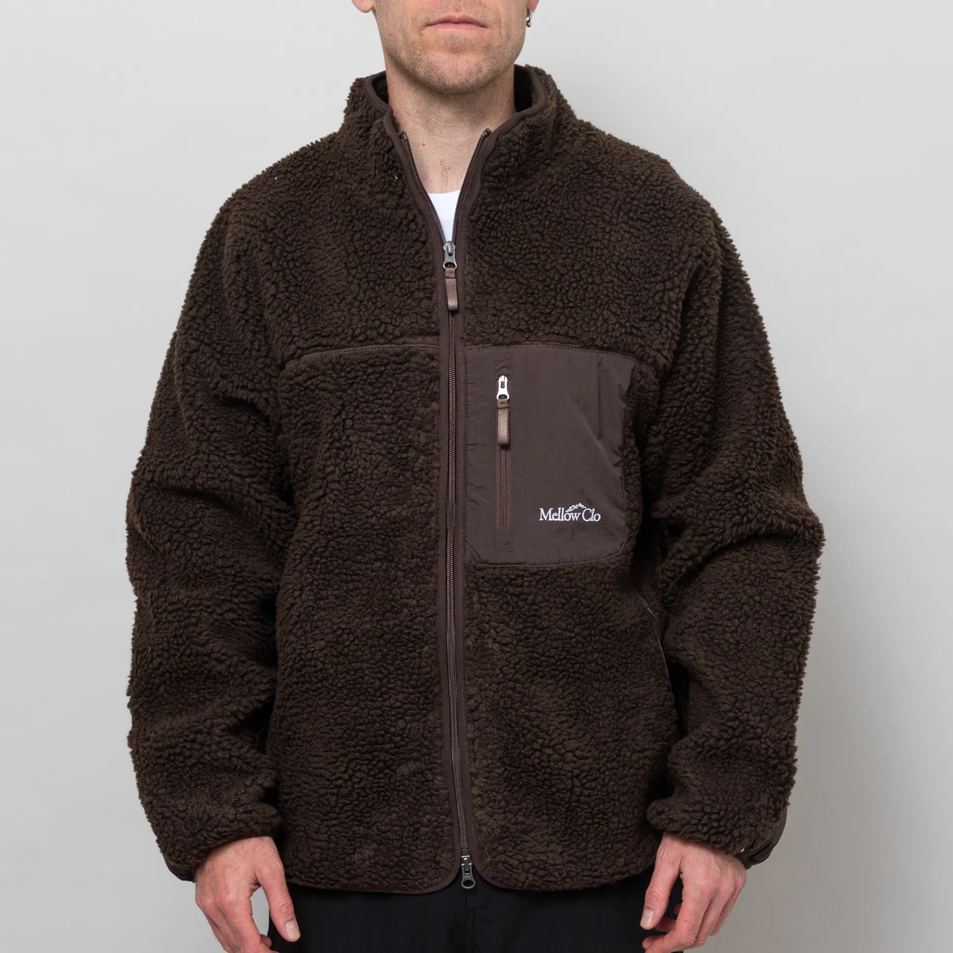 A zip-through fleece from Mellow Clo, constructed from deep pile borg and cut in a loose, boxy fit for a laidback silhouette. It features a classic stand collar, a two-way YKK zipper, contrasting nylon patches at the elbows and chest. The design is complete with two hand pockets, a single chest pocket and an embroidered Mellow Clo logo.