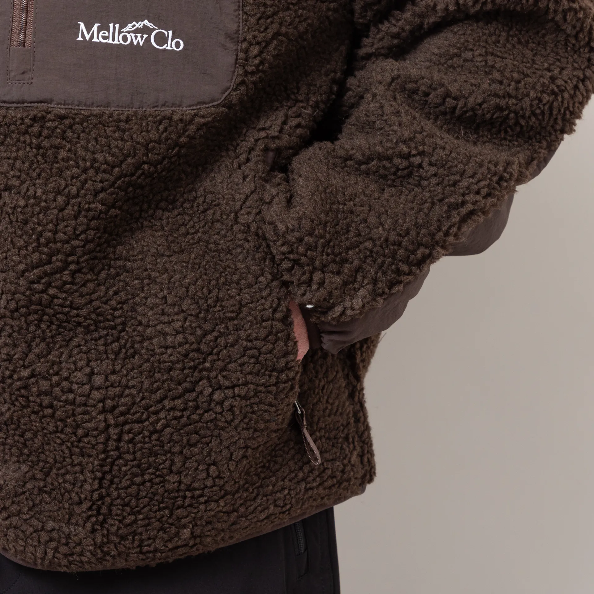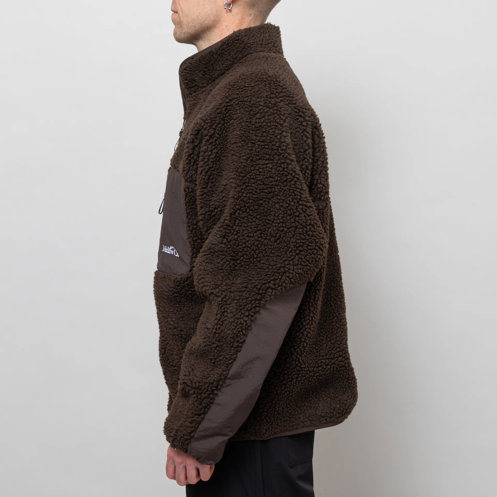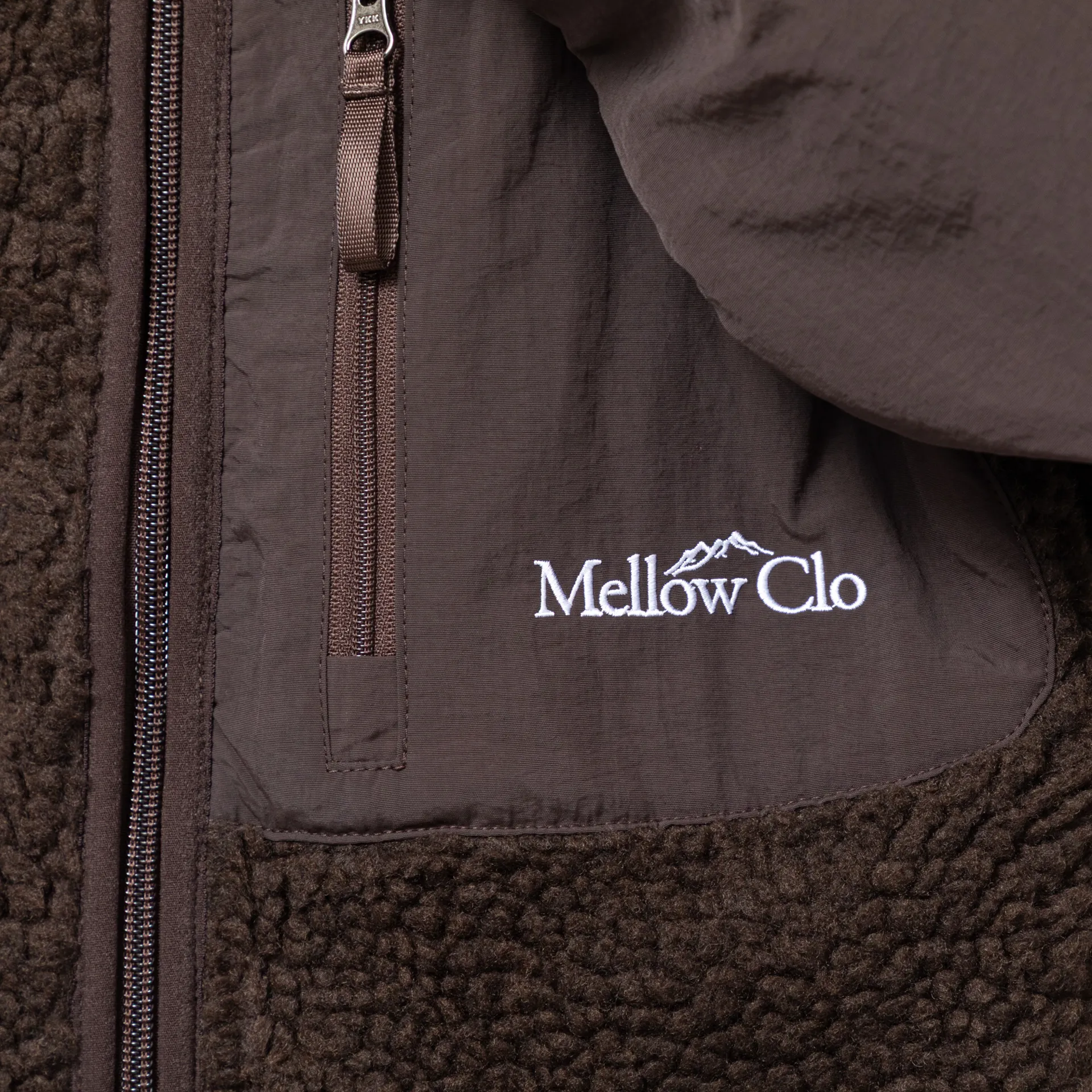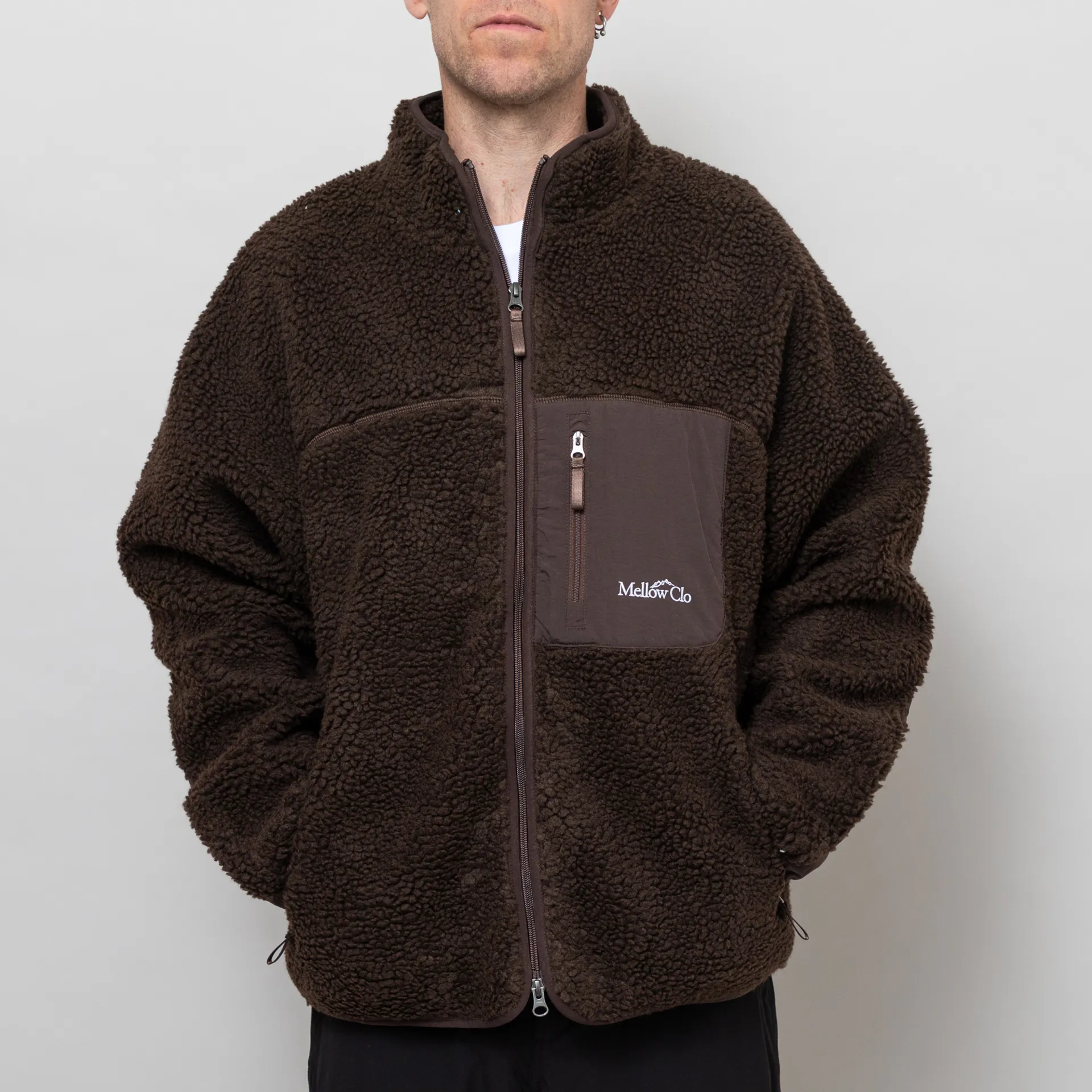 A zip-through fleece from Mellow Clo, constructed from deep pile borg and cut in a loose, boxy fit for a laidback silhouette. It features a classic stand collar, a two-way YKK zipper, contrasting nylon patches at the elbows and chest. The design is complete with two hand pockets, a single chest pocket and an embroidered Mellow Clo logo.