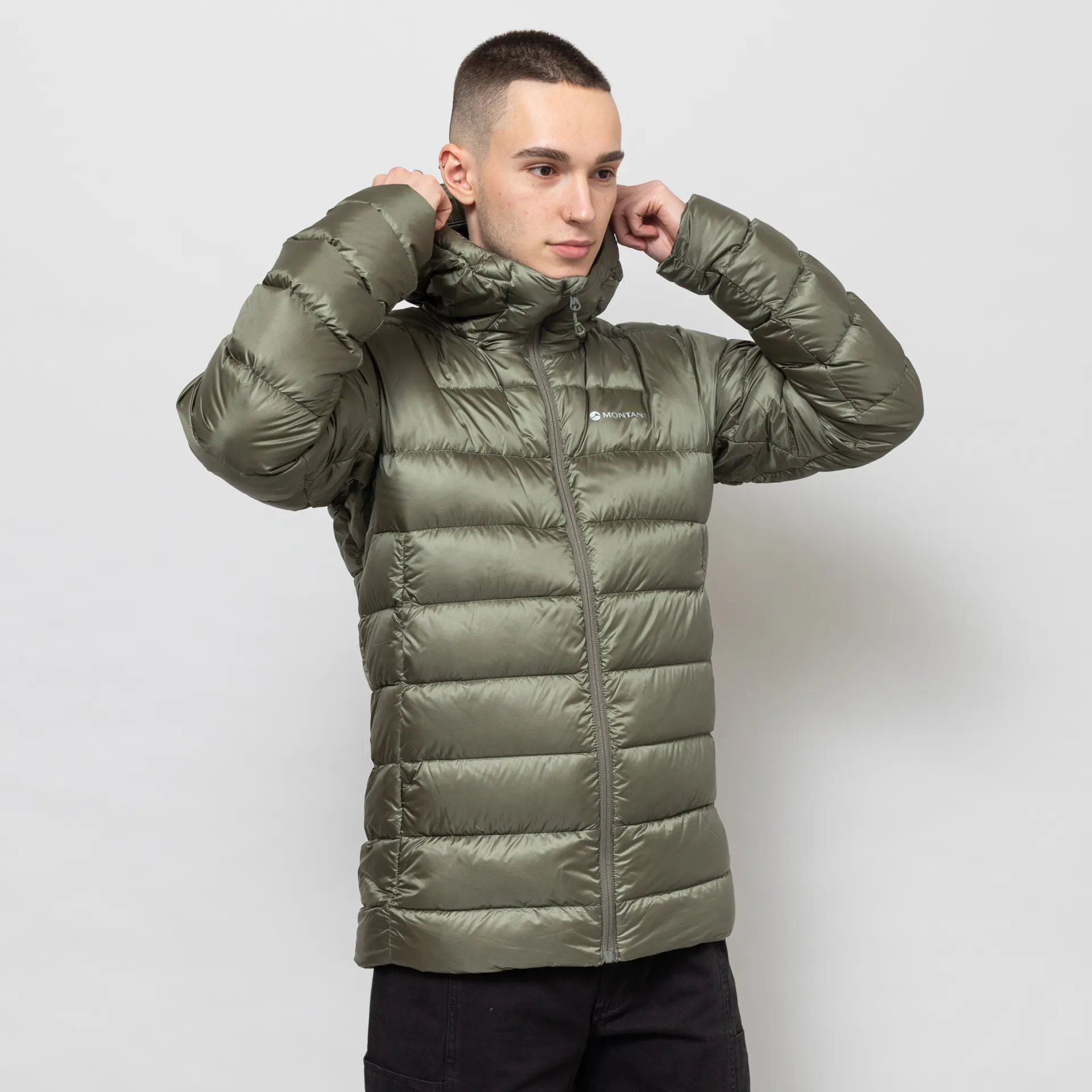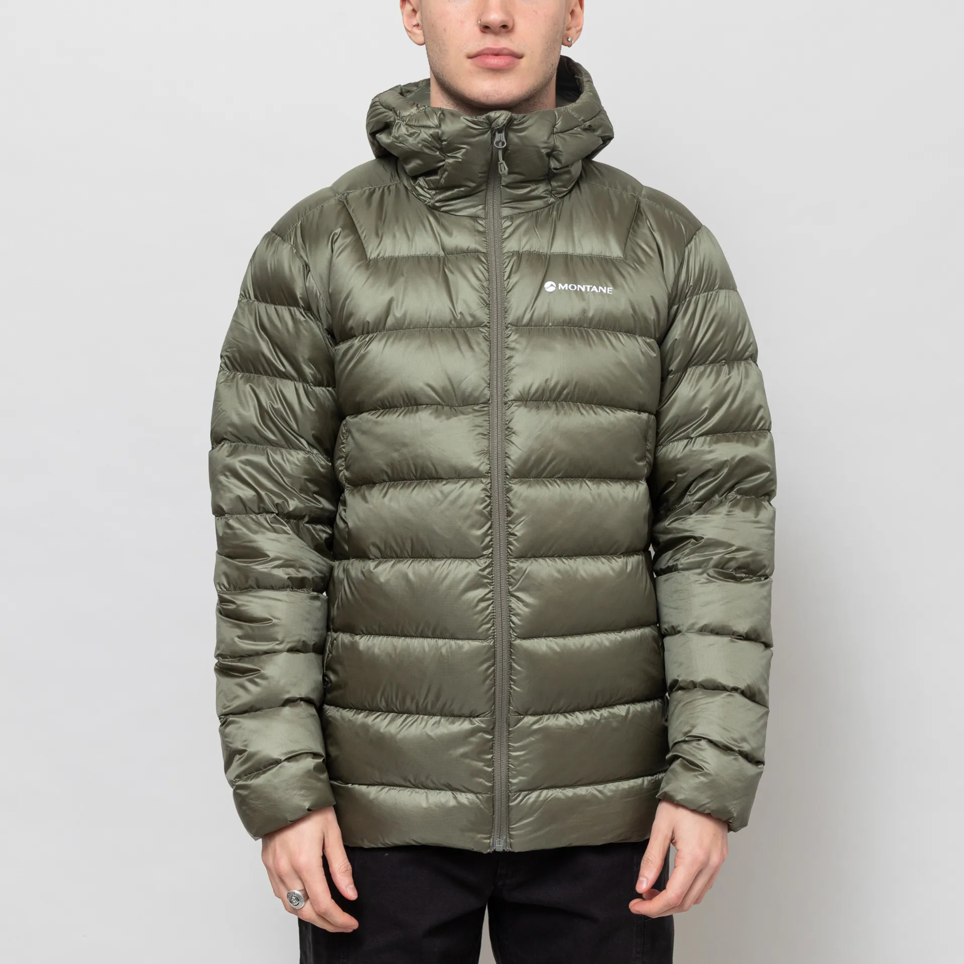 A protective down jacket from Montane, with a combination of Pertex Quantum fabric and high-performance ExpeDRY 800-fill power goose down for a water-repellent finish.