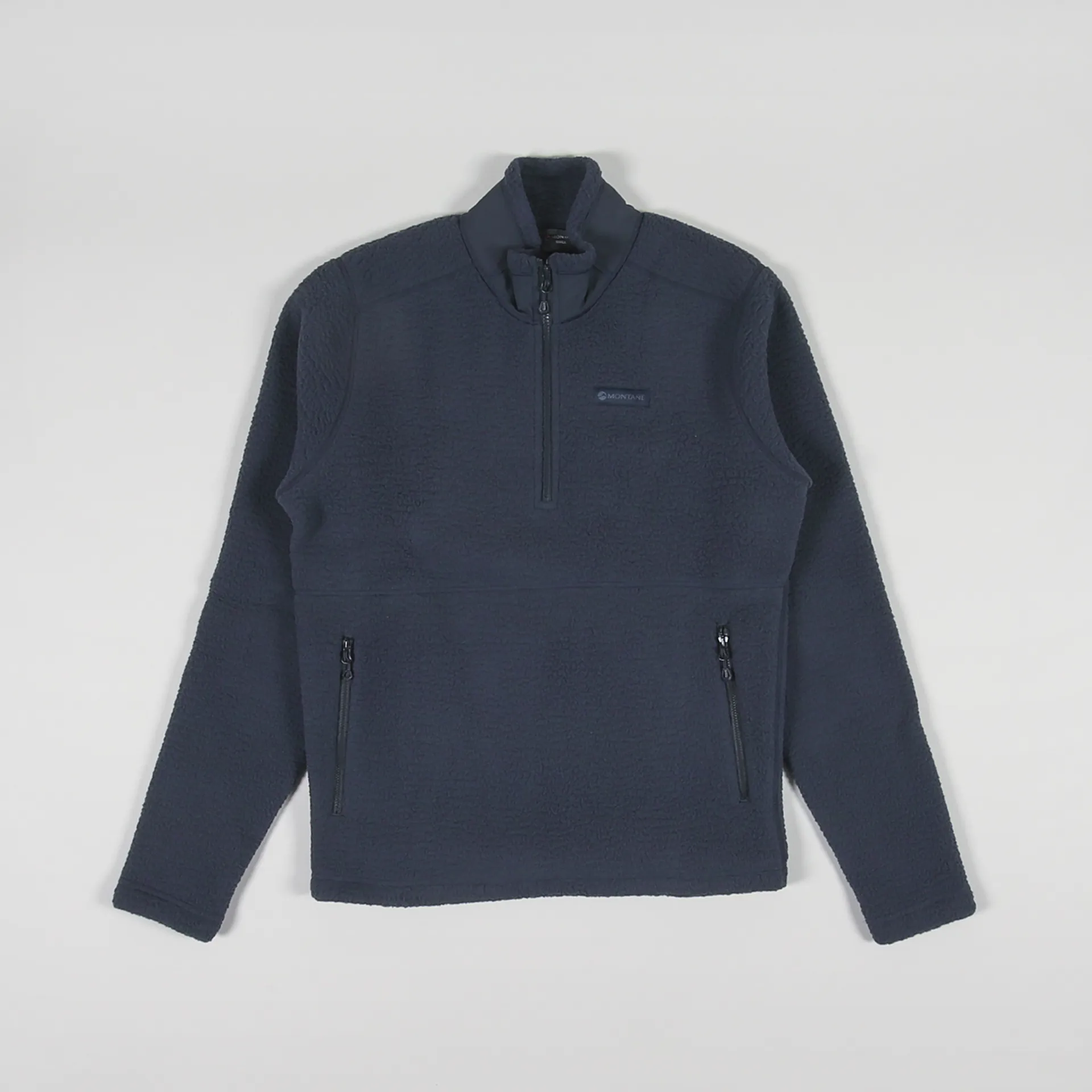 A pullover fleece from Montane made from a brushed sherpa pile of 100% polyester with a nylon overlay to the collar and elbows. It has elasticated cuffs, a half-zip neck and a woven logo patch to the chest.