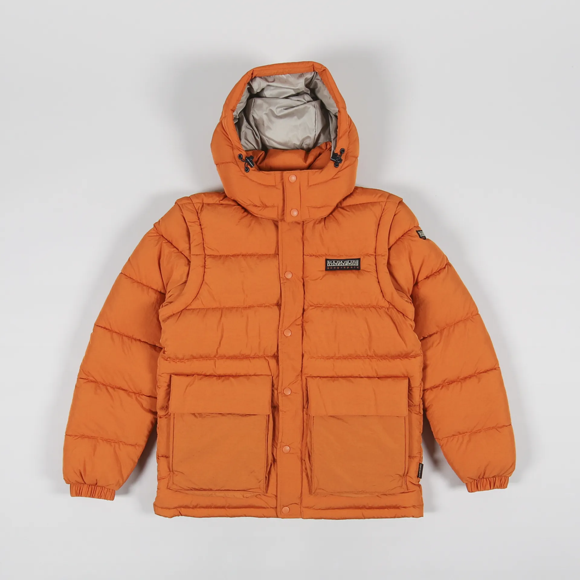 An insulated jacket from Italian outerwear label Napapijri, made from 100% polyamide with a durable ripstop outer, a smooth taffeta lining and a Thermo-Fibre synthetic insulation. It has a customisable fit with zip-off sleeves and a snap-off hood.