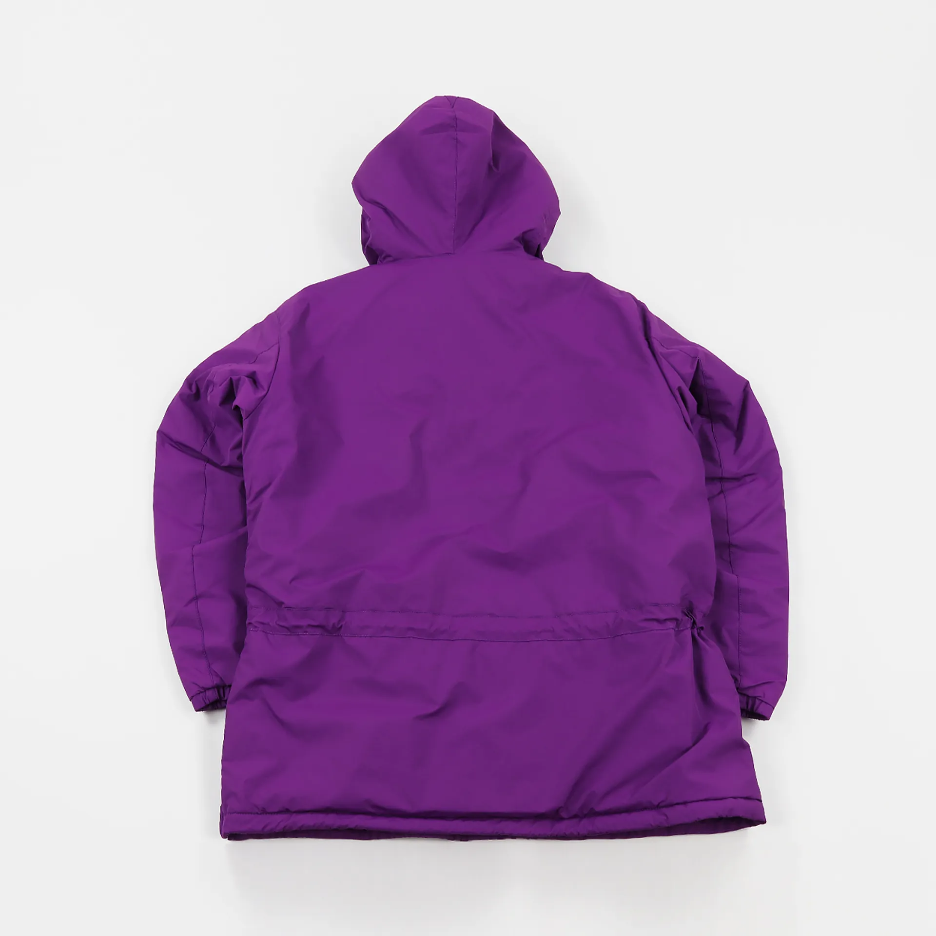 The fit is big and baggy for some retro parka vibes. It has a long, thigh-length design with a drawcord to the waist for a cleaner fit nad the hem and hood also feature drawcords. The cuffs are elasticated and to make throwing the jacket on even easier, it has a large zip to the side. It has two zippered handwarmer pockets and a large pouch to the front.