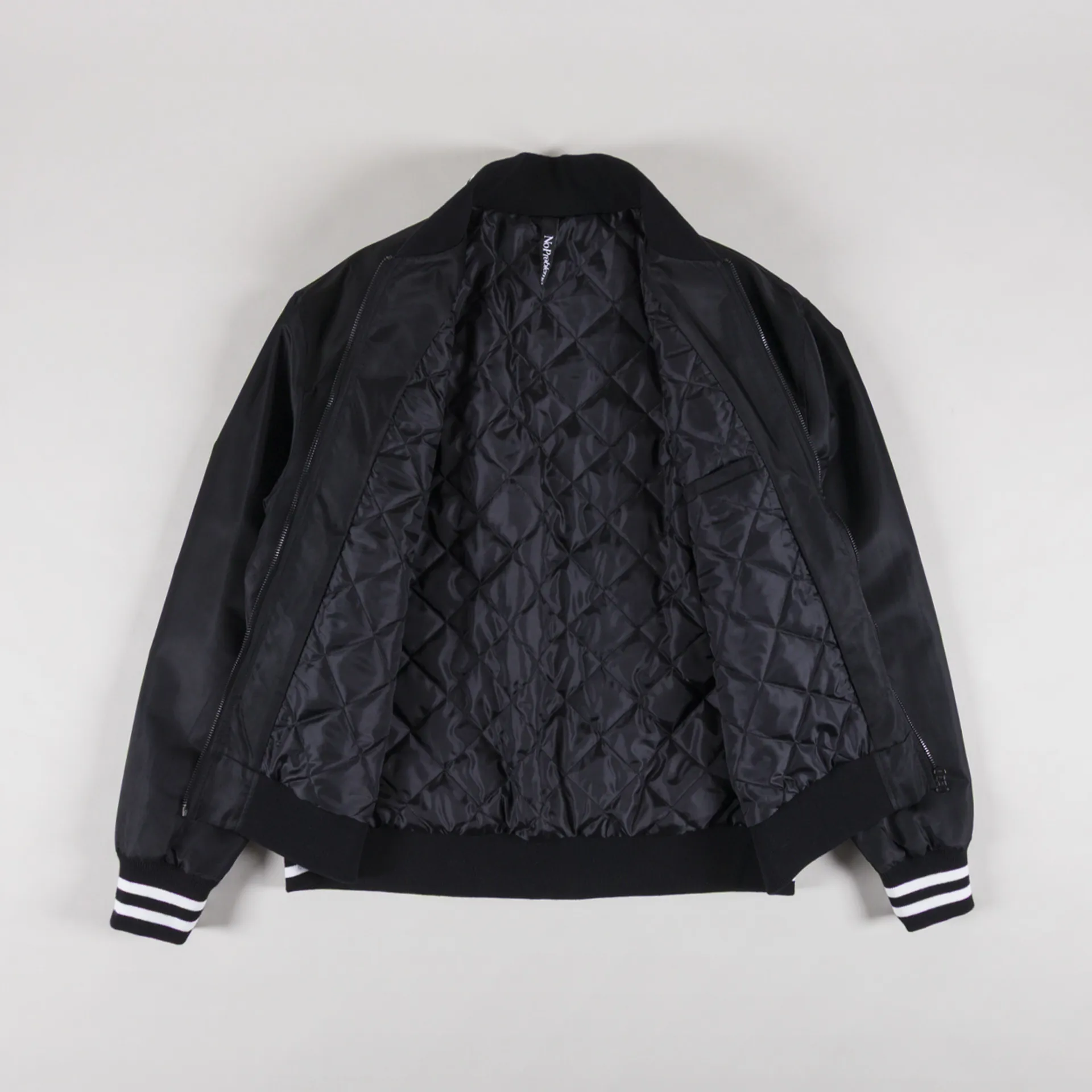 The NYP Nylon Varisty Jacket from No Problemo is cut in a relaxed fit for a casual silhouette, constructed from satin-like nylon with a quilted lining. It features a zip-through front, leading up to a striped, ribbed collar, with the same details at the hem and cuffs, with two pockets to the front and finished with a large NP patch to the chest.
