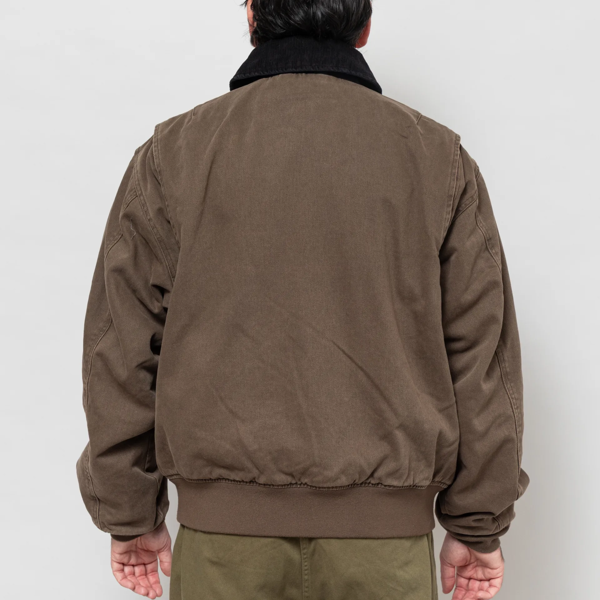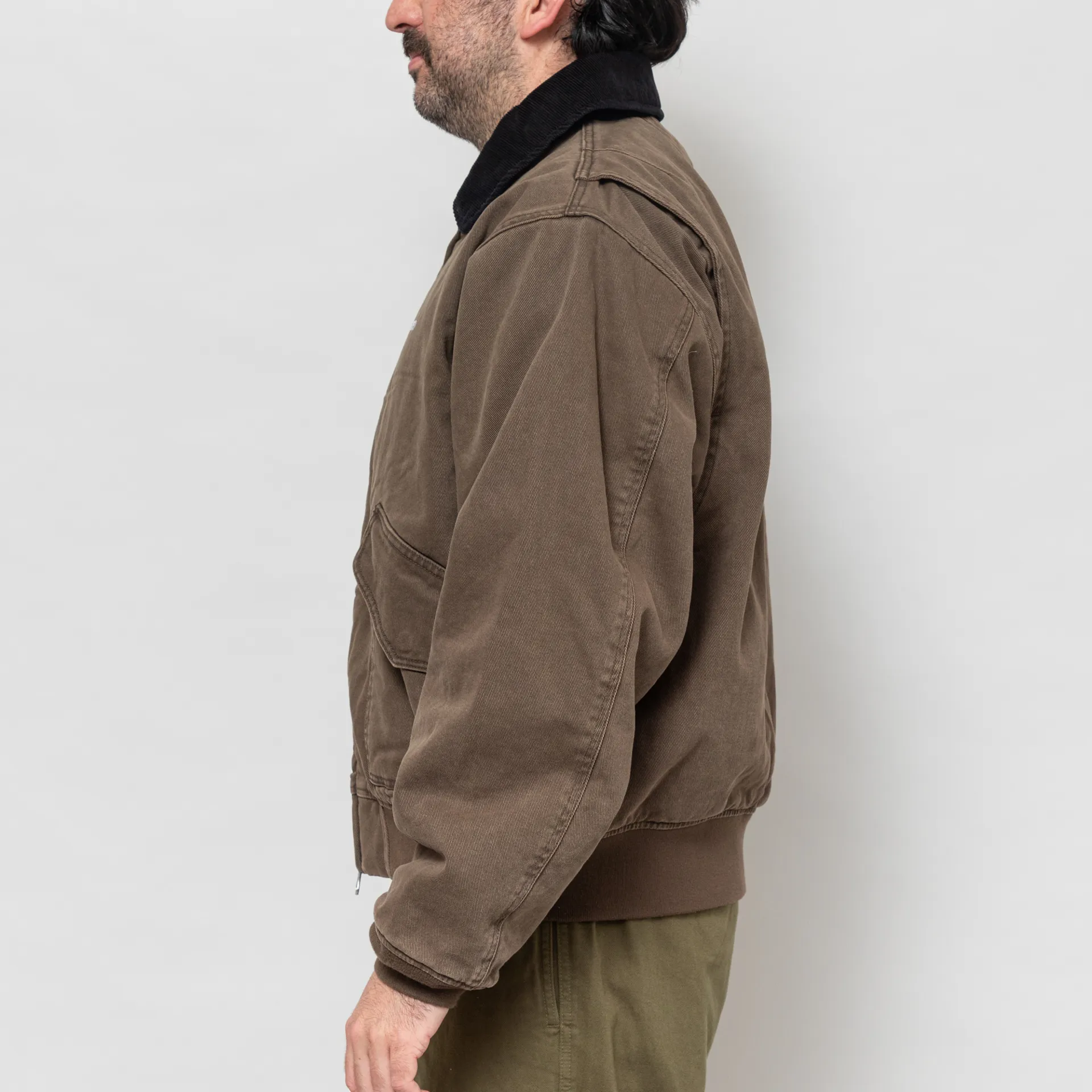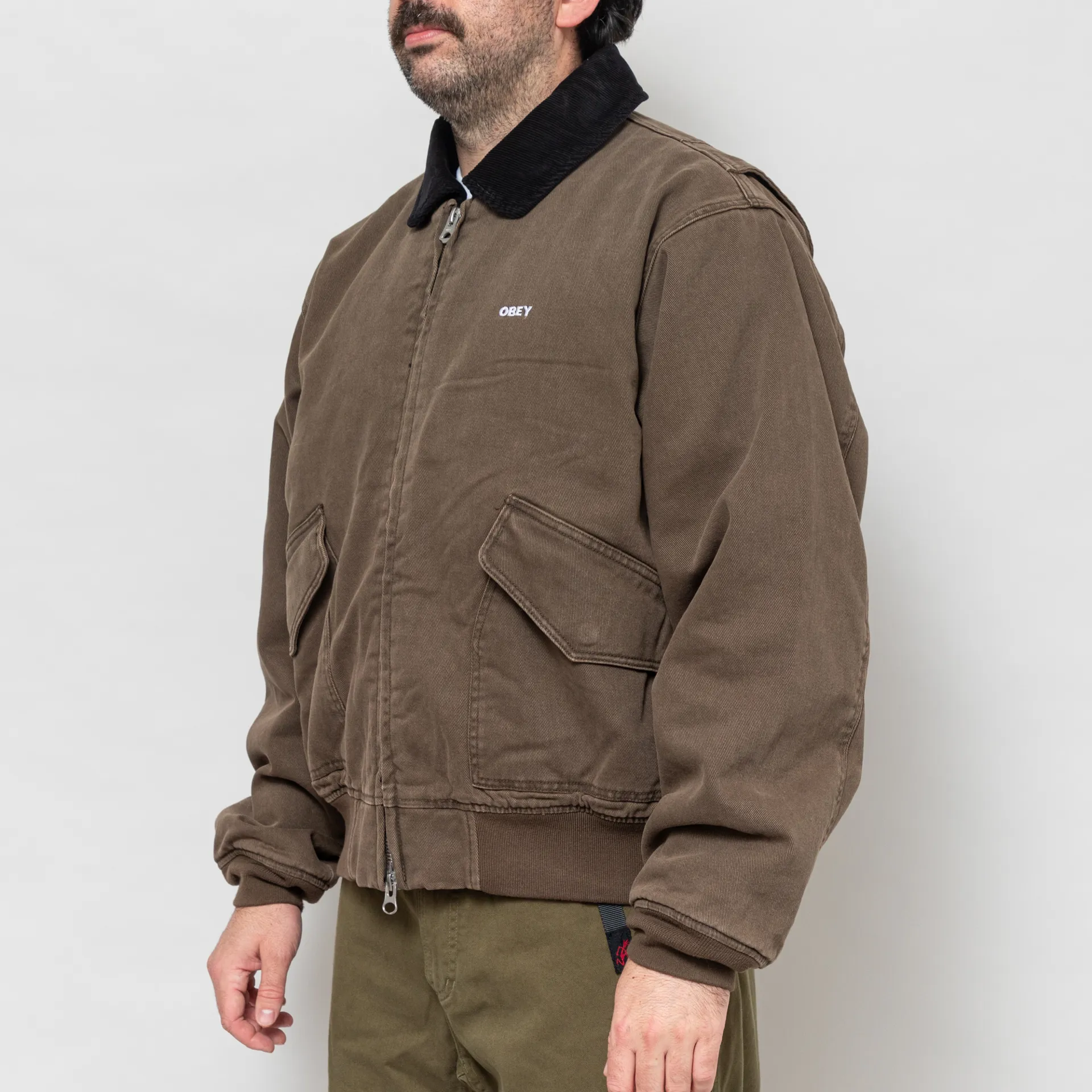 A canvas jacket from Obey, cut in a regular fit for everyday comfort and constructed from 9.5oz 100% cotton that has been garment-washed for a worn in look. It features a zip-through front, leading up to a corduroy collar, with a ribbed hem and cuffs. The body is fully lined with mid insulation for comfort, and has two patch pockets with hidden snap closure to the front. Finished off with two internal chest pockets and a small embroidered Obey logo at the chest.
