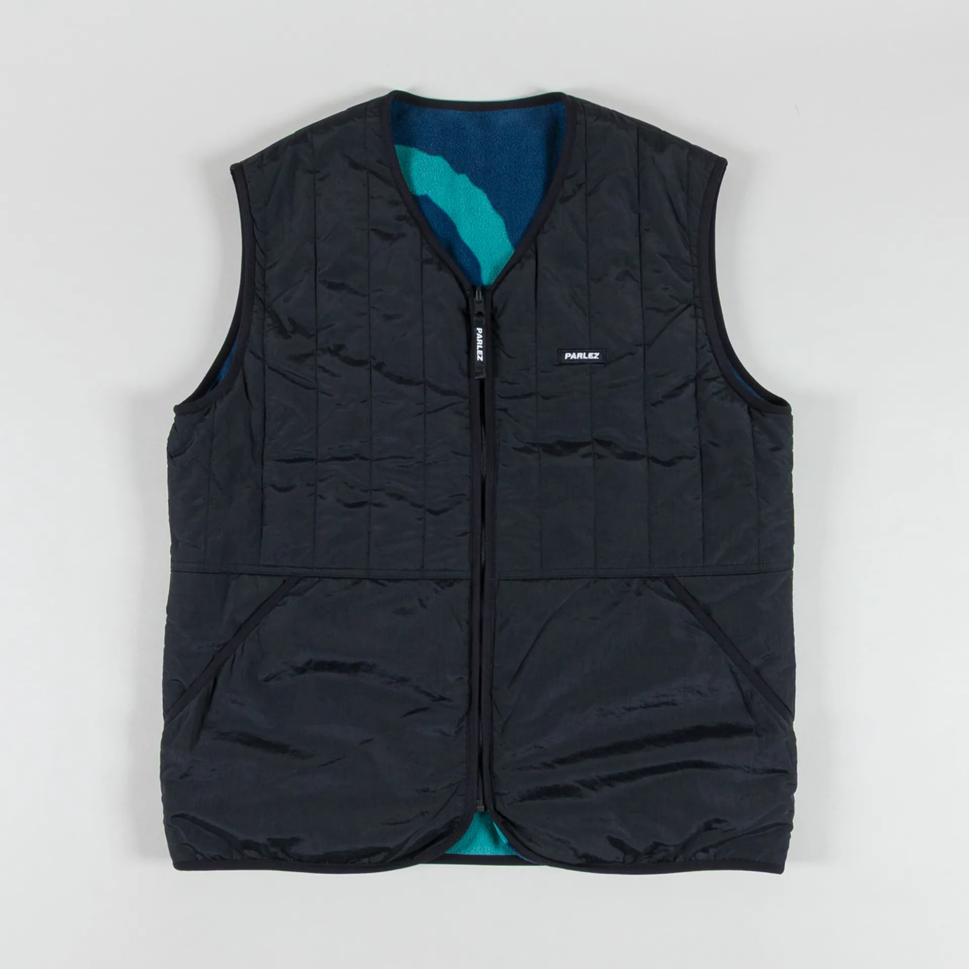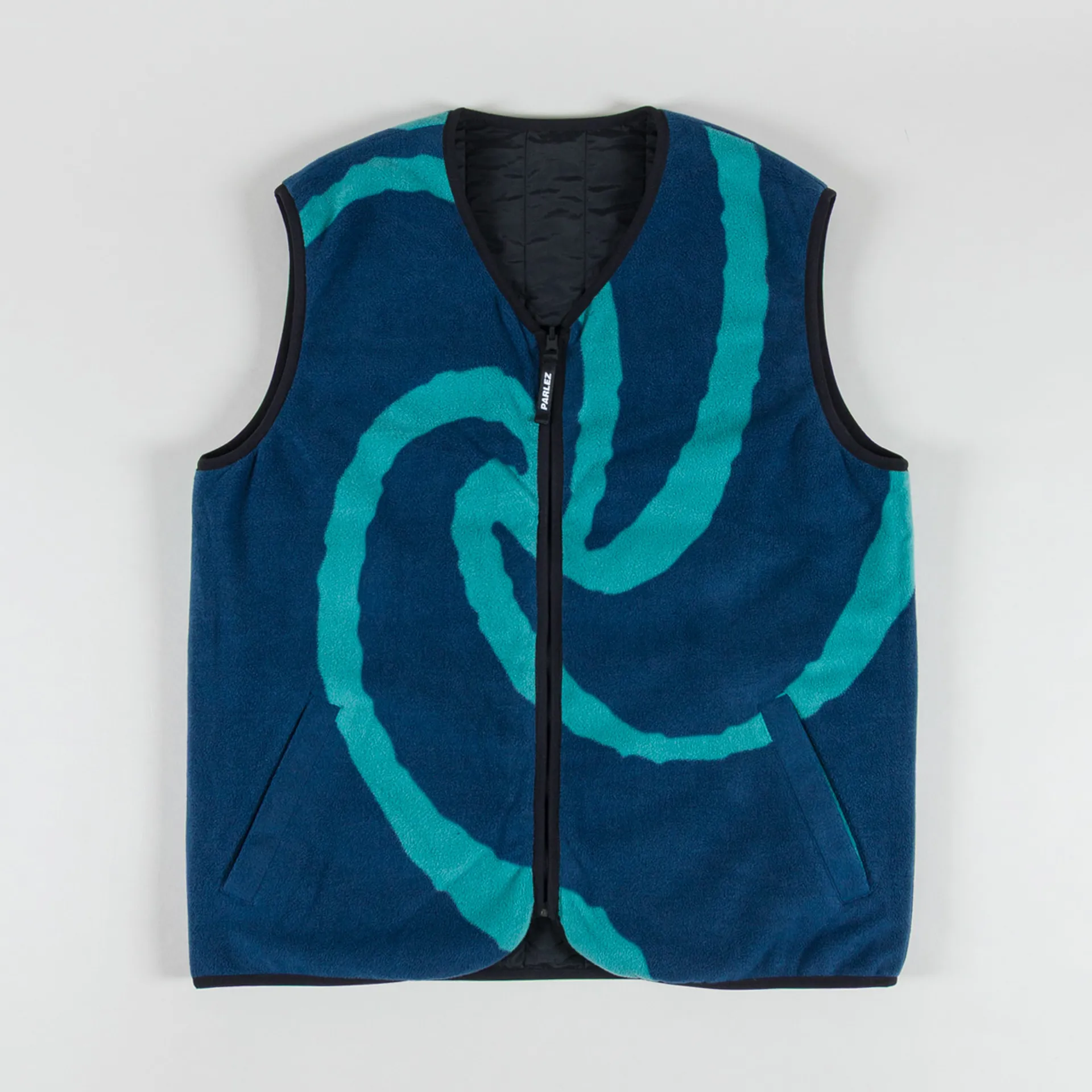 A reversible fleece vest from Parlez, cut in a regular fit for everyday comfort and constructed with a 100% recycled nylon outer and a 100% recycled polyester fleece inner. Both sides feature a zip-through front, leading to a collarless neckline, with black binding on all the trims. You'll find a two-pocket design on either side, a cool swirl print on the fleece side and an embroidered Parlez logo on the nylon side.