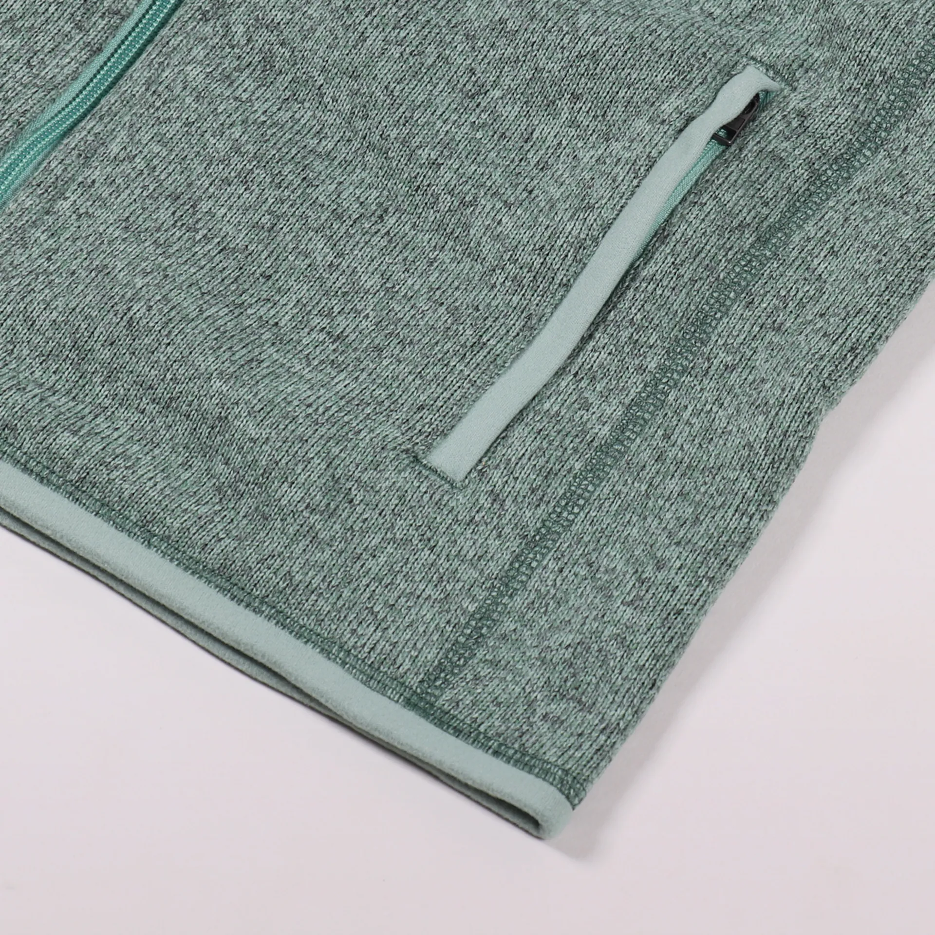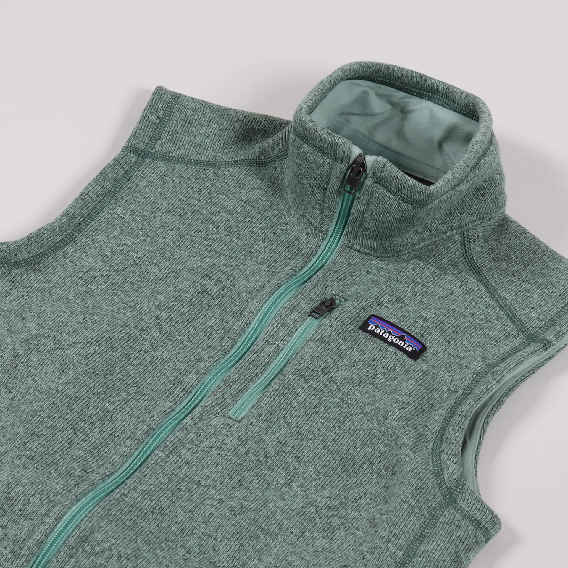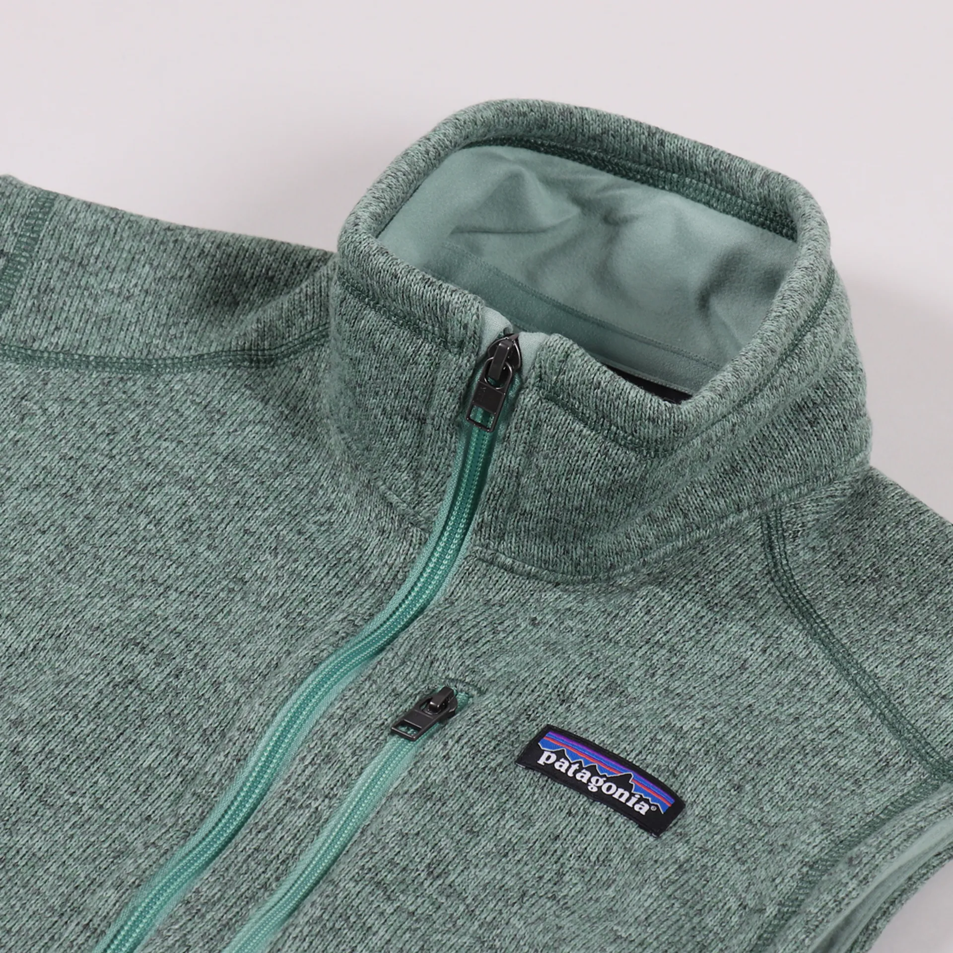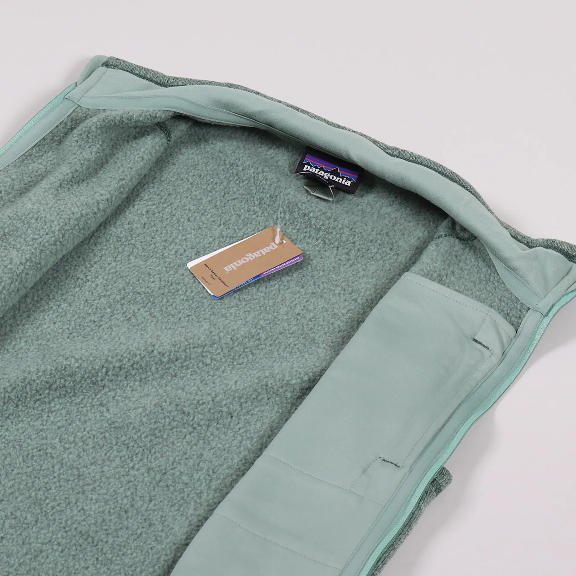 A lightweight gilet from Patagonia made from 100% recycled polyester with a knitted sweater outer and a brushed fleece lining, with a microfleece lining to the collar, arm holes and hem, with two zippered handwarmer pockets.