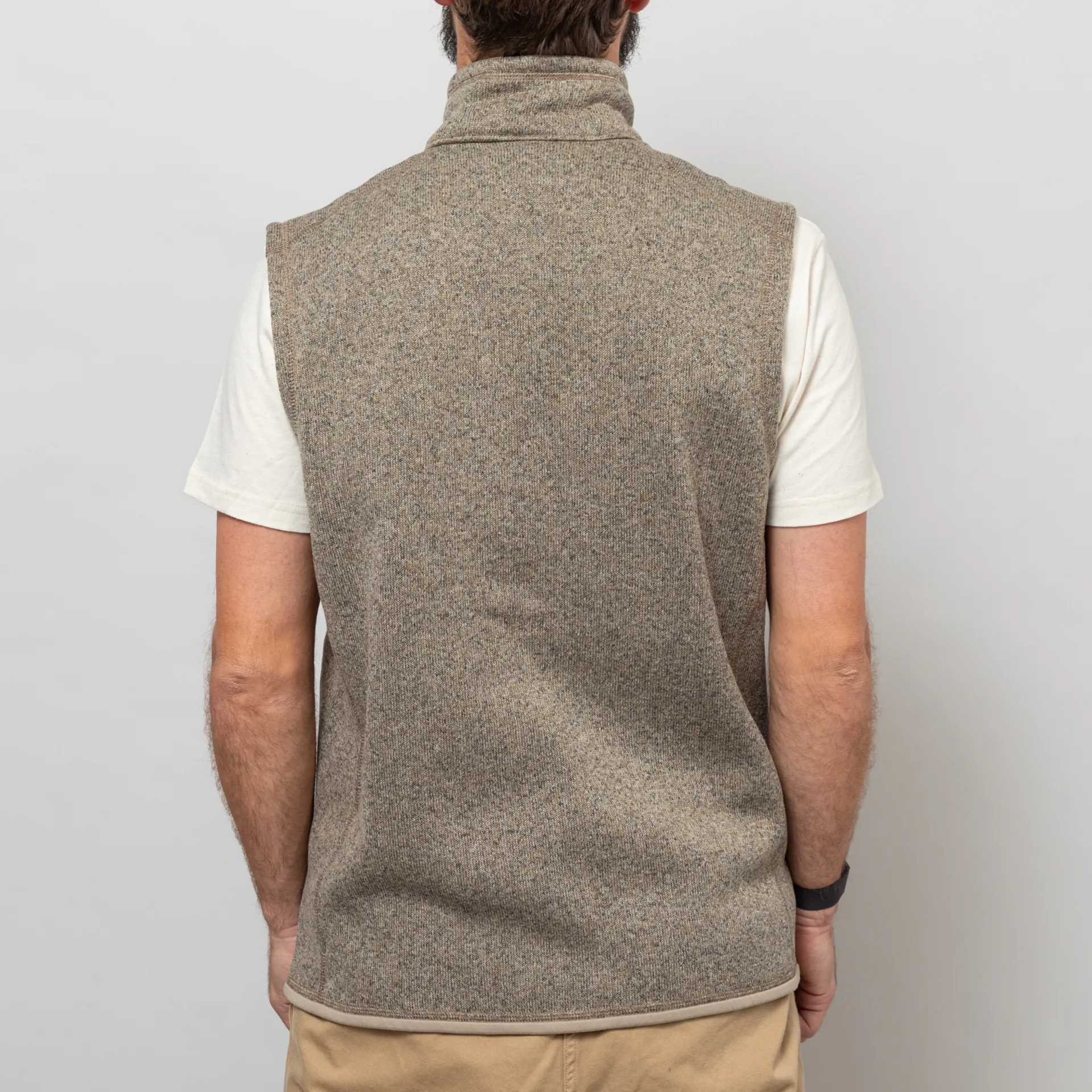 A lightweight gilet from Patagonia made from 100% recycled polyester with a knitted sweater outer and a brushed fleece lining, with a microfleece lining to the collar, arm holes and hem, with two zippered handwarmer pockets.