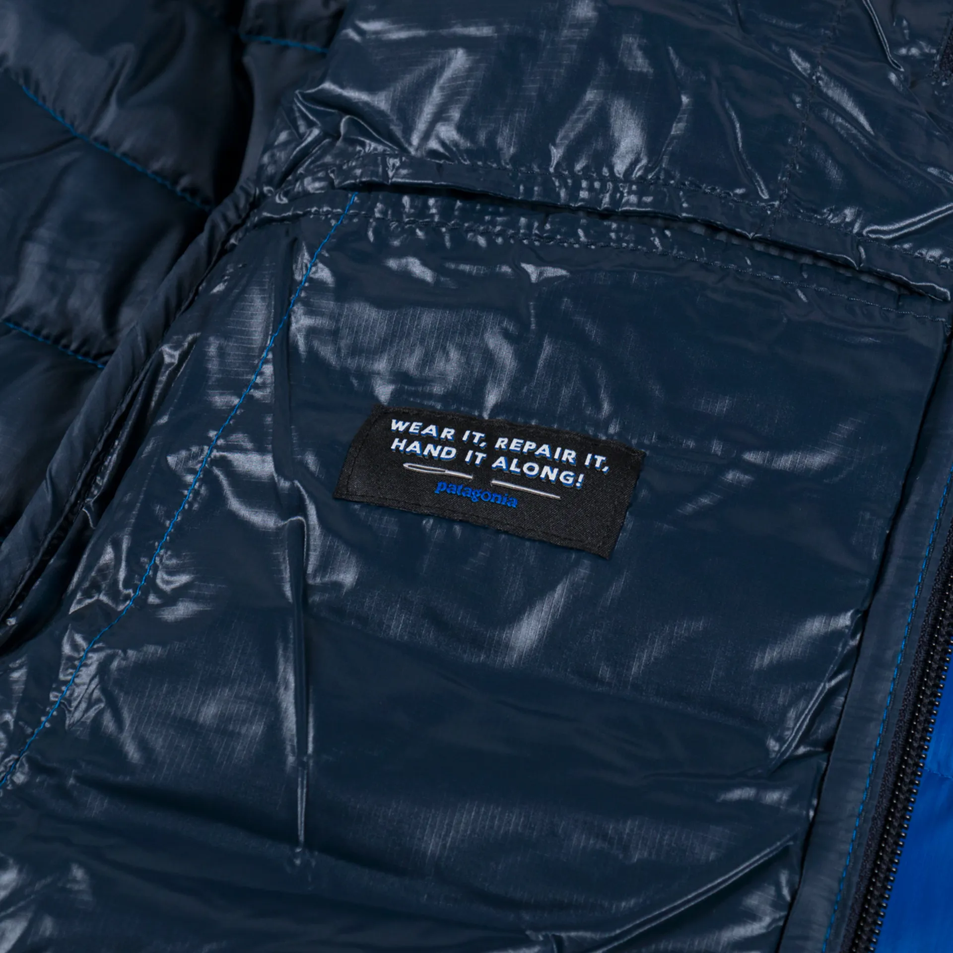 An updated version of Patagonia's Down Sweater Hoody, made from 100% recycled nylon ripstop from their NetPlus project, making use of fishing nets which have been reclaimed from the ocean.