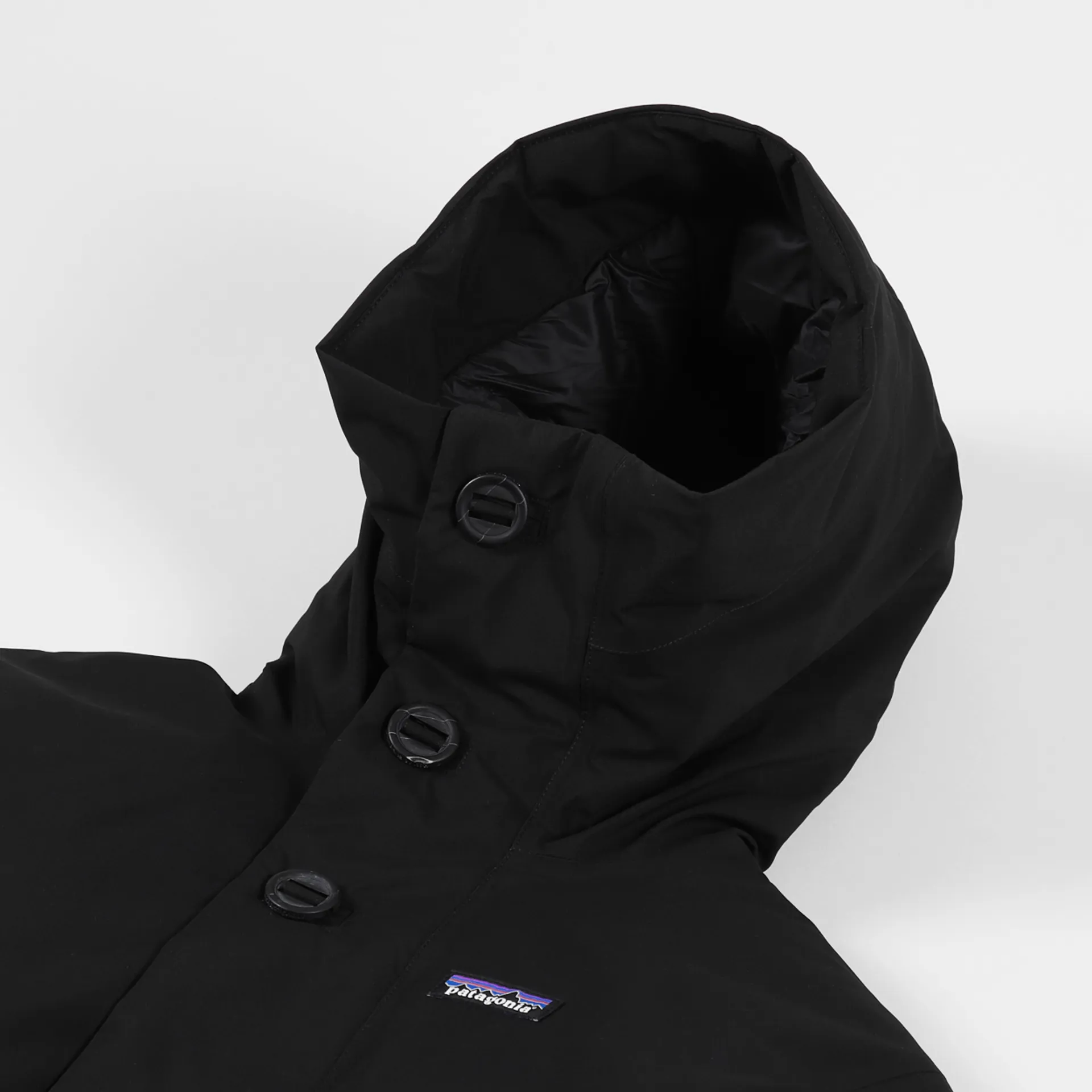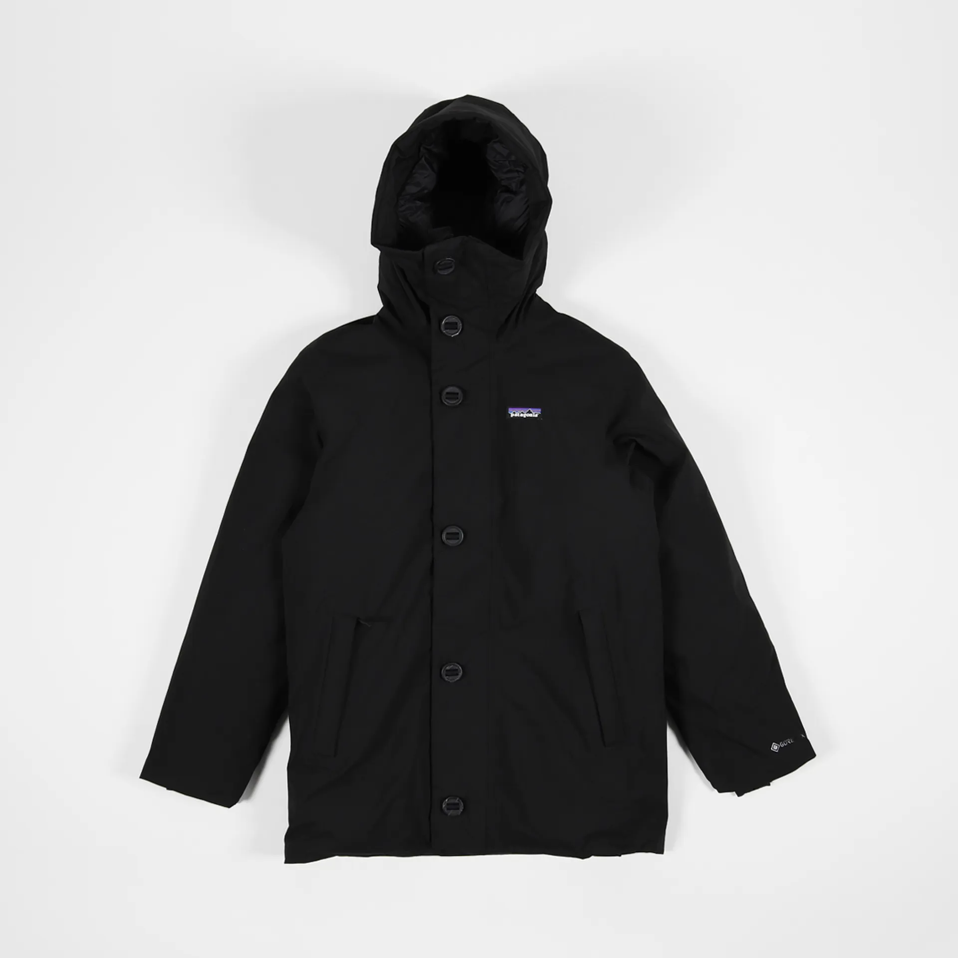 A parka jacket from Patagonia made from a recycled GORE-TEX shell with a recycled down insulation and a large button-up stormflap for full coverage.