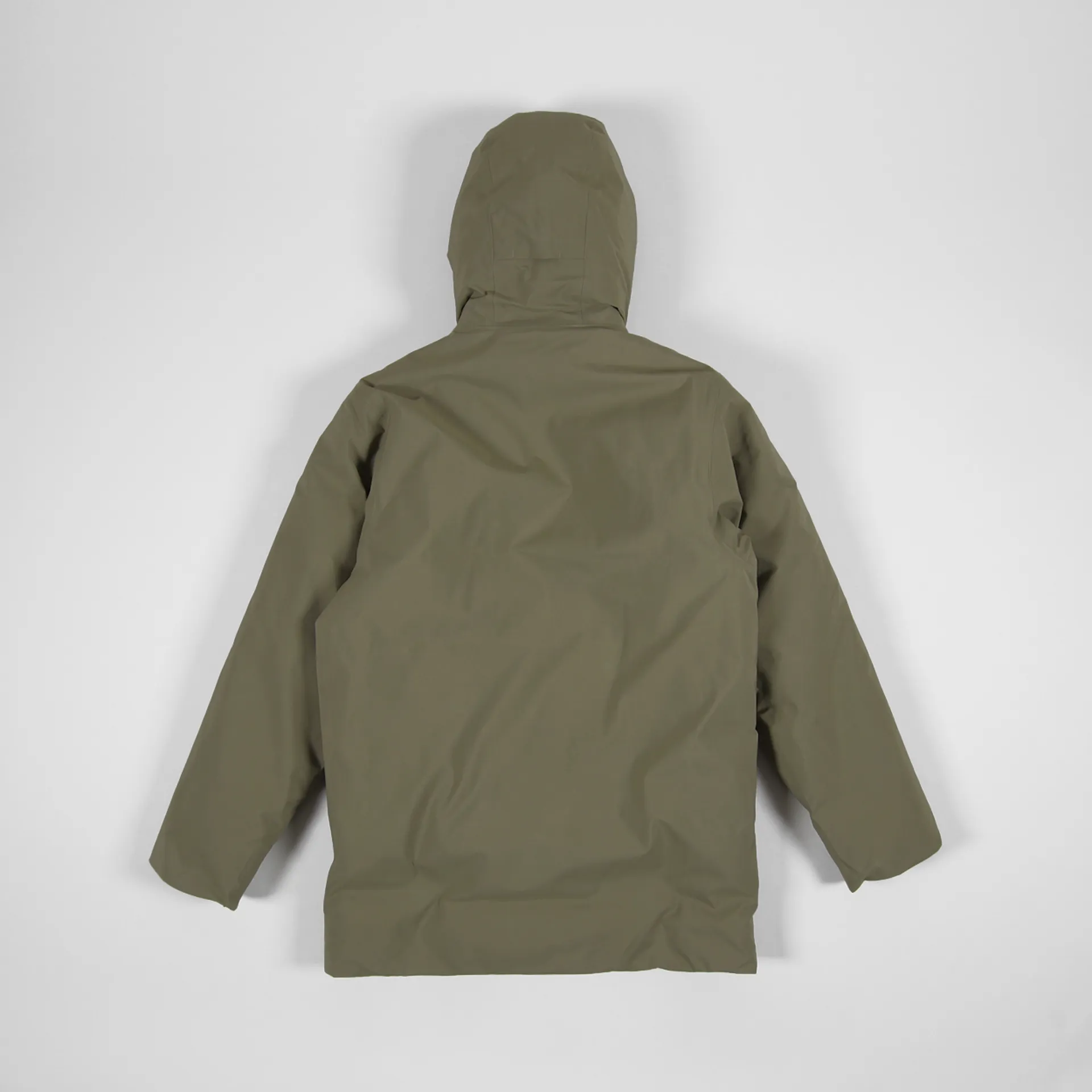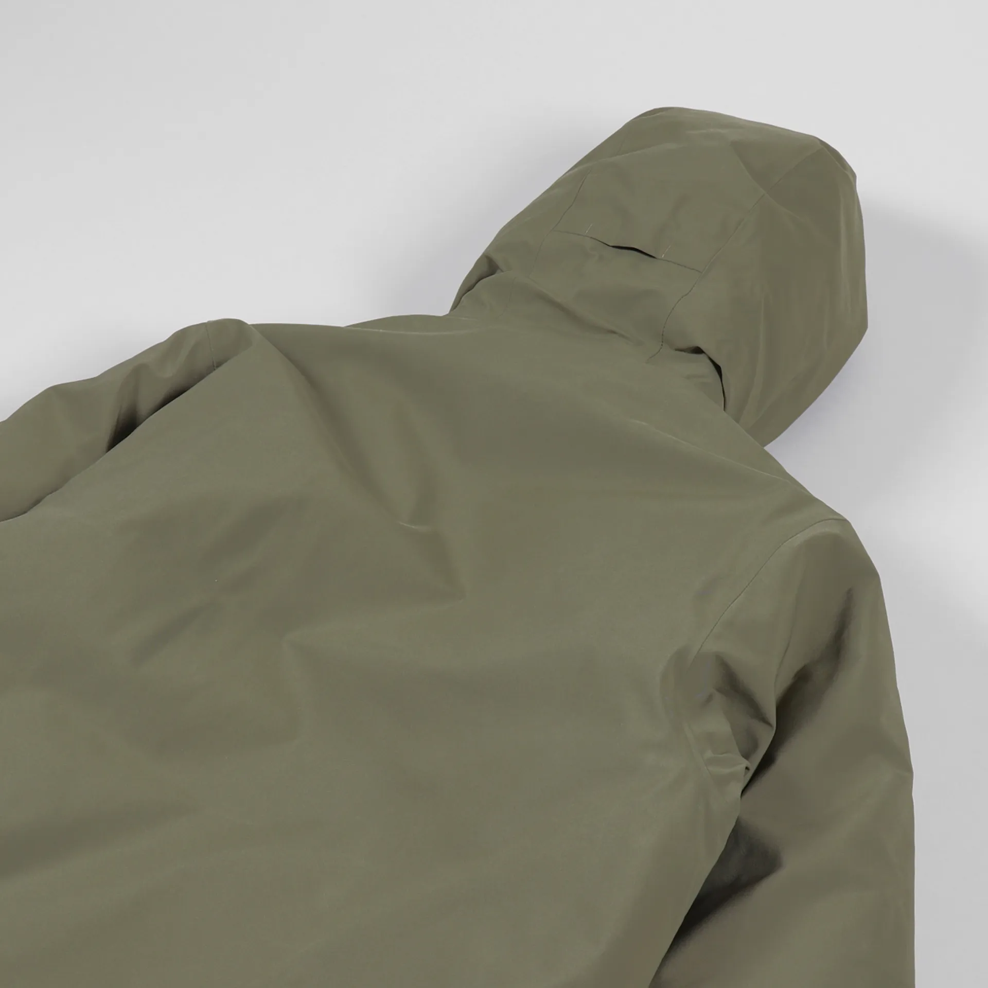 The shell is made from a super durable and completely wind and water resistant weave of GORE-TEX which is made from 100% recycled polyester. The two layer fabric is lined with a smooth and comfortable 100% recycled polyester ripstop which has been treated with a DWR (durable water repellent) finish and the insulation is made from 100% recycled down (blend of goose and duck) taken from reclaimed down products. The 700-fill-power insulation is locked in with ribbed cuffs and a two-way full-zip front with a large button-up stormflap.