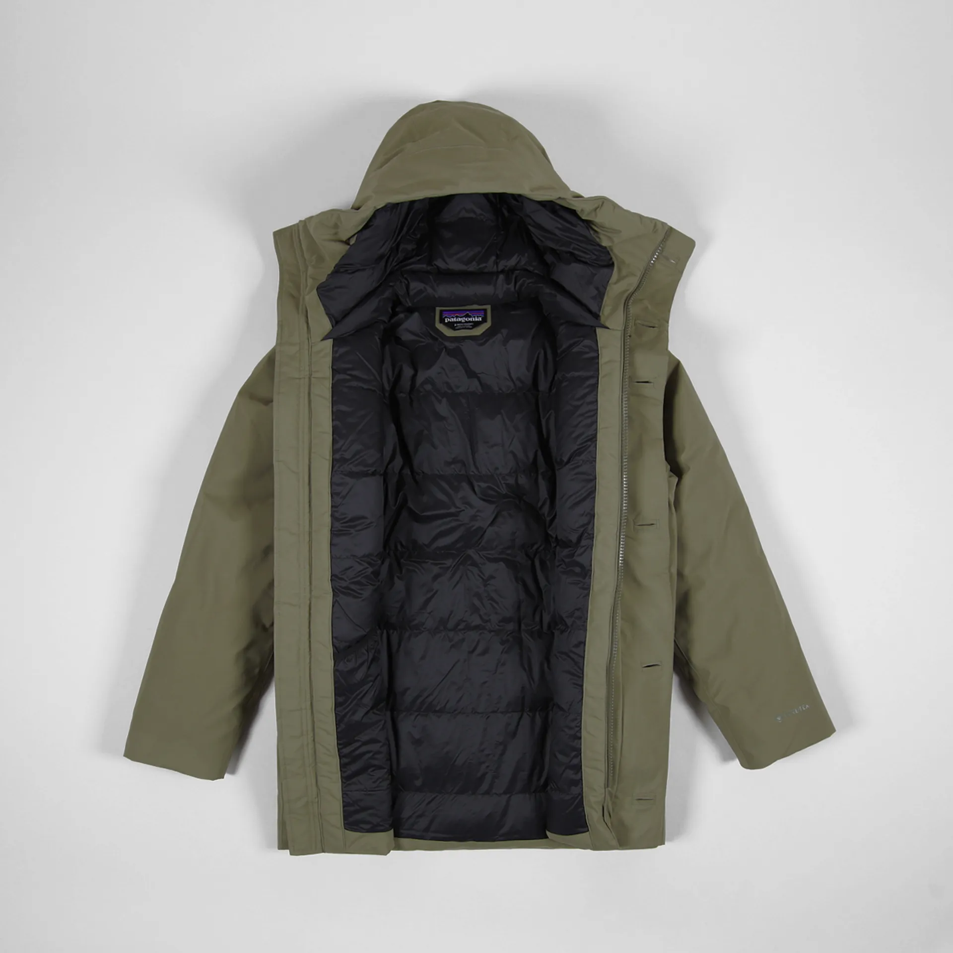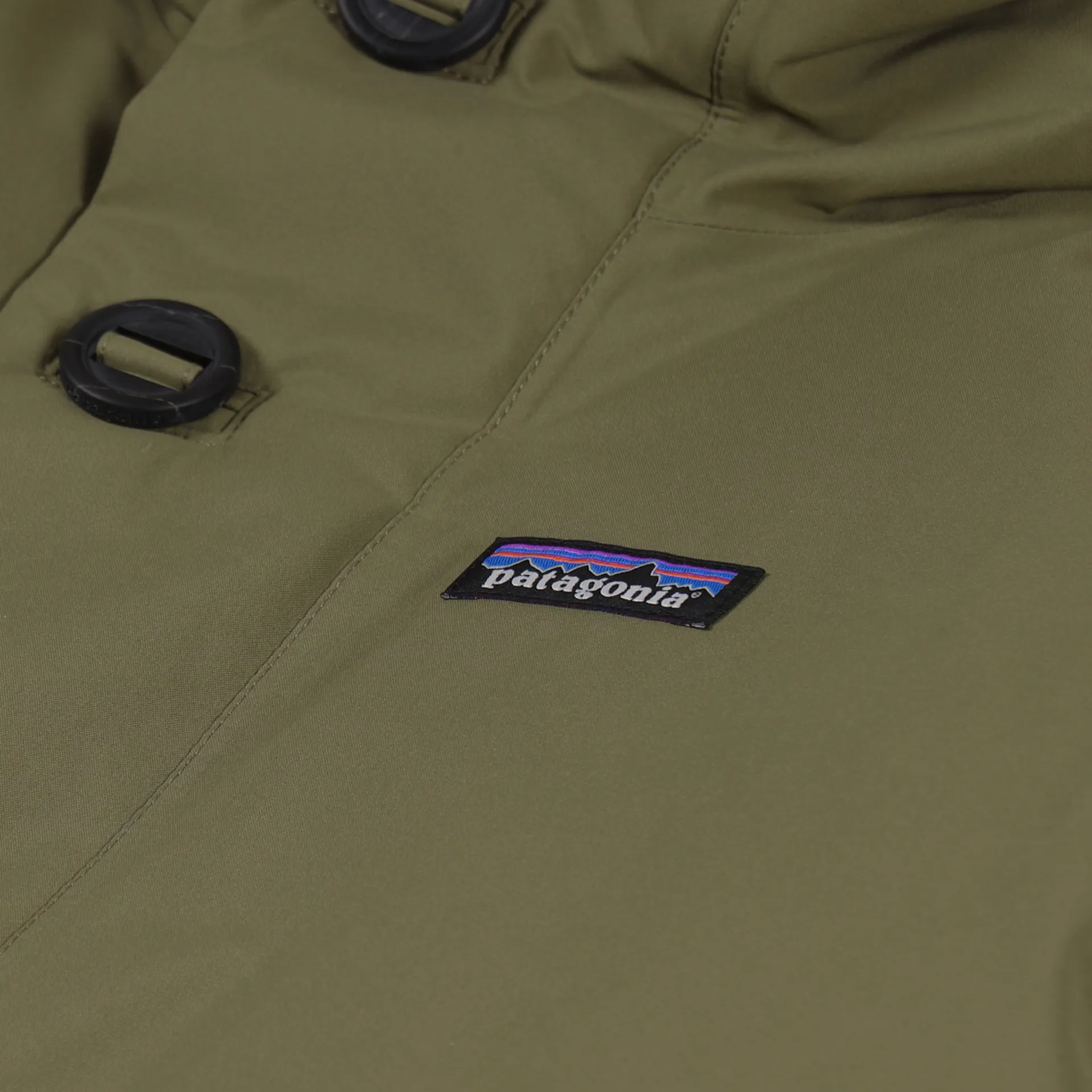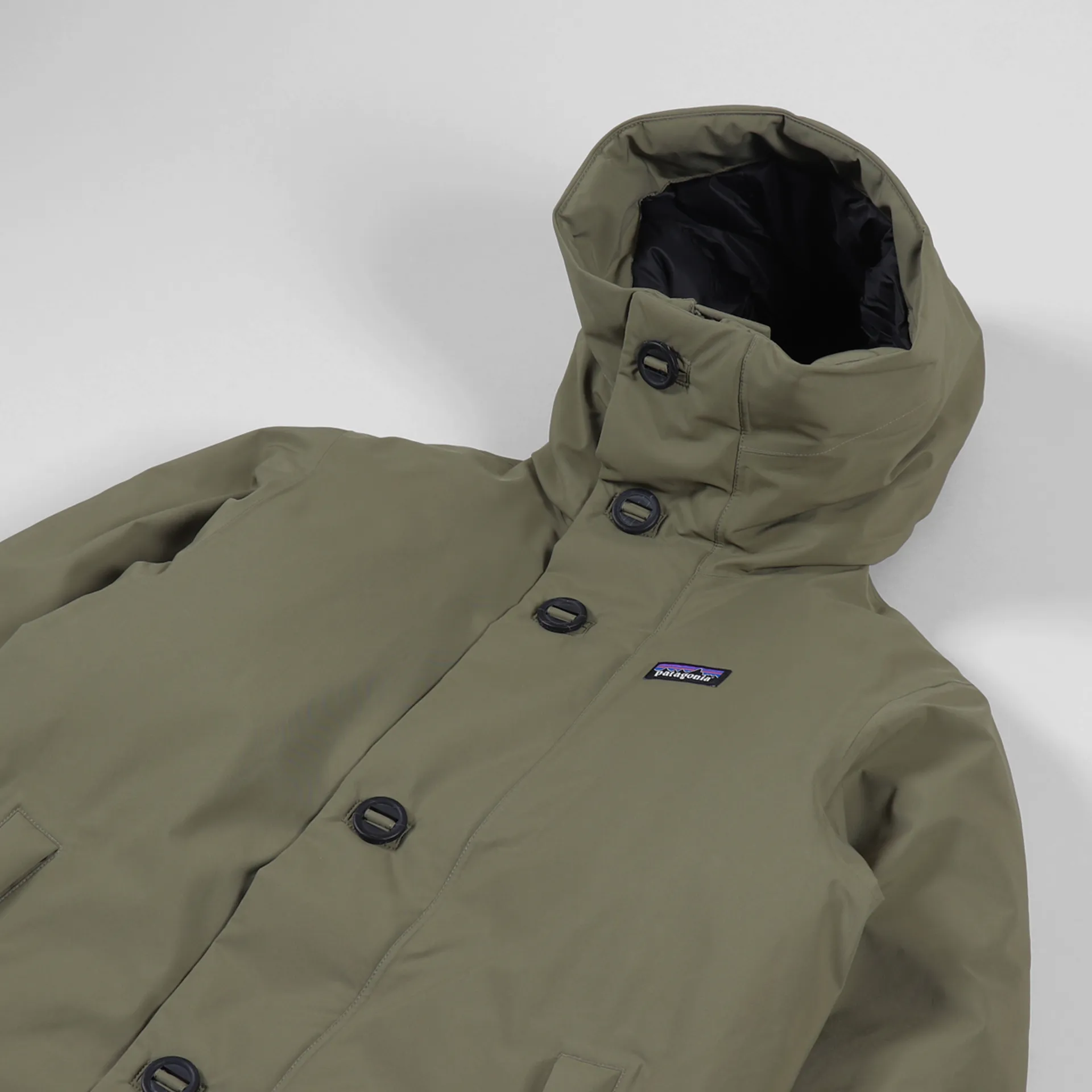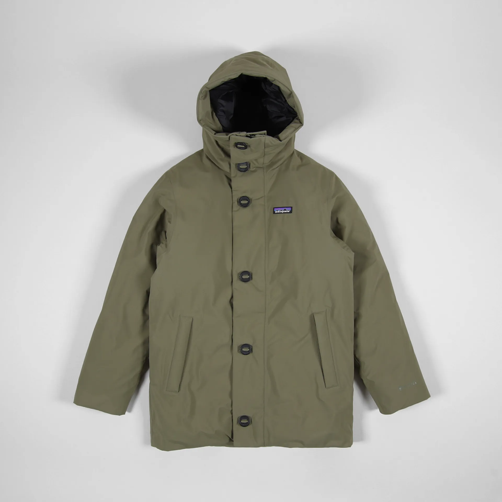 A parka jacket from Patagonia made from a recycled GORE-TEX shell with a recycled down insulation and a large button-up stormflap for full coverage.