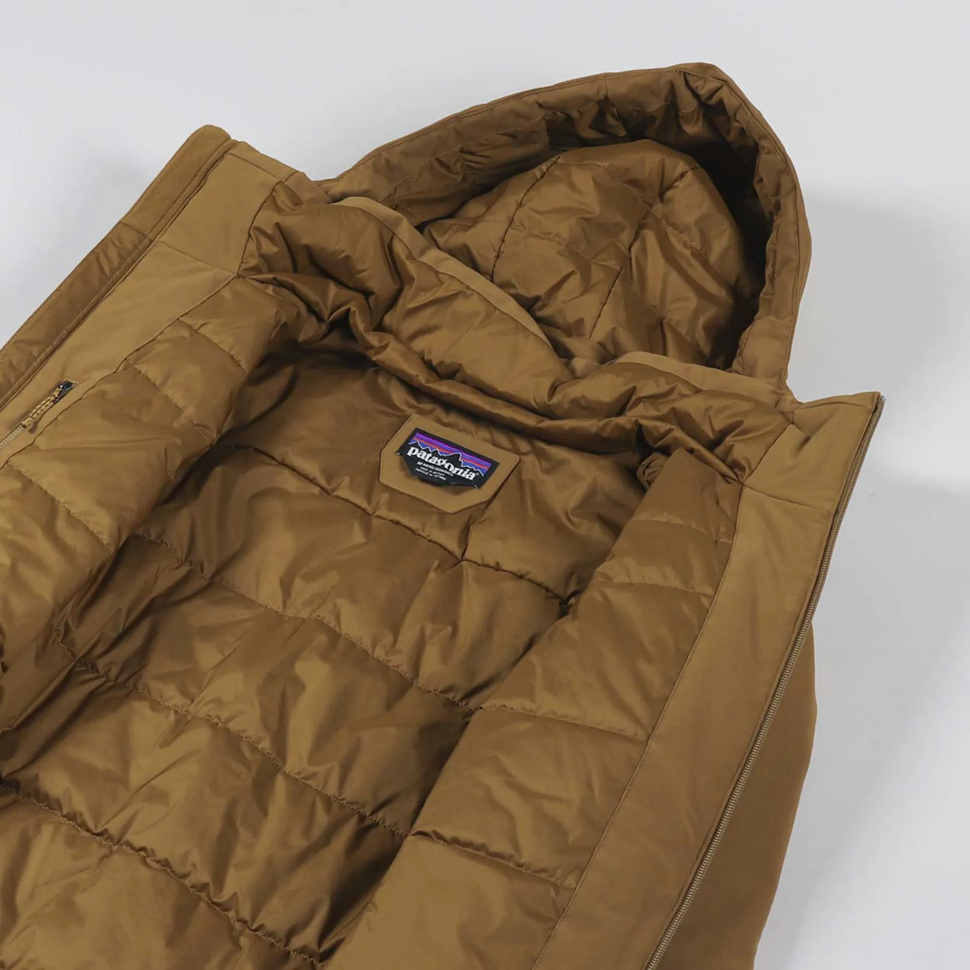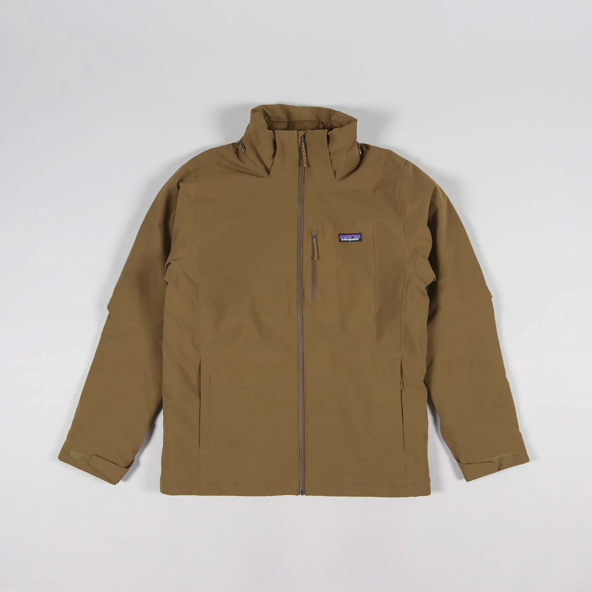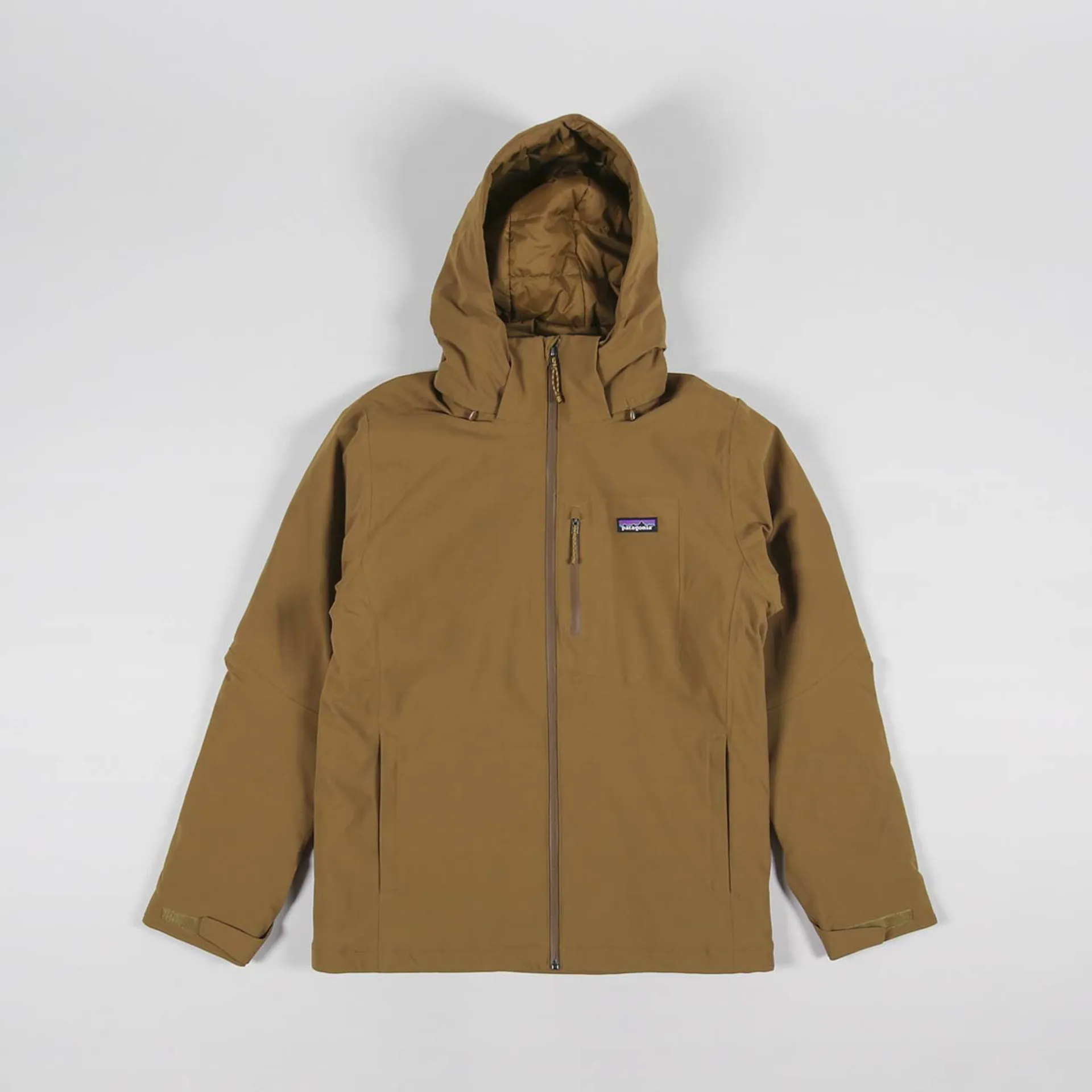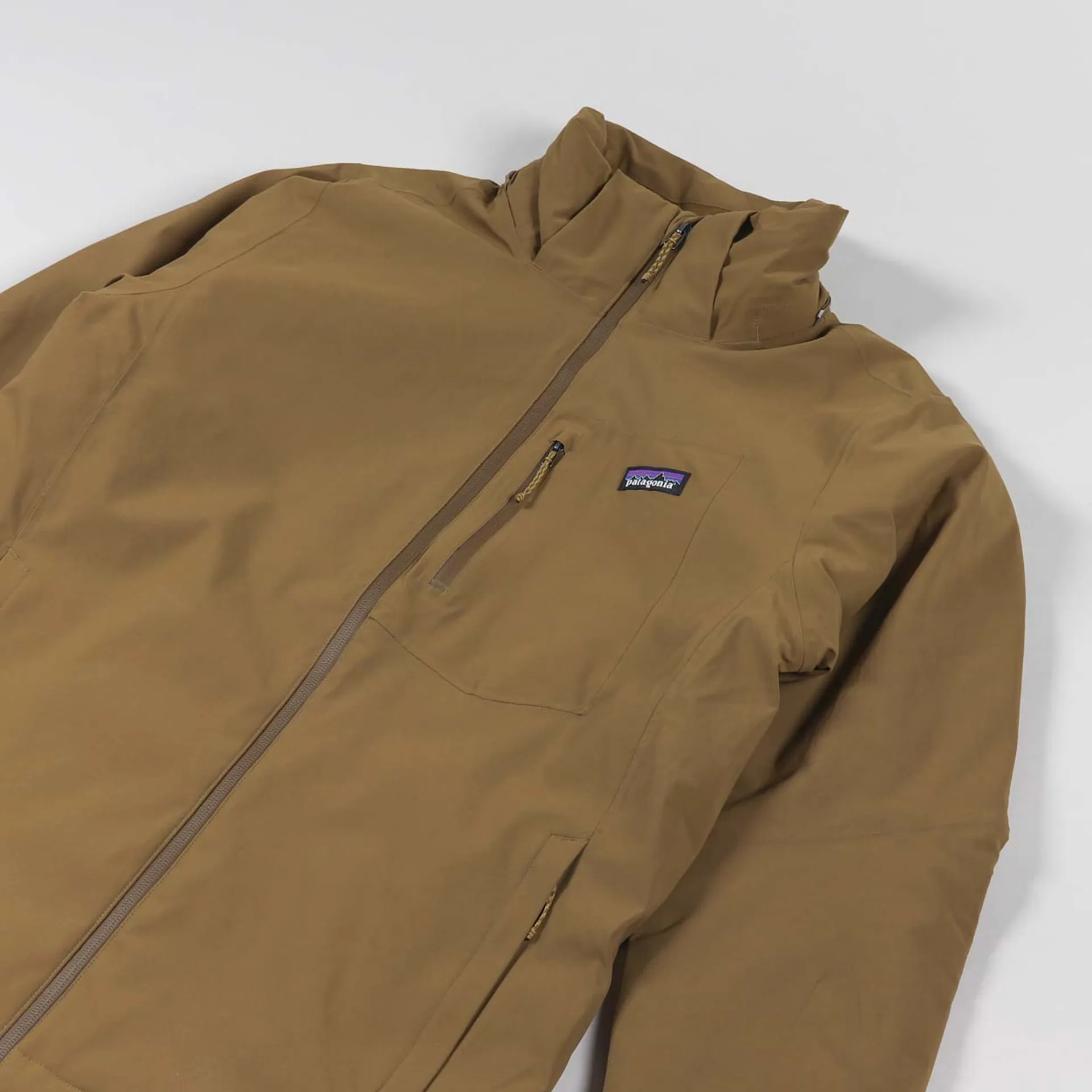 An insulated winter jacket from Patagonia, made from a H2No Performance Standard 2-layer shell of 95% nylon (65% recycled) and 5% elastane plainweave with a waterproof/breathable barrier and a DWR finish.
