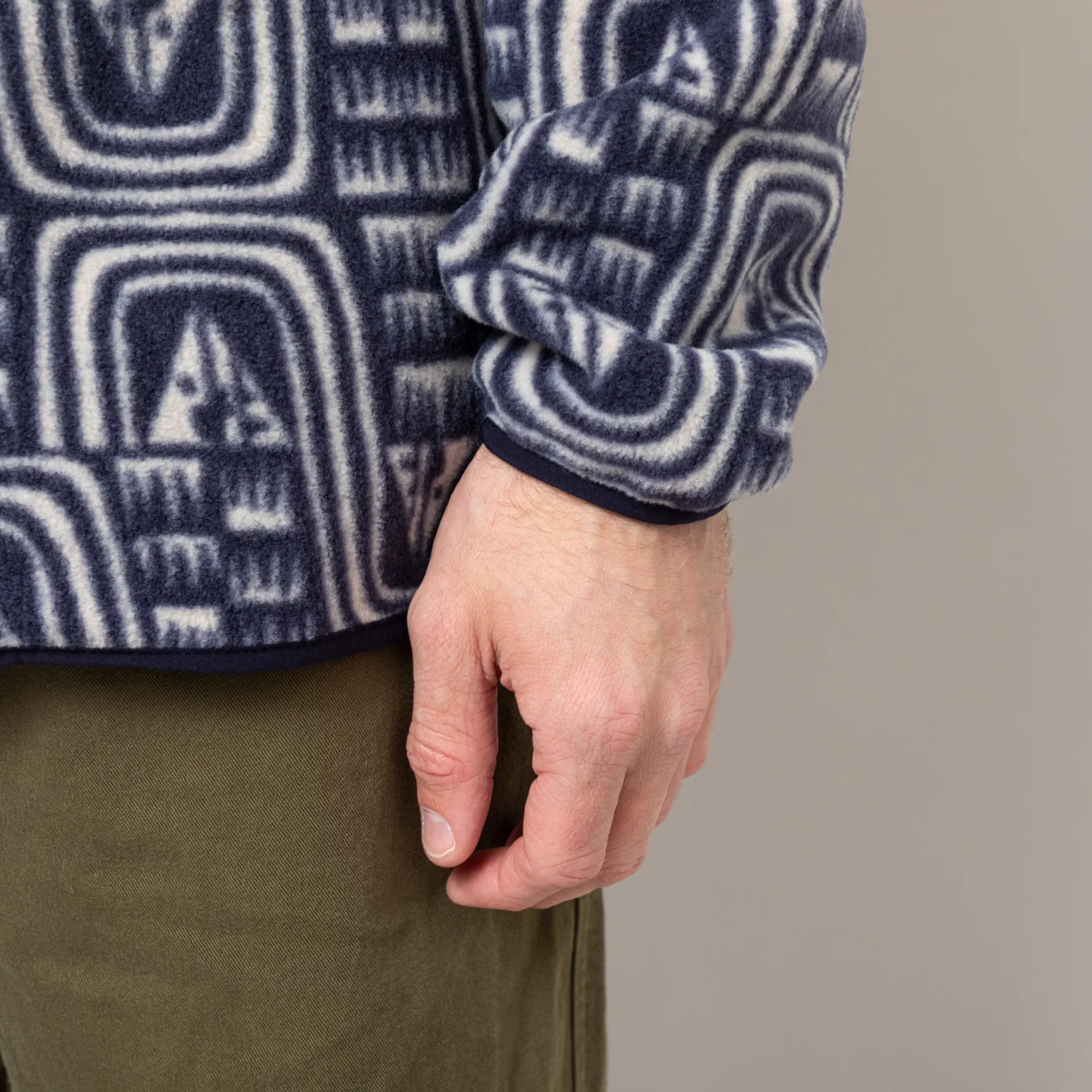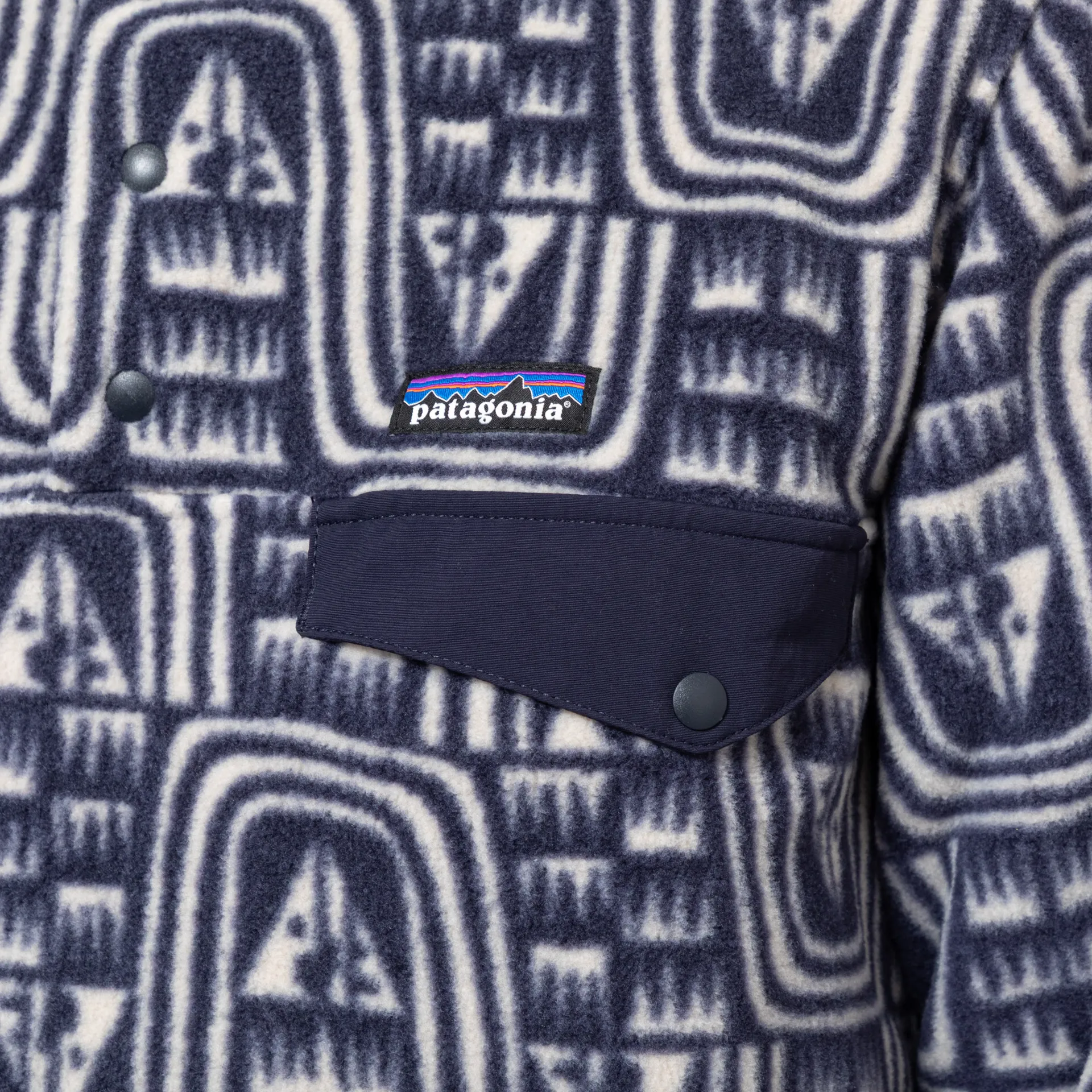 A fleece jacket from Patagonia made from 100% recycled polyester, with an elasticated trim, snap-up neckline and a snap-up chest pocket, with a woven logo patch.
